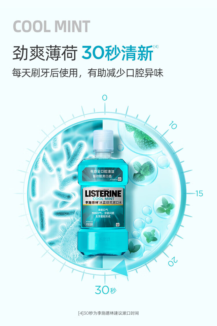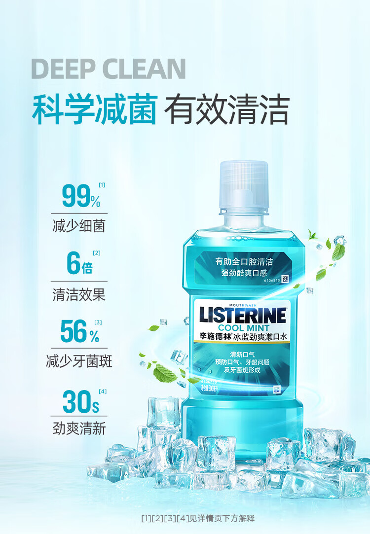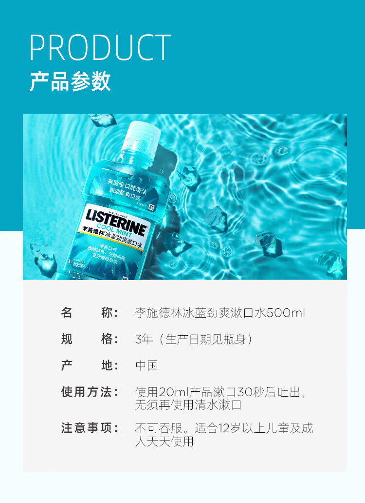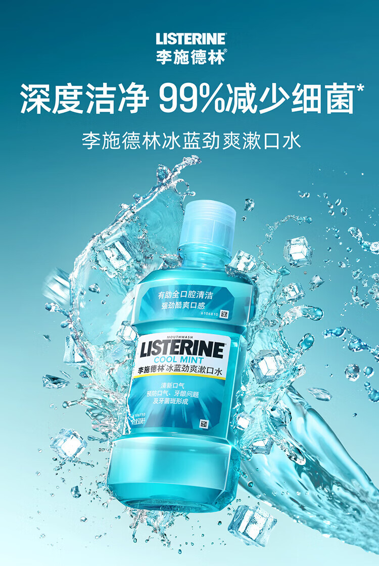 李施德林精油漱口水冰蓝劲爽口味清新气异味清洁含酒精减少口腔细菌 冰蓝劲爽500ml*3瓶【店长推荐】