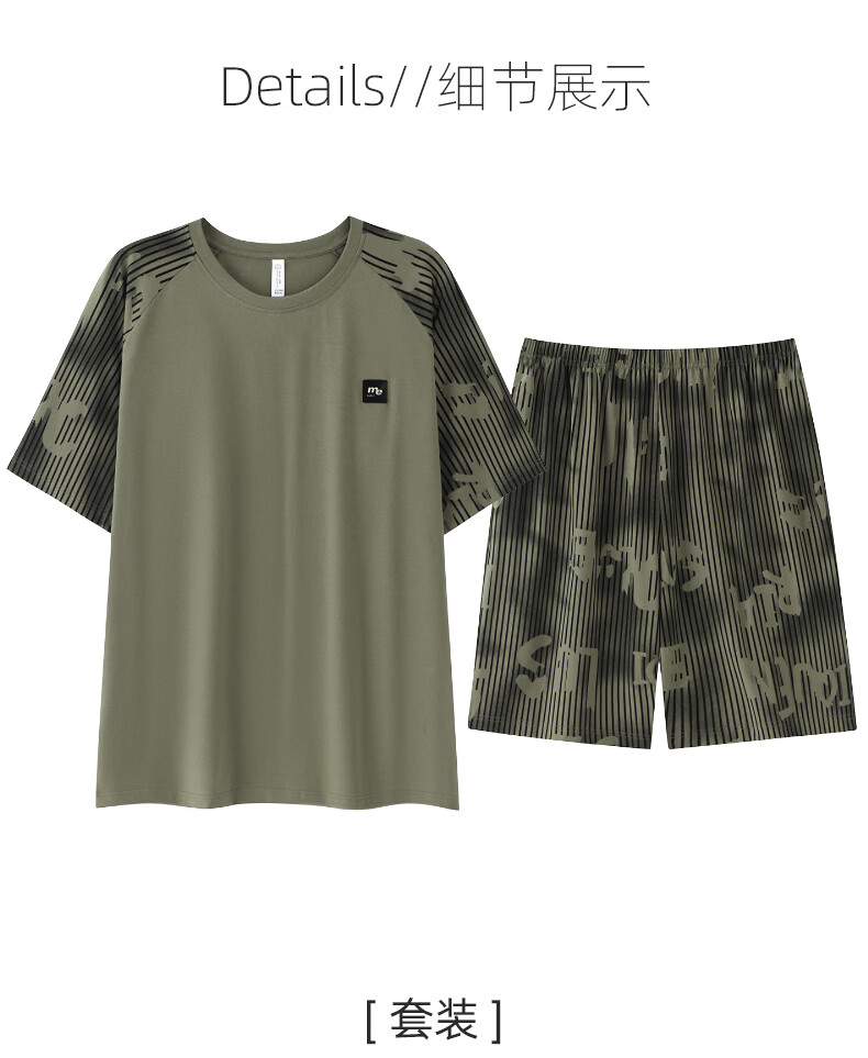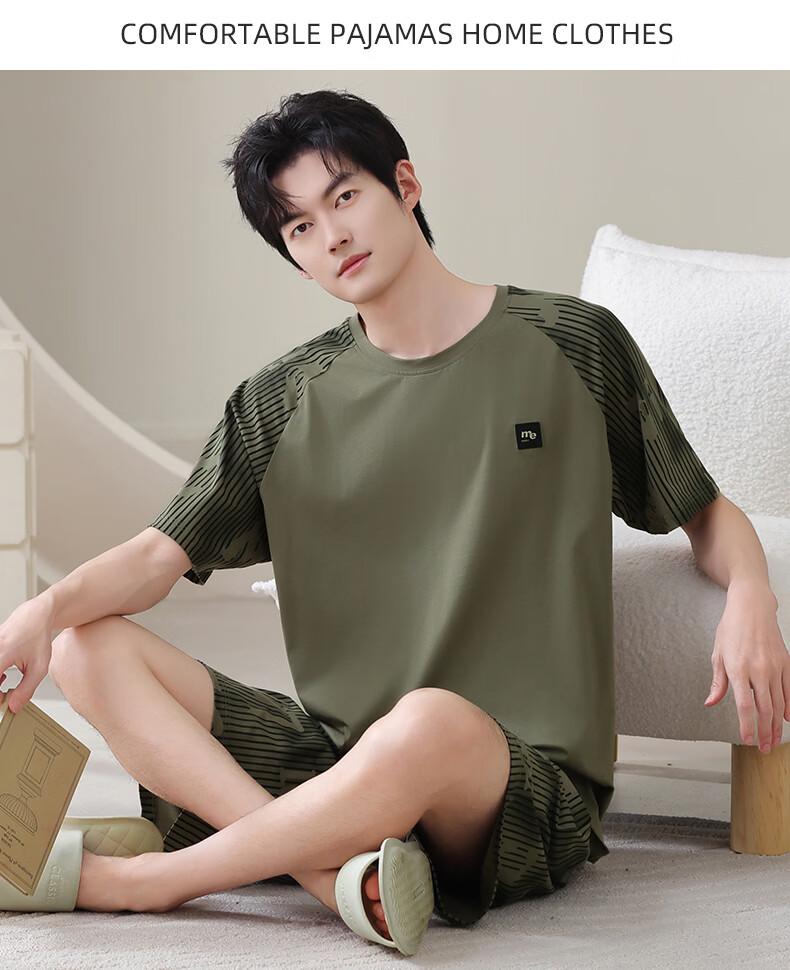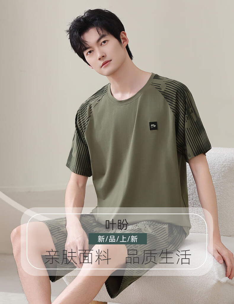 叶盼(yepan)男士睡衣男青少年纯棉2026新款春夏季短袖短裤套头休闲家居服套装 72137-茶绿 L (170) :建议100-120斤穿着