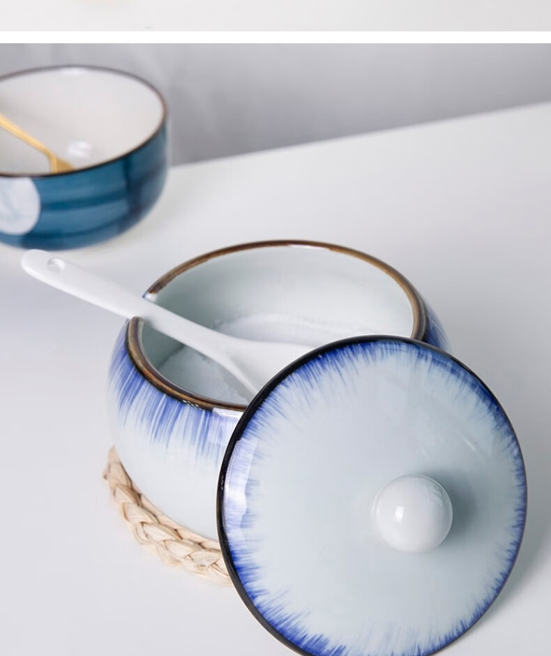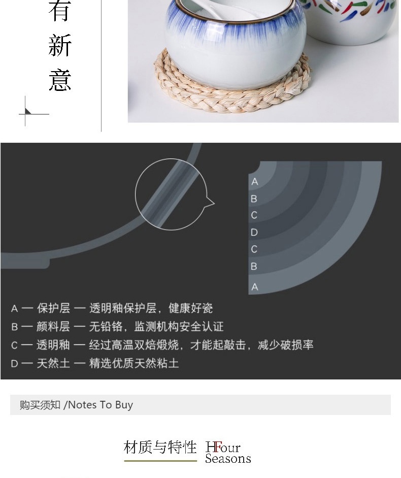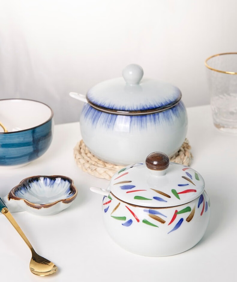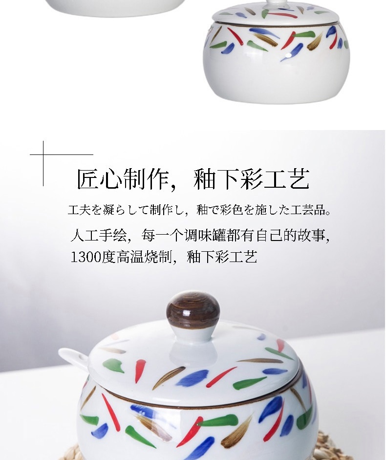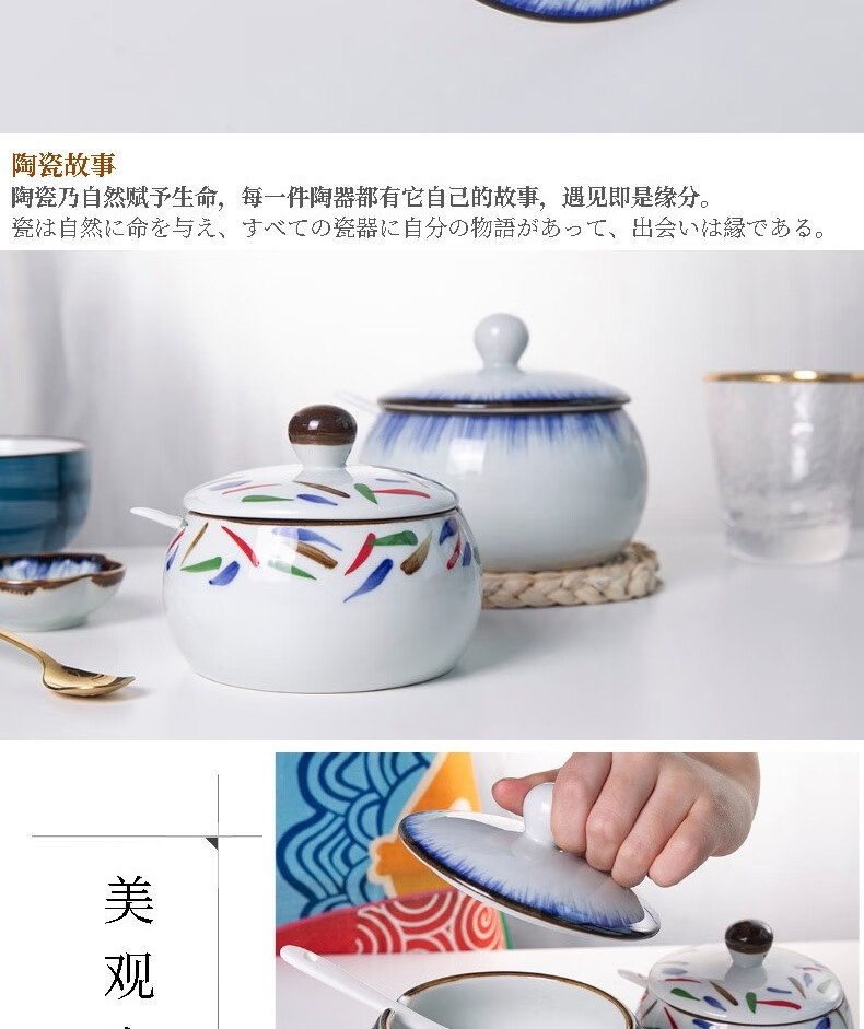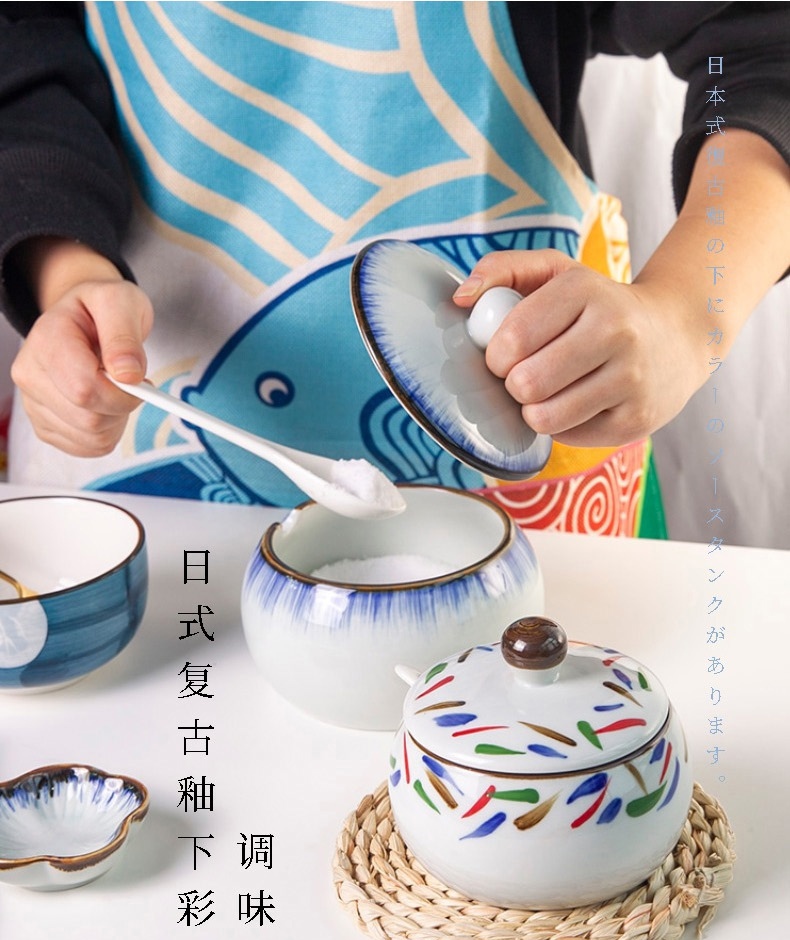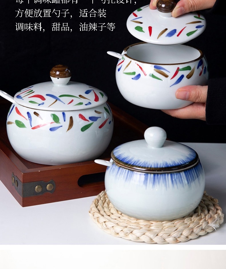 和风四季釉下彩调味罐盐罐厨房调料罐调料盒陶瓷辣椒罐猪油罐炖盅油辣子罐 四色大号调味罐(配勺) 550ml