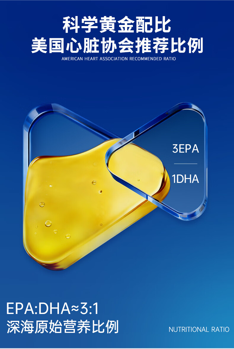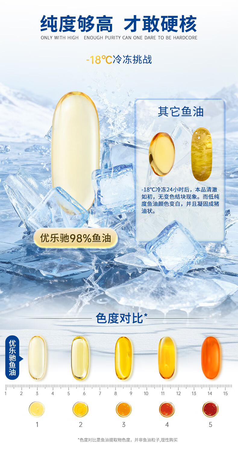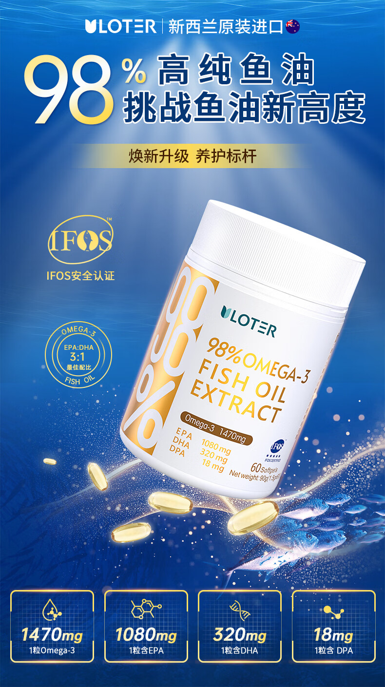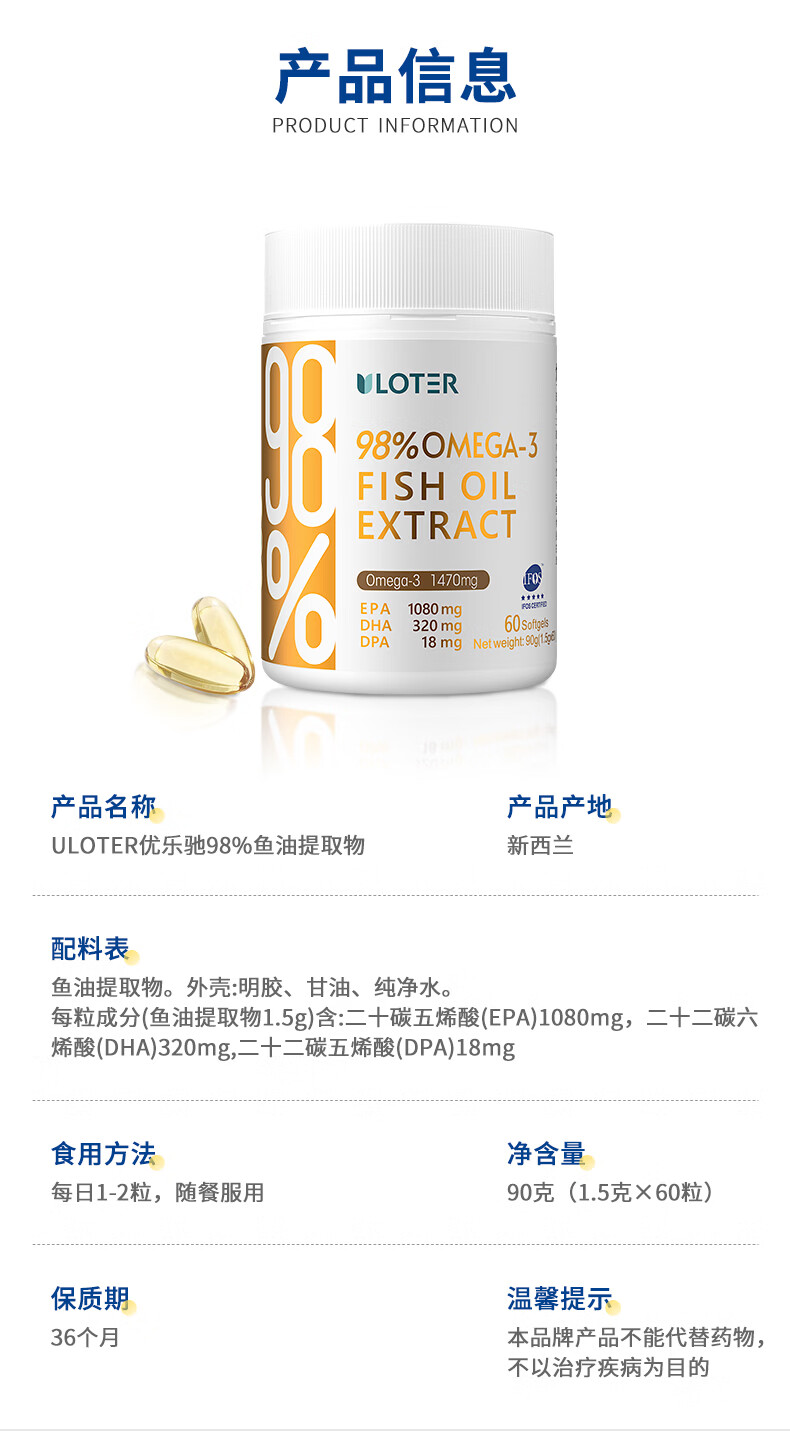 优乐驰鱼油98%高纯度rTG型鱼油EPA+DHAomega3五星认证青少年中老年60粒 60粒*3瓶 周期调养降血脂