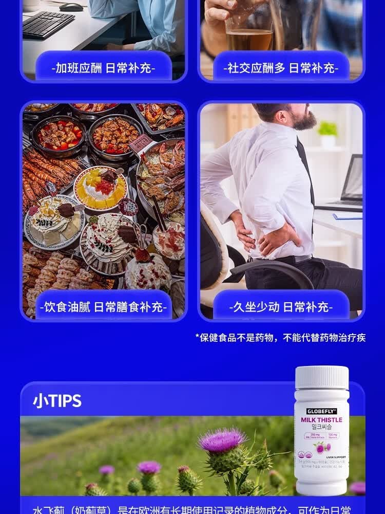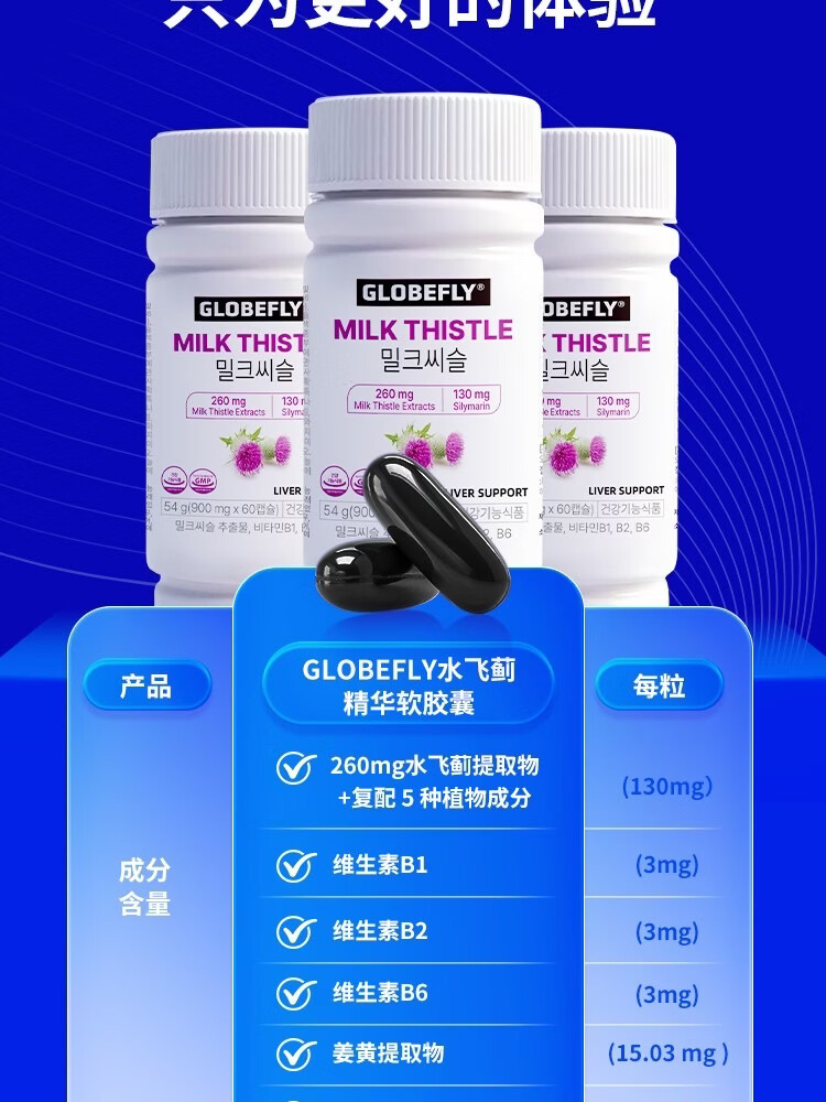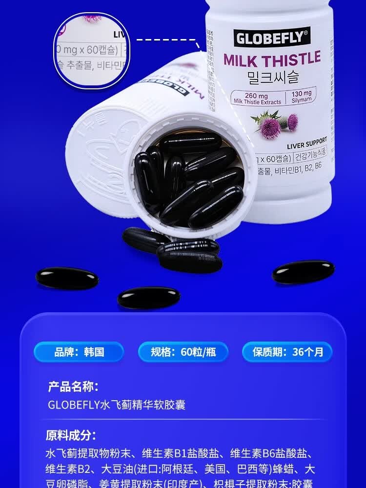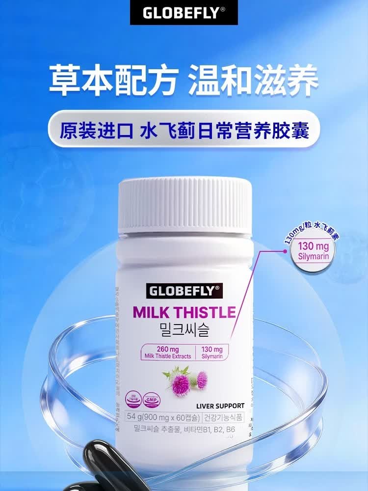 GLOBEFLY韩国进口护肝片奶蓟草水飞蓟养肝解酒熬夜胶囊保健品护肝胶囊姜黄 6 瓶装