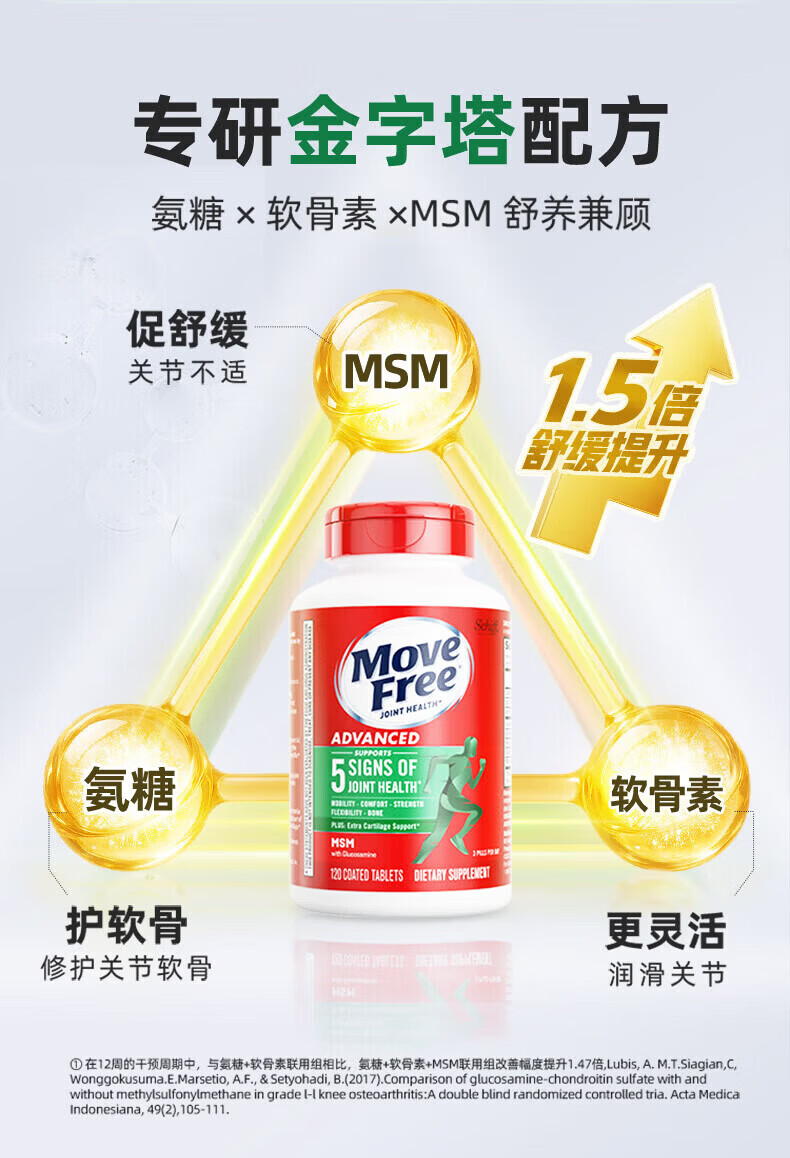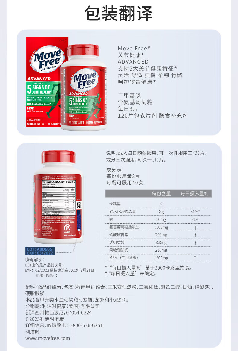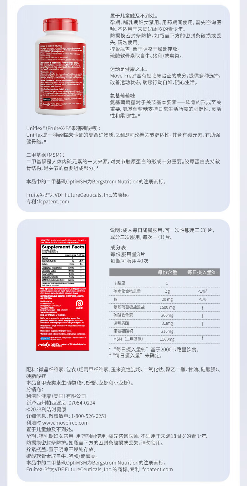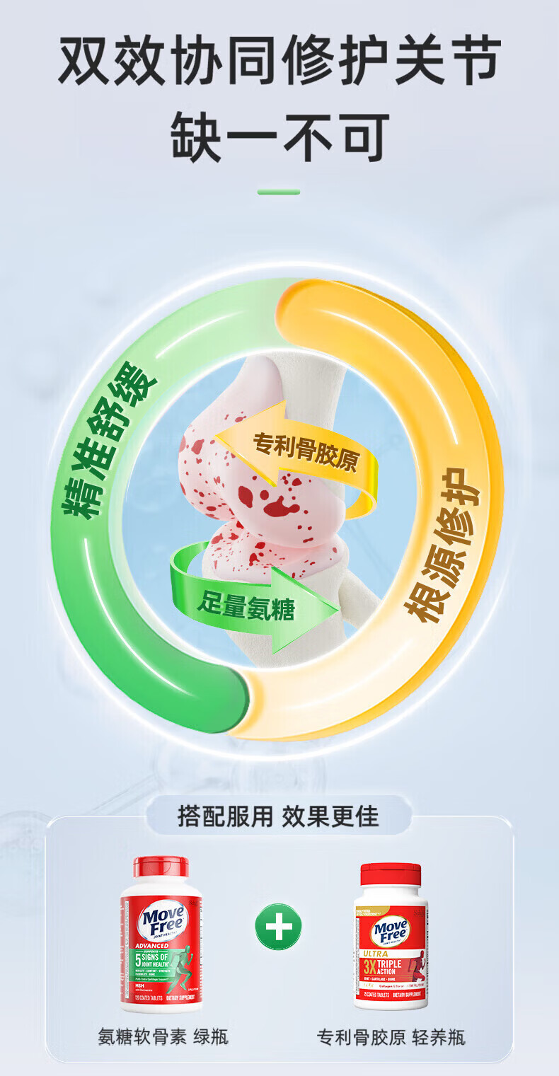 益节健康Move Free进口氨糖维骨力中老年人骨质疏松腰腿疼护关节 红瓶巩固3周期 氨糖软骨素钙片 200粒*5瓶