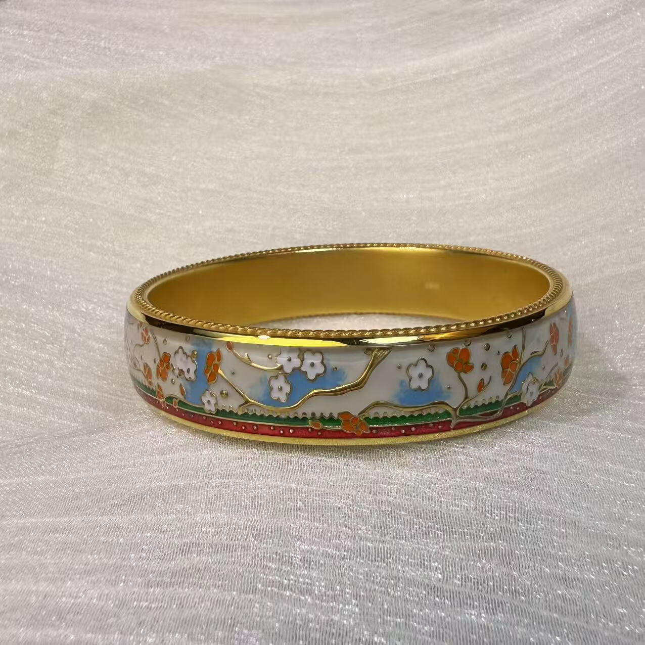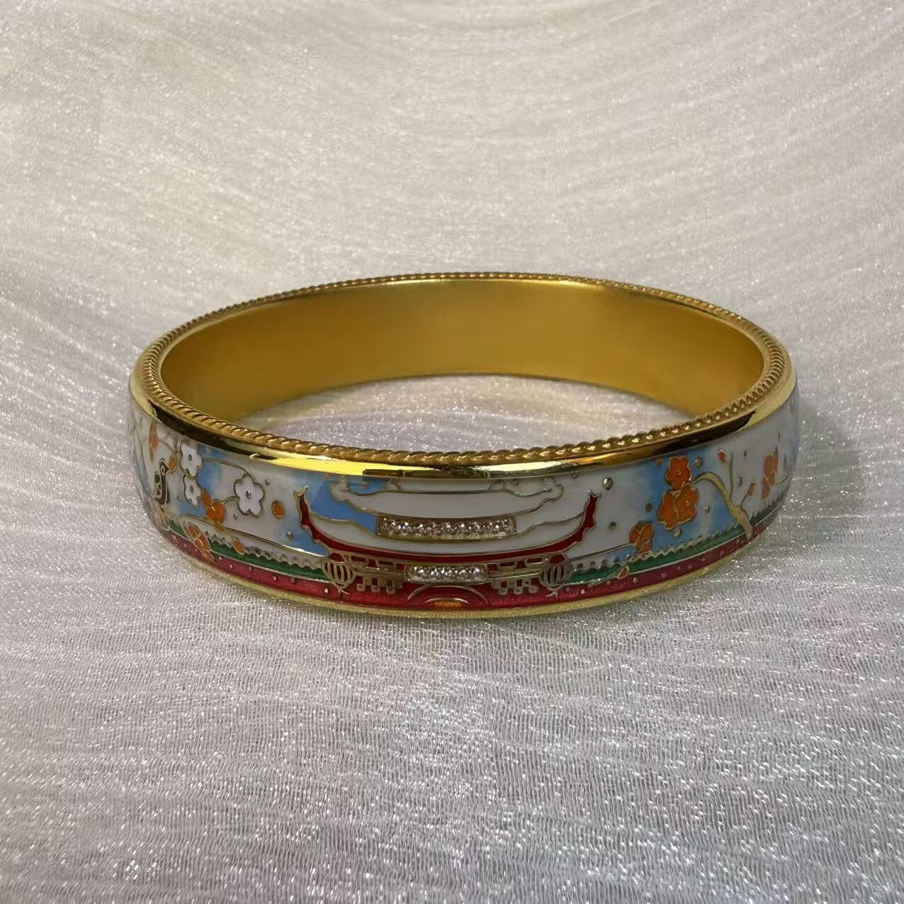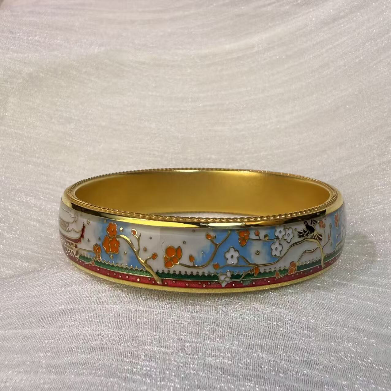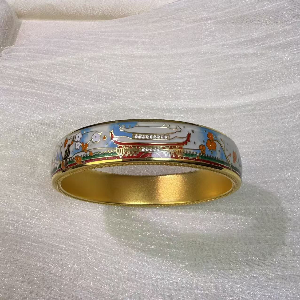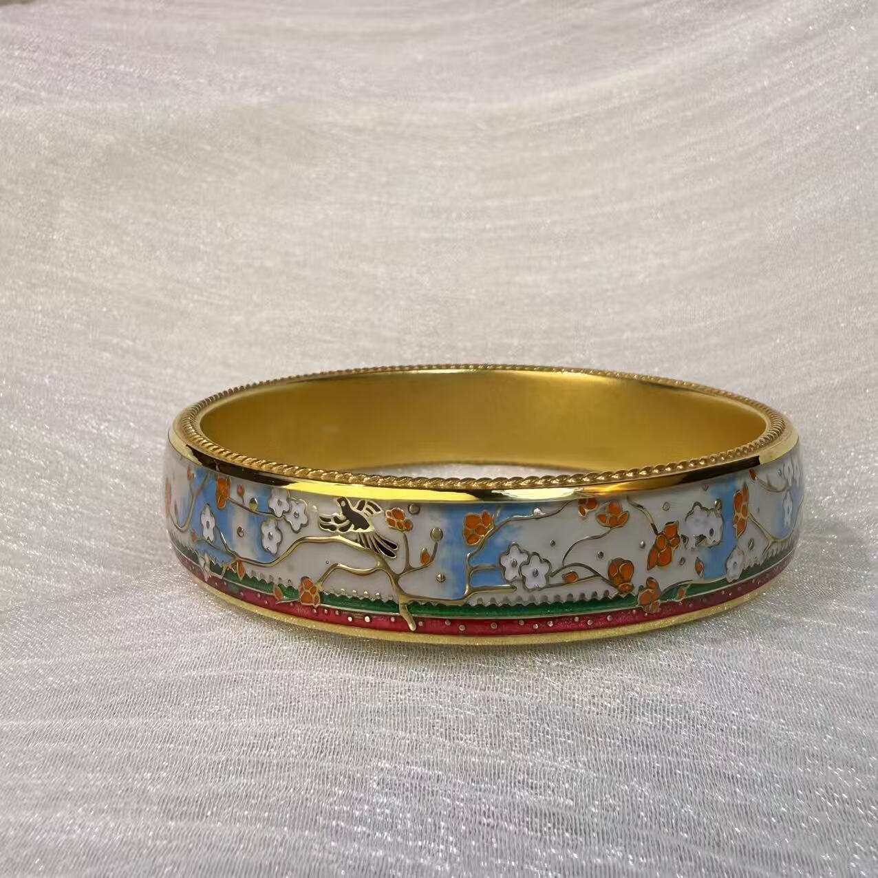 钻之银民族风珐琅彩手镯足银999鎏金拍平工艺 黄色 60圈口约60克