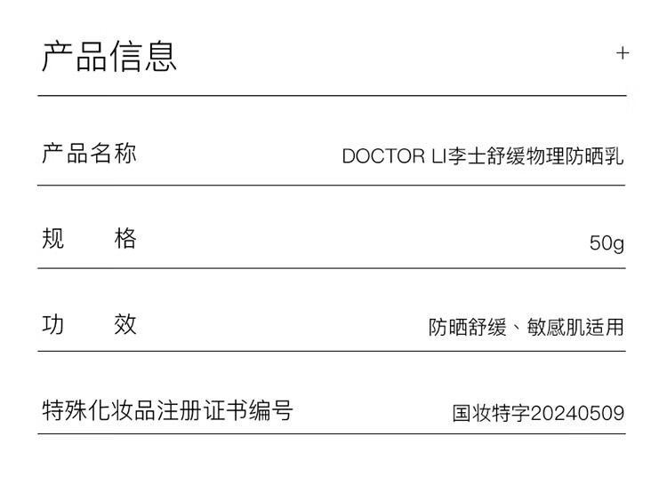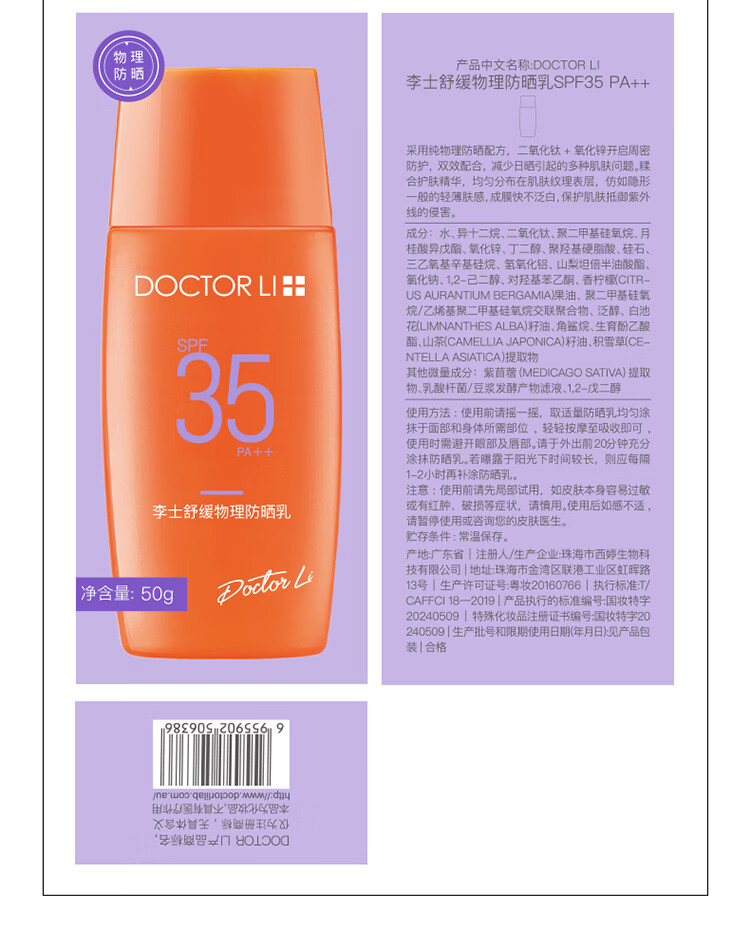 屈臣氏DOCTOR LI 李士舒缓物理防晒乳SPF35 PA++ 50g
