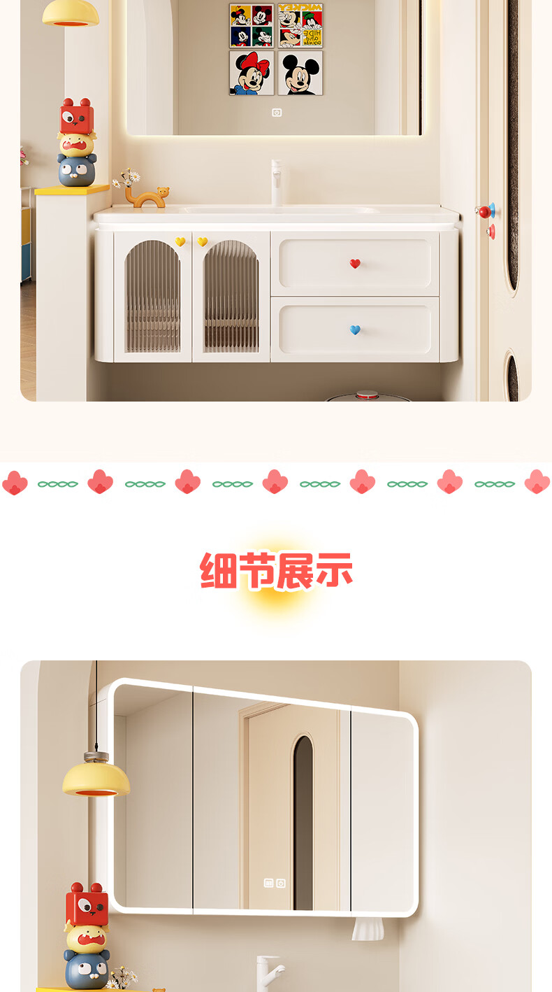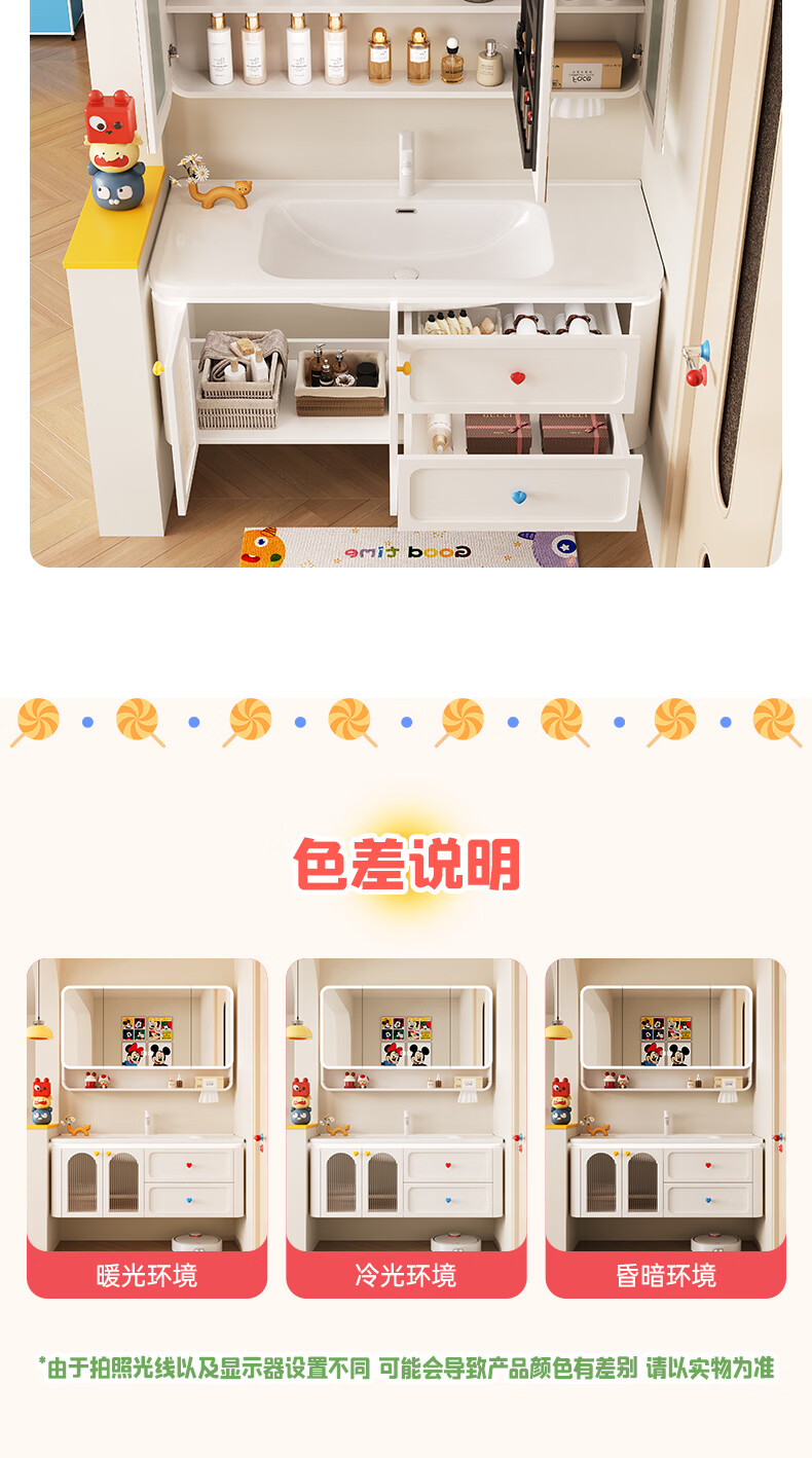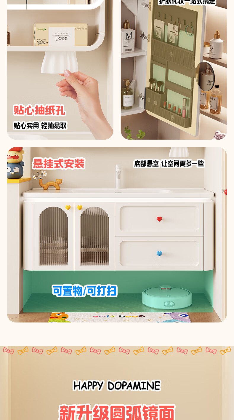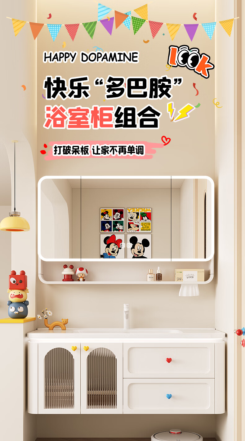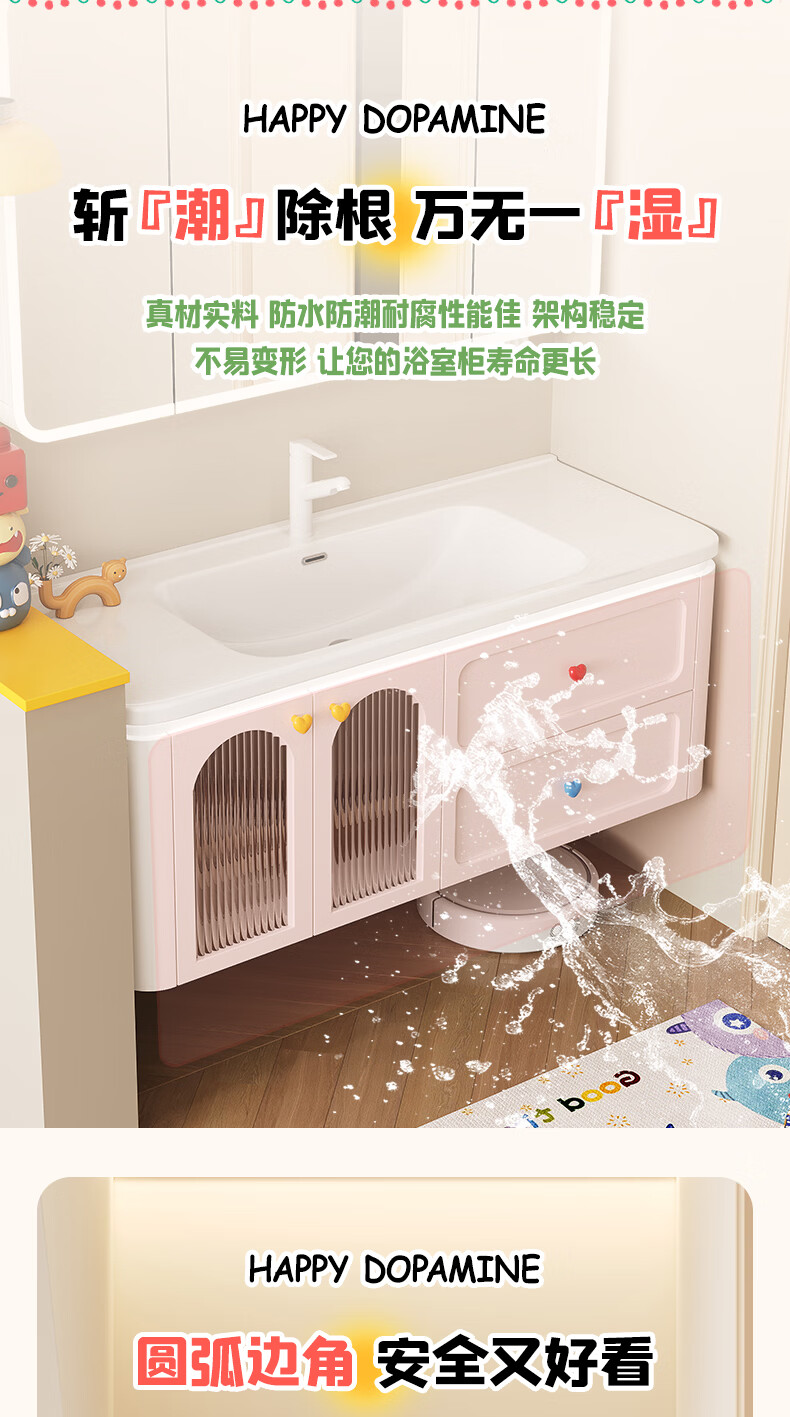 浴美优品多巴胺浴室柜实木陶瓷一体盆卫生间洗手盆洗脸盆柜组合浴柜洗漱台 60cm+升降抽拉龙头+智能方镜 【多巴胺】浴室柜/送安装