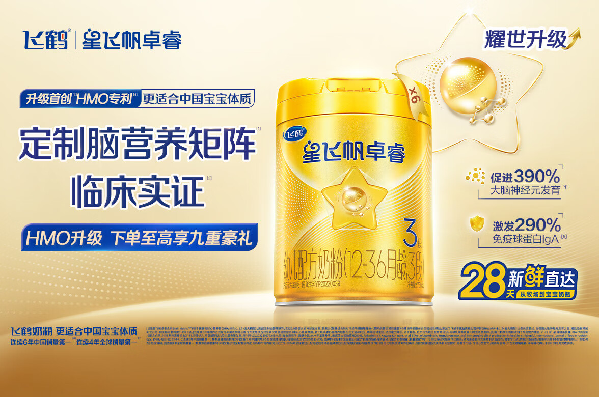 飞鹤星飞帆卓睿 3段幼儿配方奶粉(1-3岁)750g*6罐 HMO 28天新鲜直达