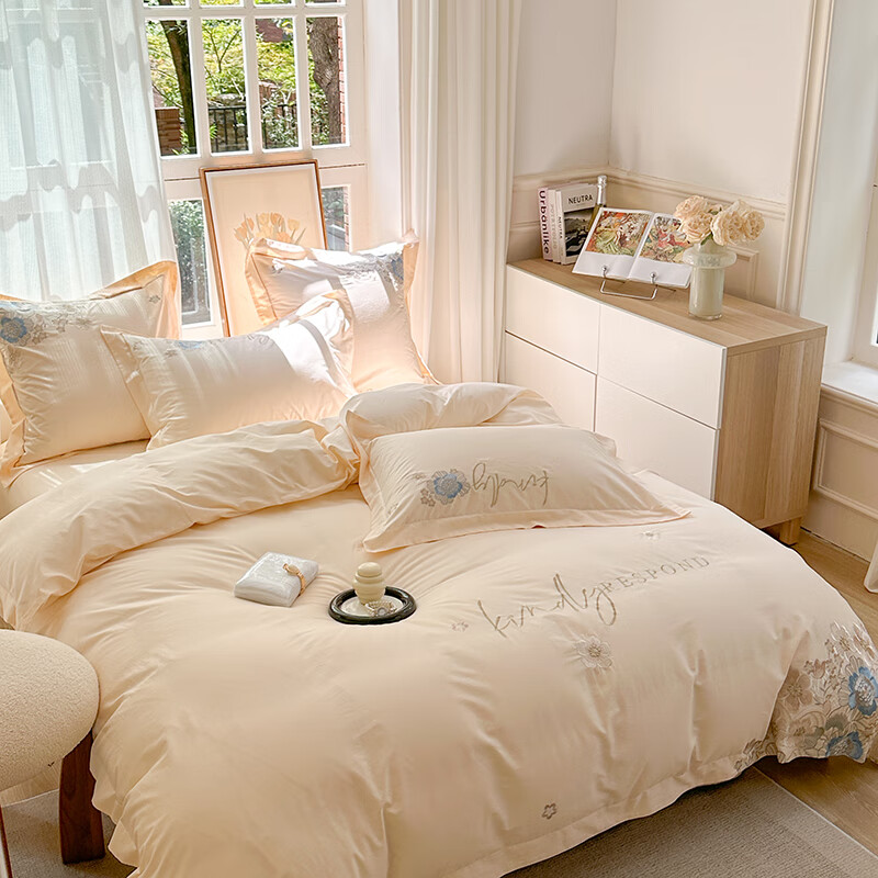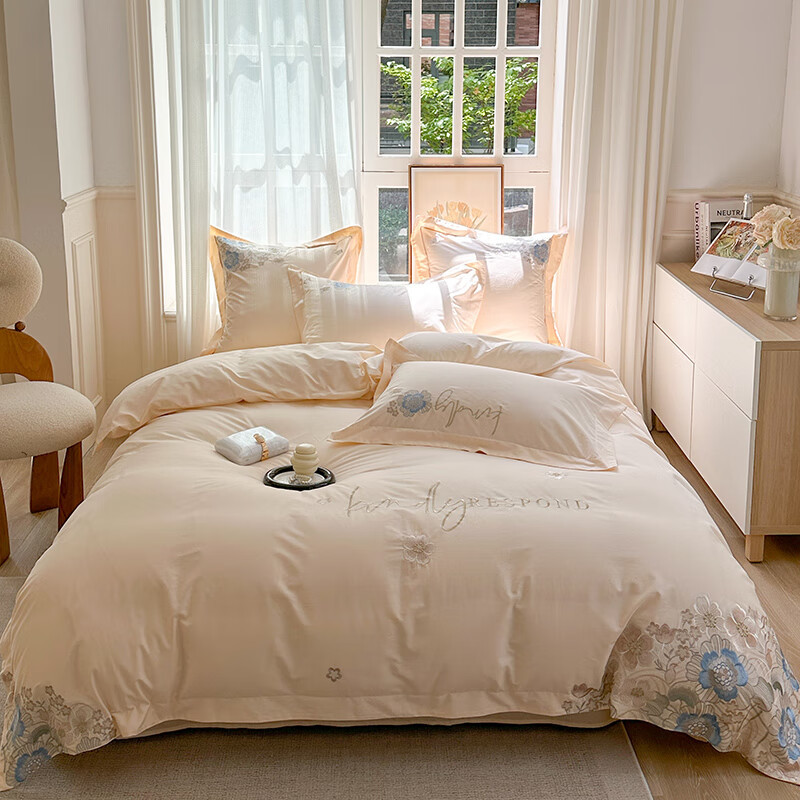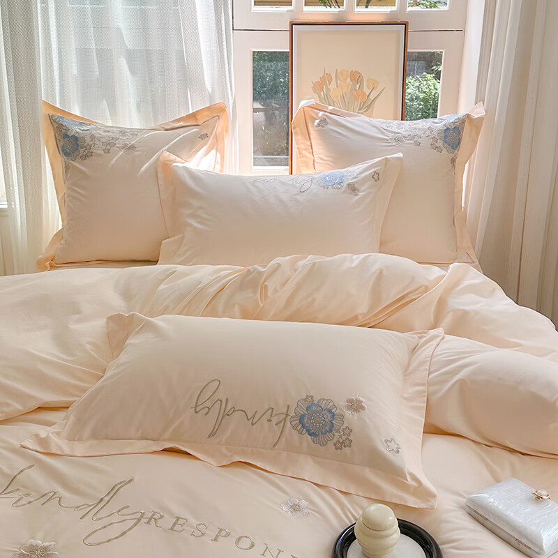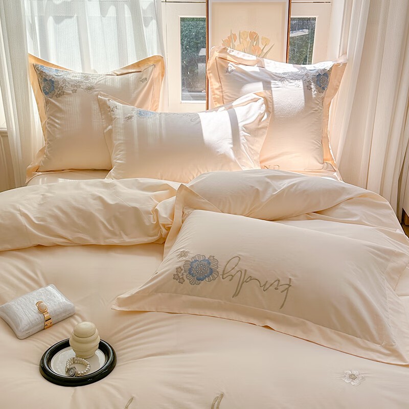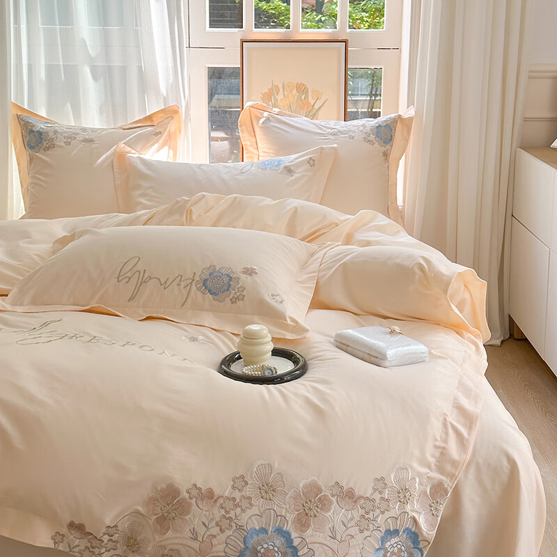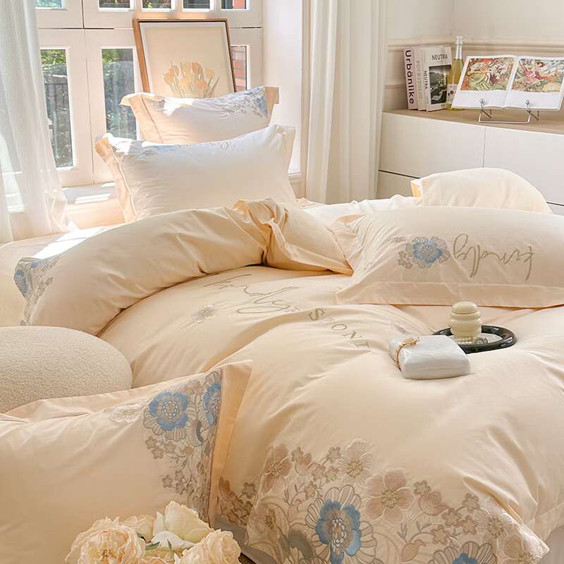 百丽丝四件套100支双股精致刺绣长绒棉四件套 迪丽莎尔(珊瑚金色) 床单款 (被套200*230cm)