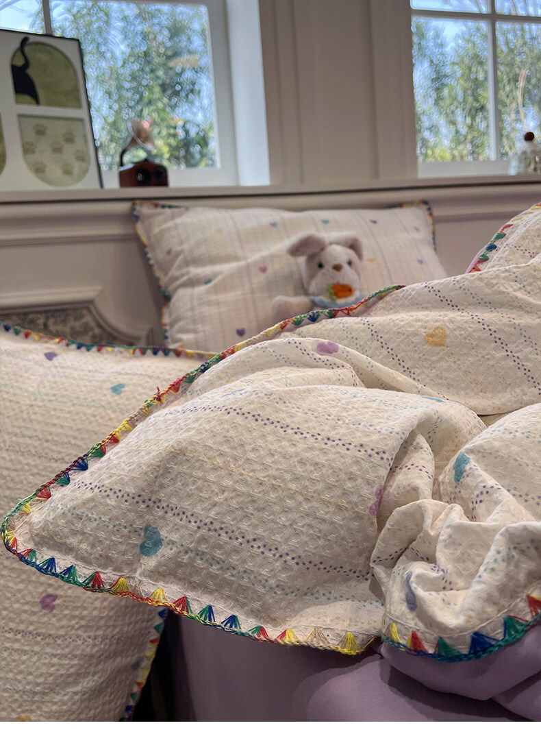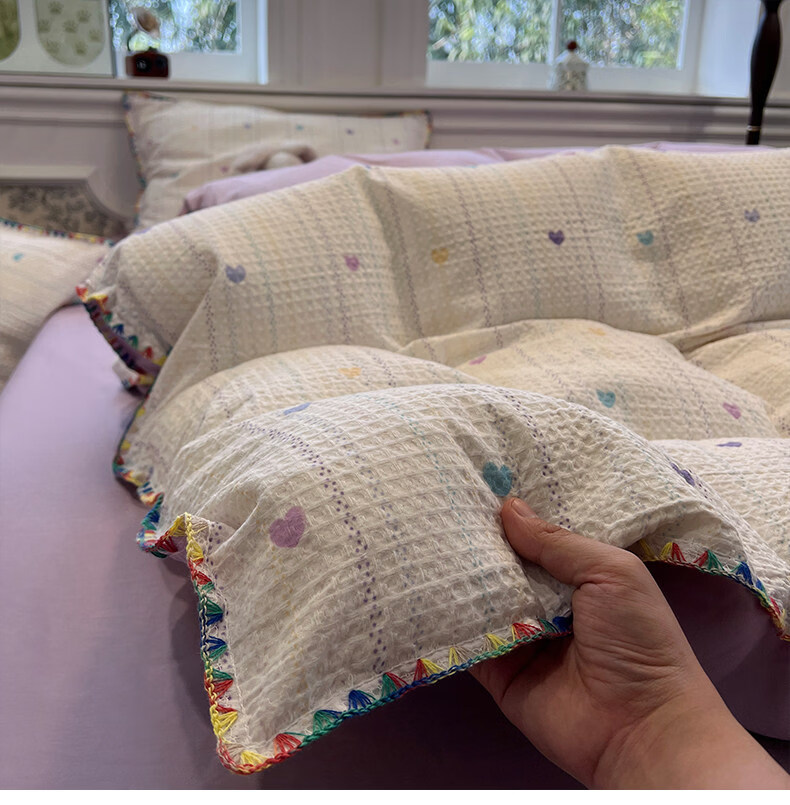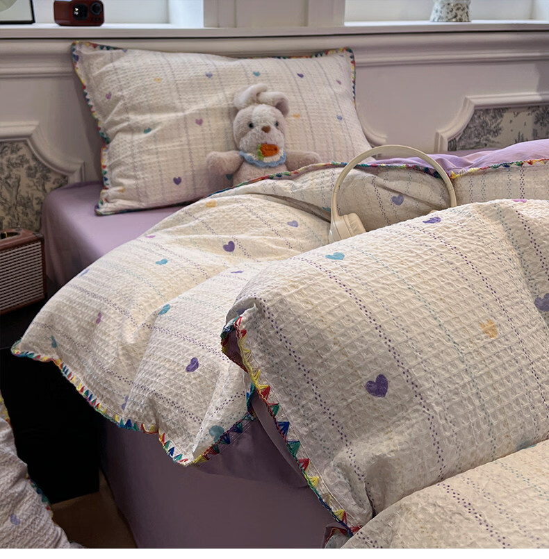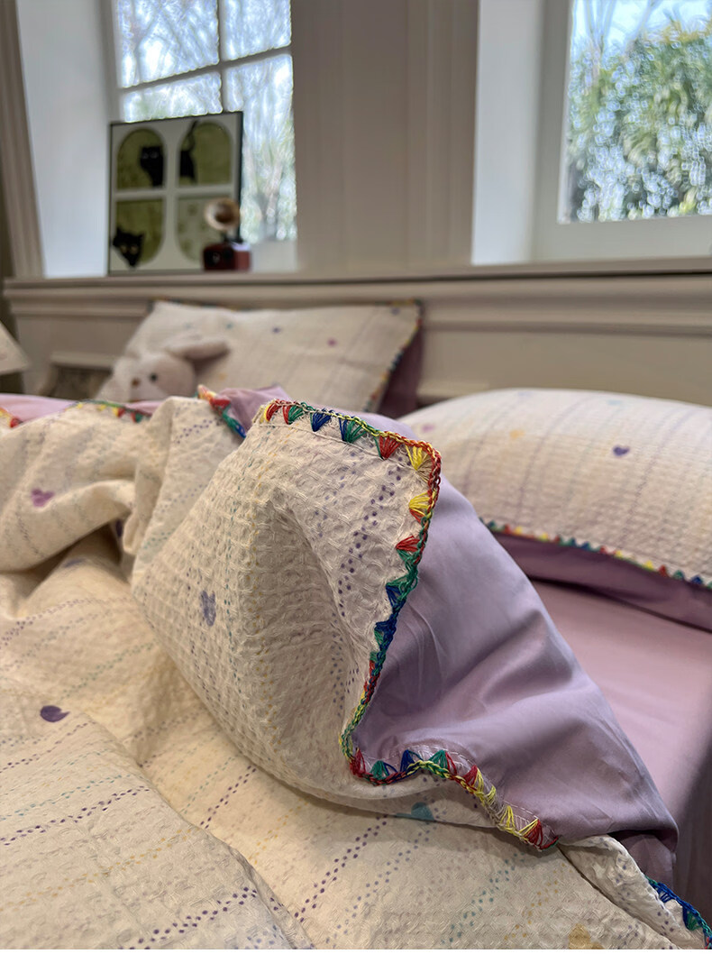 苏萱ins紫条爱心全棉华夫格床上四件套纯棉1.5m贝壳边被套床单三件套4 伊柠 1.8m 床单款 四件套-被套200x230cm