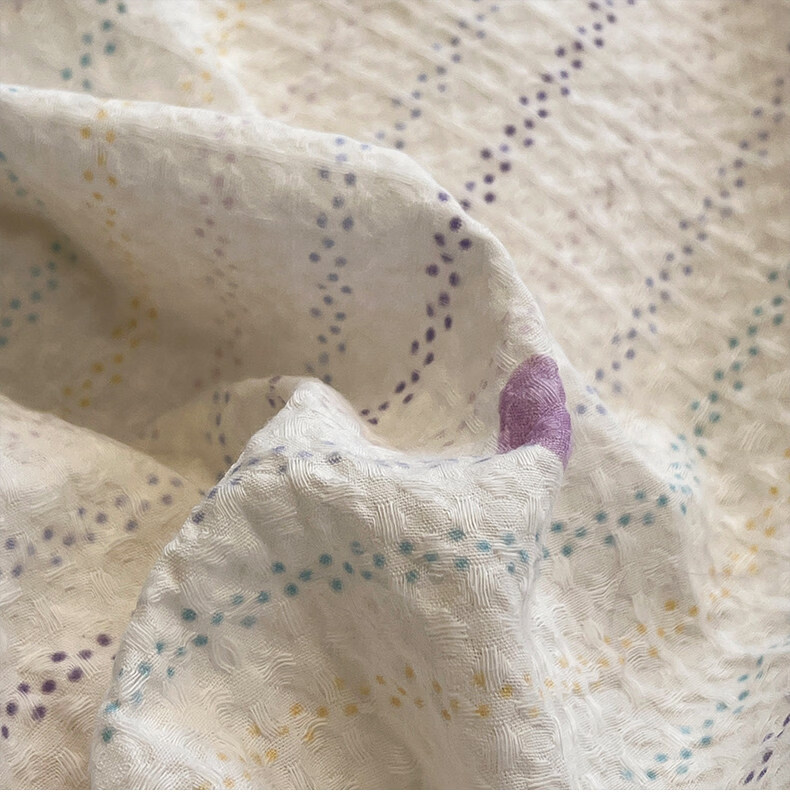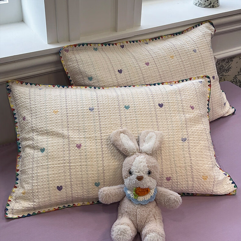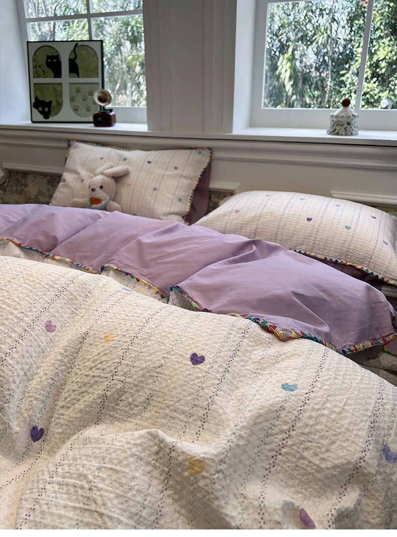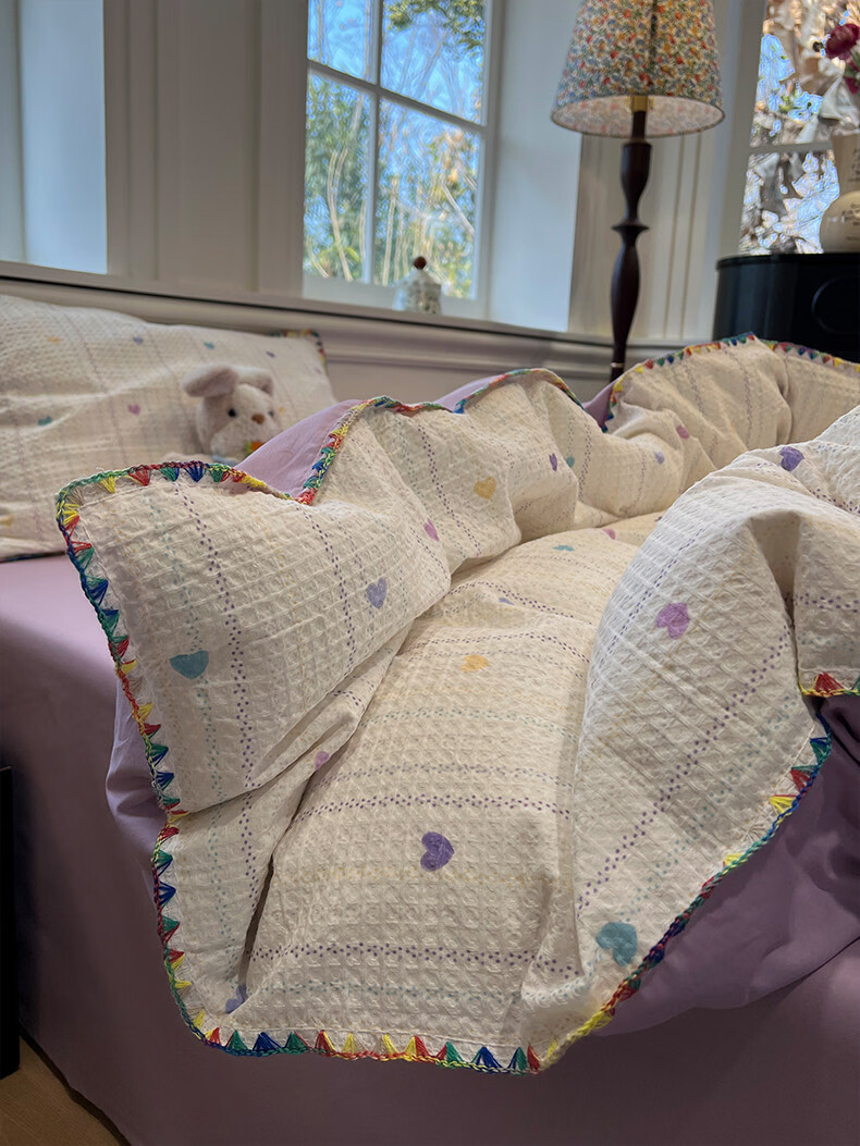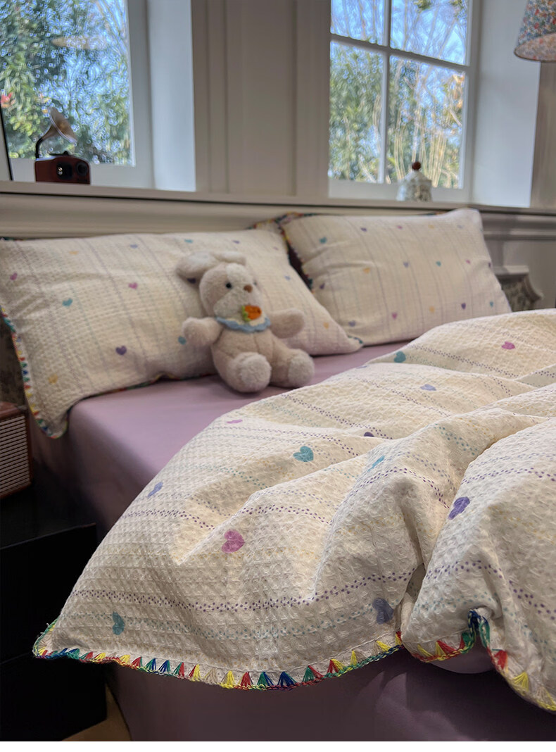 苏萱ins紫条爱心全棉华夫格床上四件套纯棉1.5m贝壳边被套床单三件套4 伊柠 1.8m 床单款 四件套-被套200x230cm