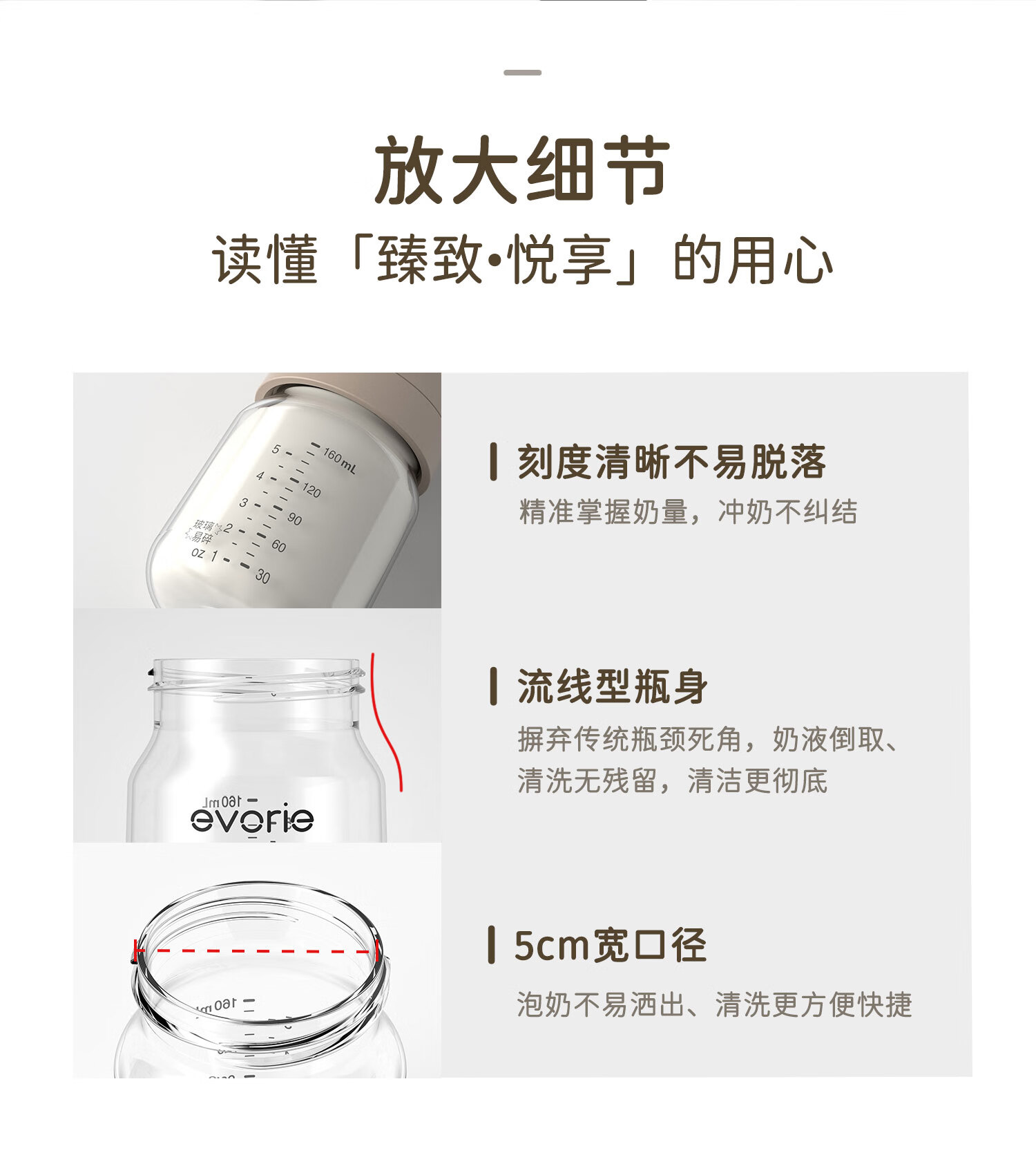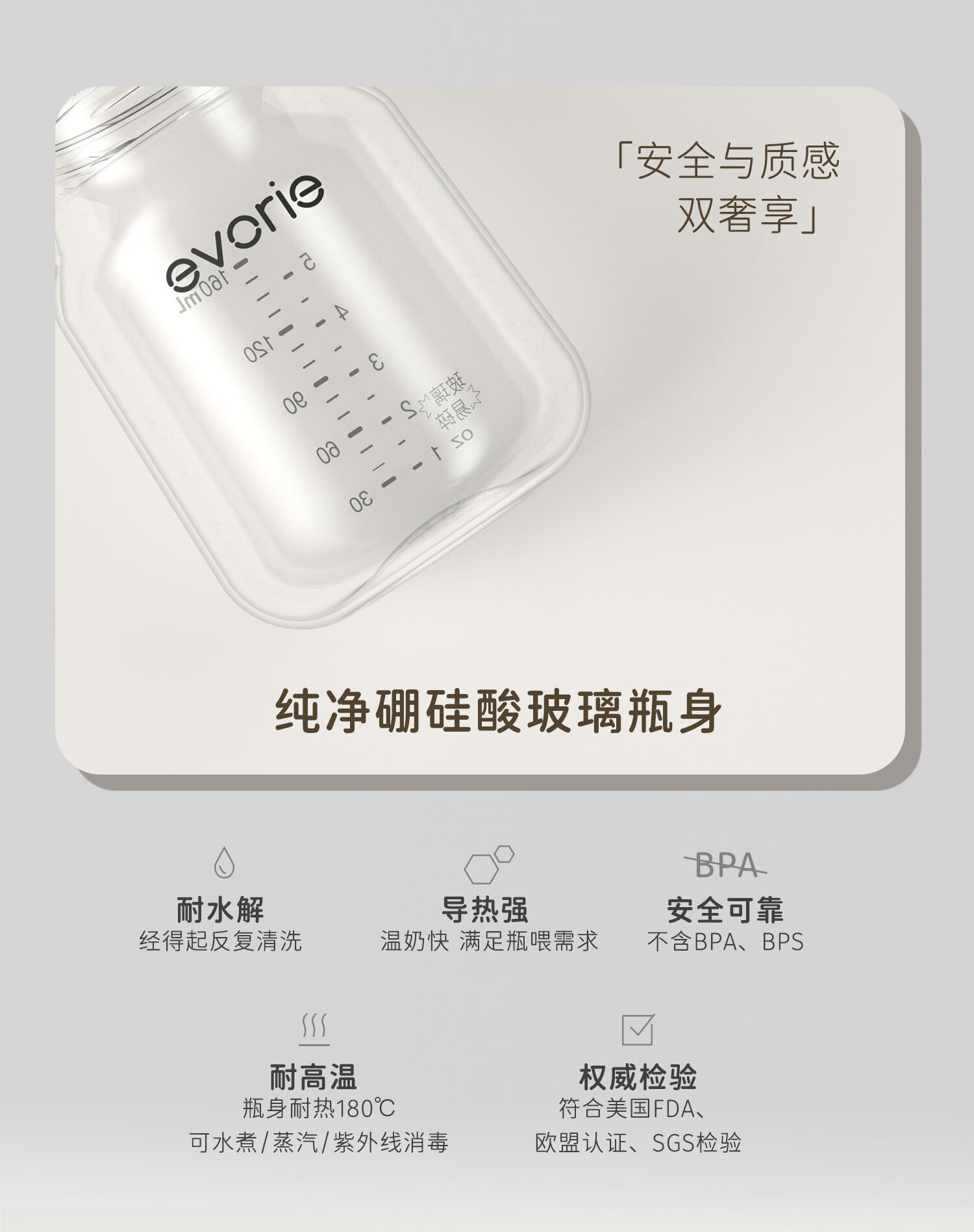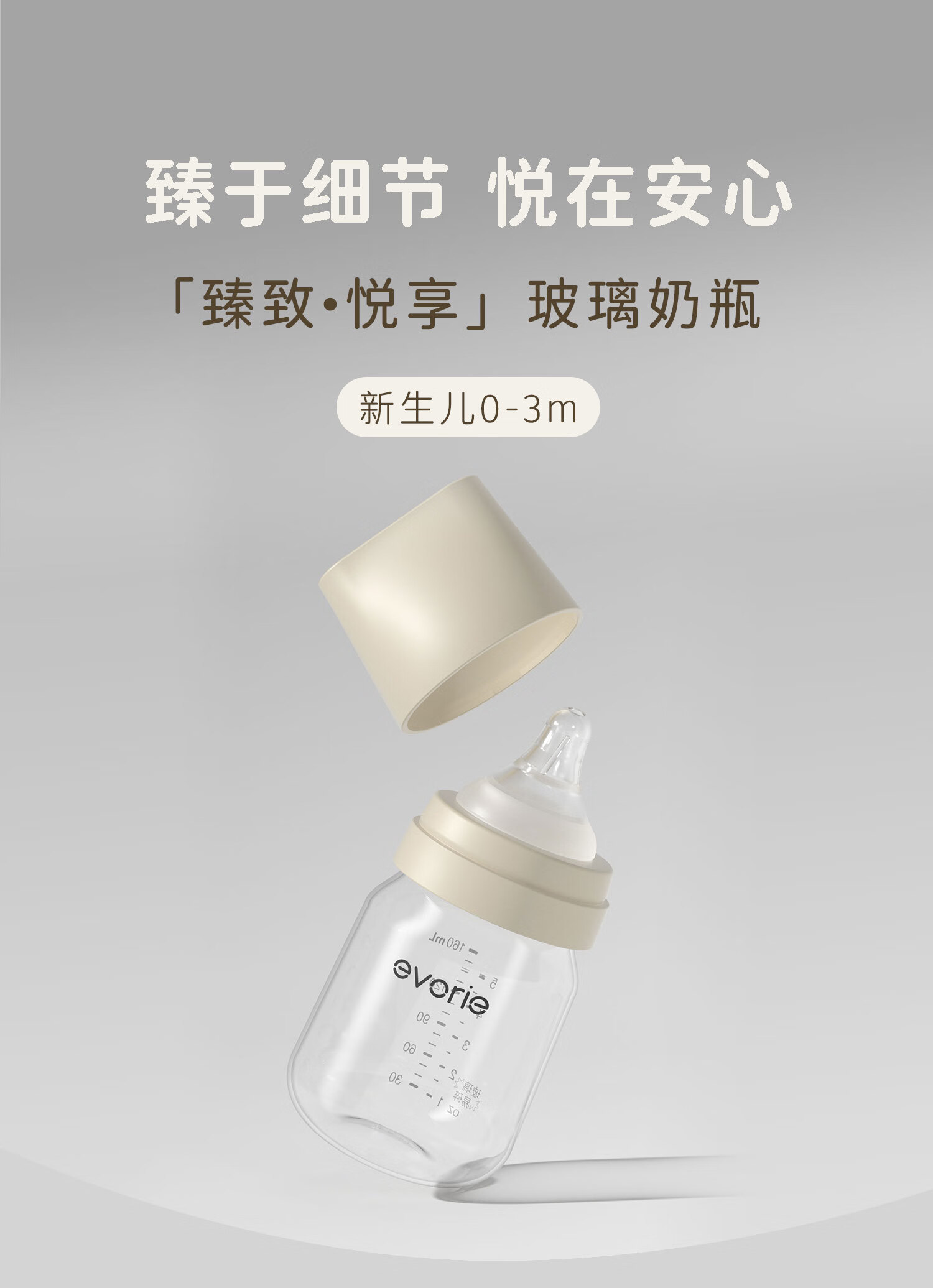 爱得利(evorie)臻致系列 玻璃奶瓶 新生儿奶瓶防胀气宽口径婴儿防呛早产儿奶瓶 【0-3个月】防胀气 160ml