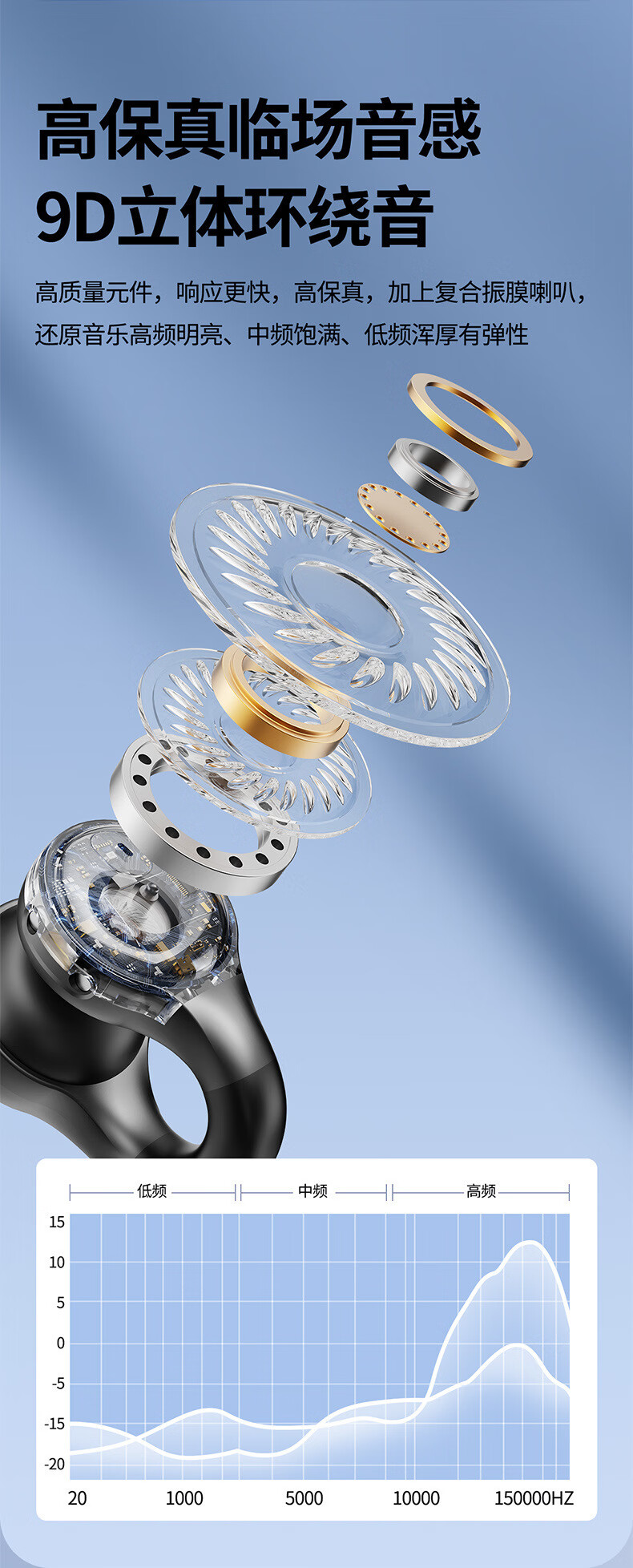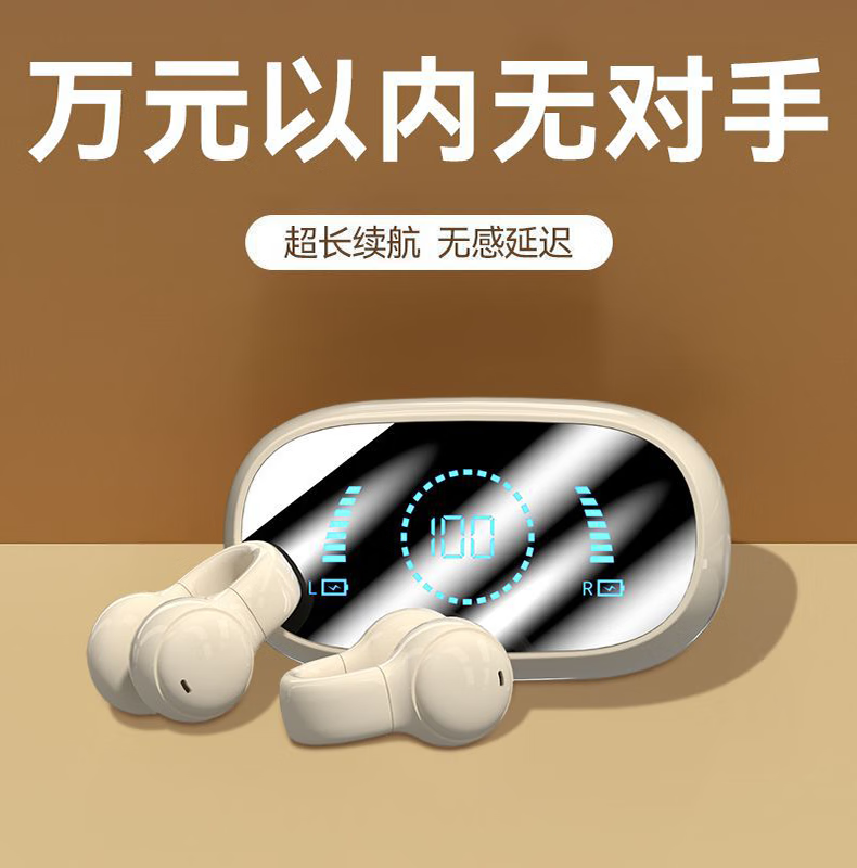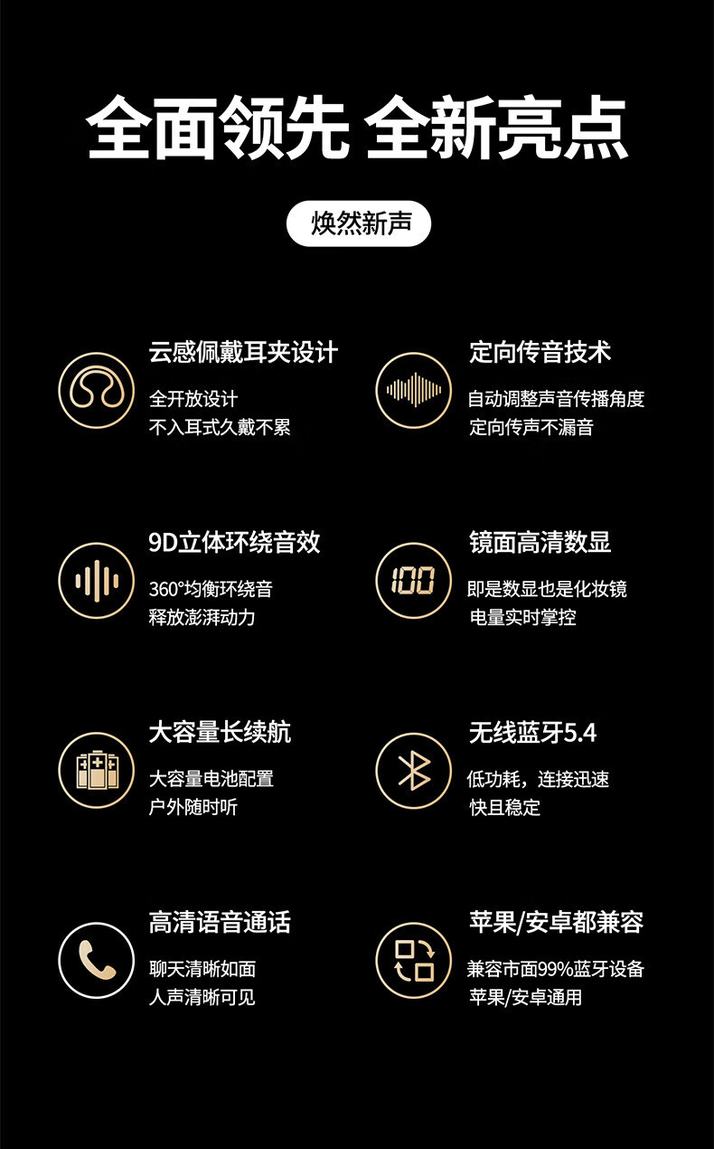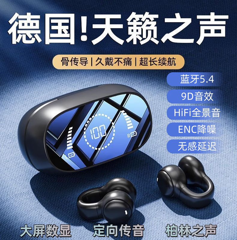 中性不入耳骨传导无线降噪耳机蓝牙5.4HiFi全景音开放式耳夹式音乐运动跑步游戏超长续航 曜石黑【耳夹式+大屏数显+定向传音+9D音效】