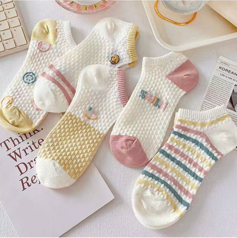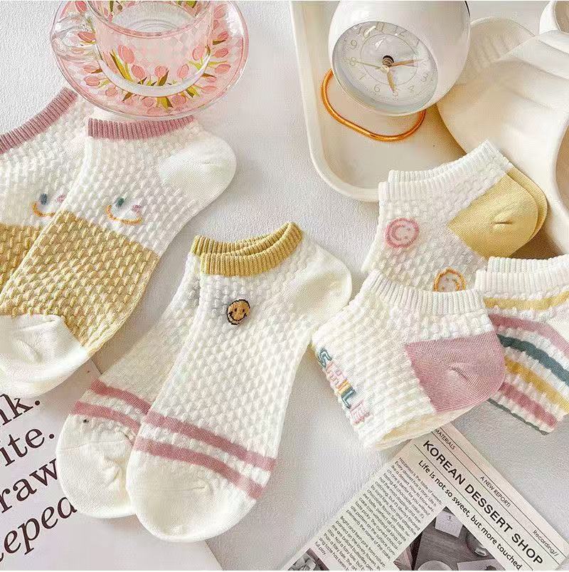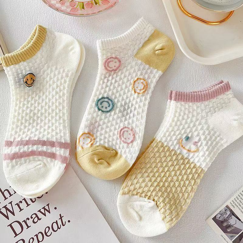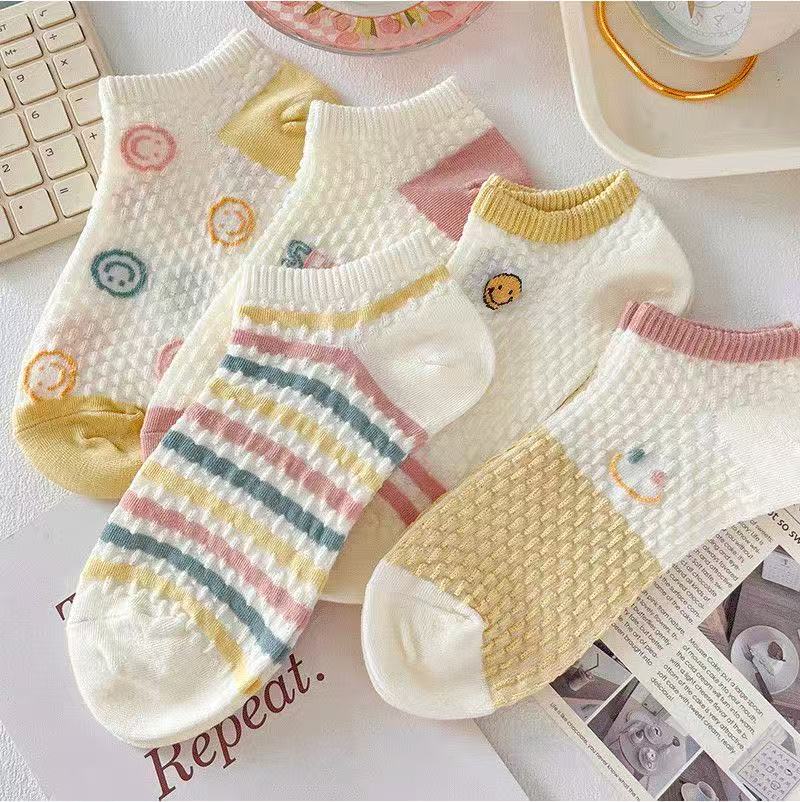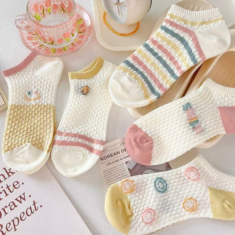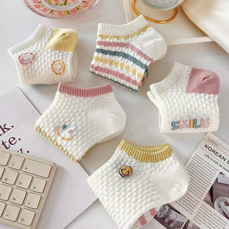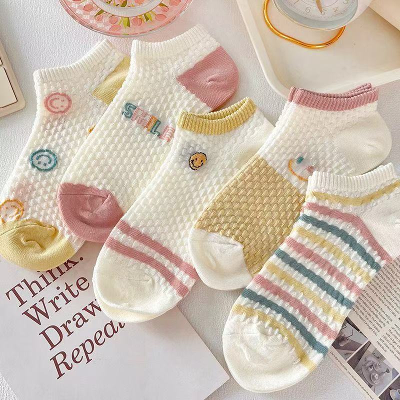 新款袜子女短袜女船袜镂空短袜女士短筒冰丝袜子女夏季薄款日系 五色各两双共10双【立体笑脸】 均码
