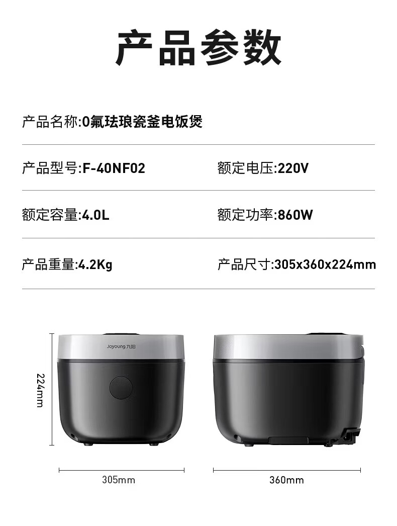 九阳(Joyoung)0氟系列珐琅瓷釜4升电饭煲 4~6人家用0特氟龙电饭锅微压35分钟快煮多功能预约国家补贴40NF02