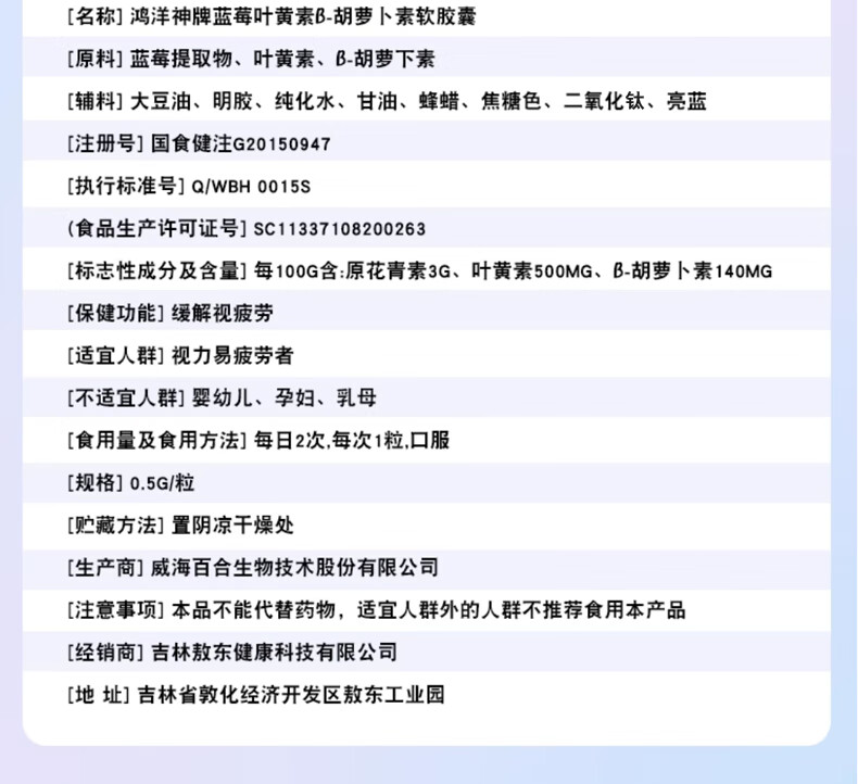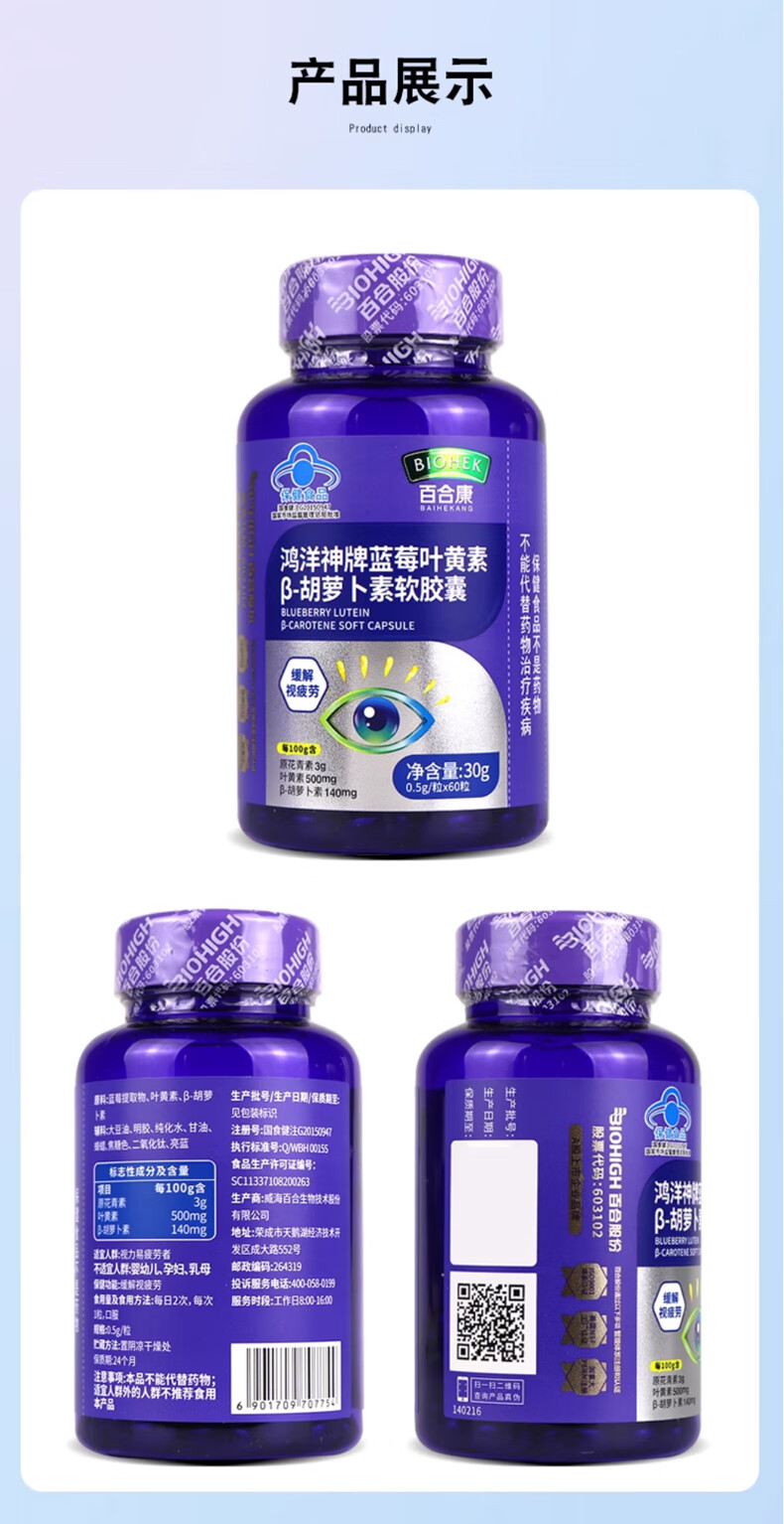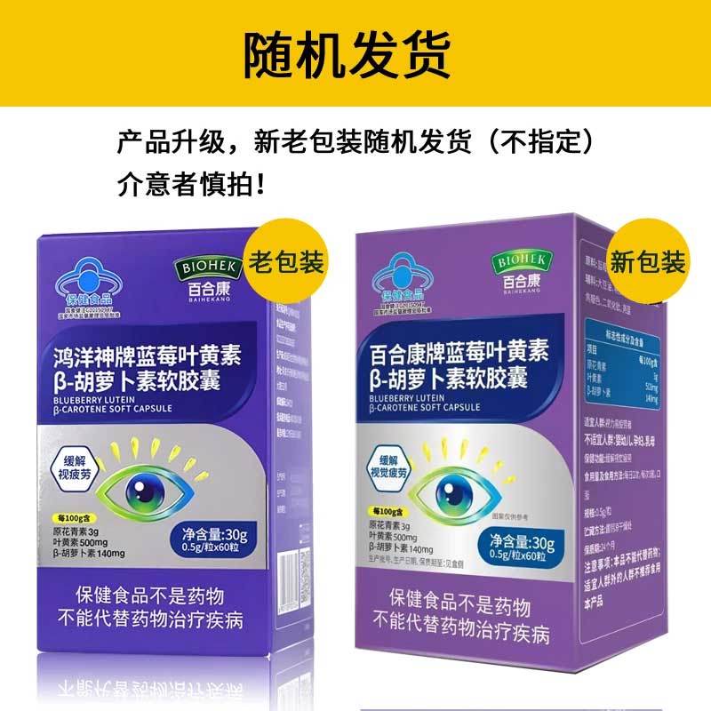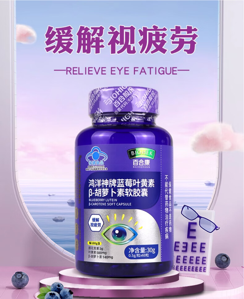 百合康蓝莓叶黄素β-胡萝卜素软胶囊60粒缓解视疲劳线下药房同款 蓝莓叶黄素β-胡萝卜素软胶囊1瓶