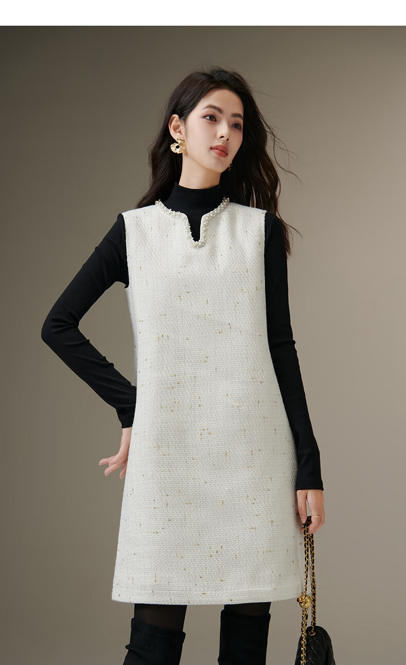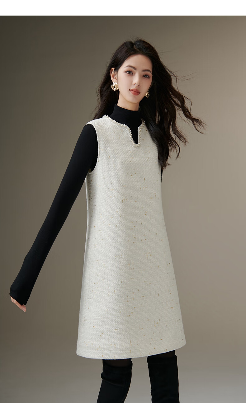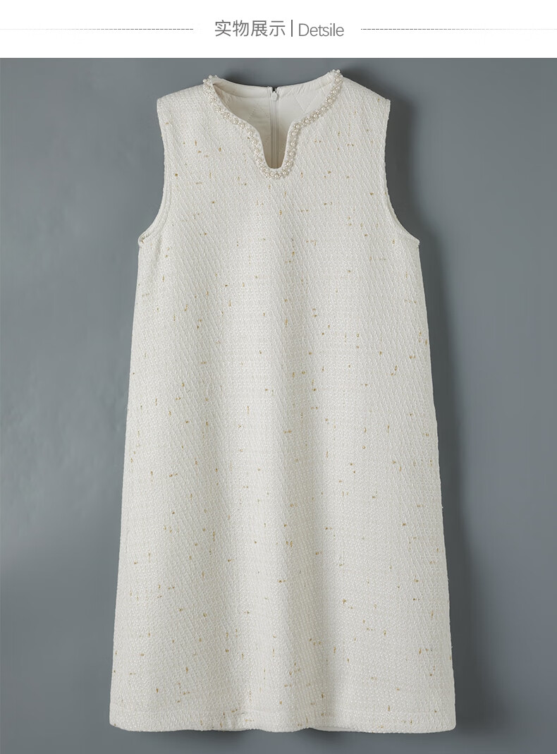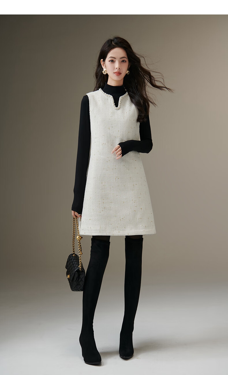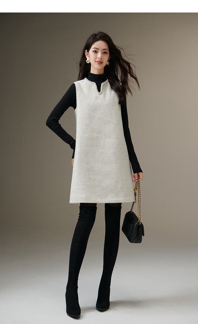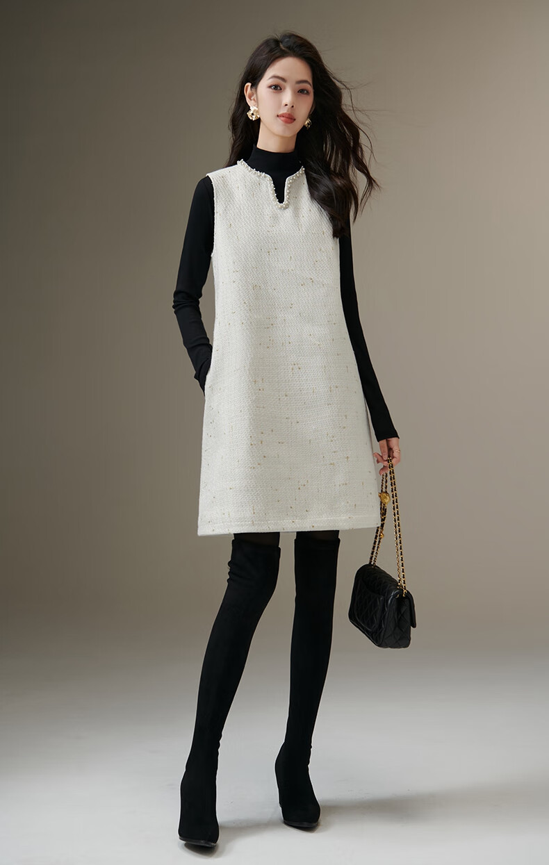 晚白【断码清仓】冬款时尚小香风粗花呢连衣裙小众设计感夹棉背心裙 米白色 M