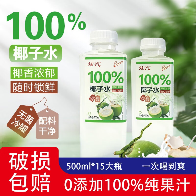 炫汽100%新鲜果汁饮料苹果汁葡萄汁桔子汁椰子汁500ml/瓶夏日休闲饮品 【500ML*15瓶】椰子汁