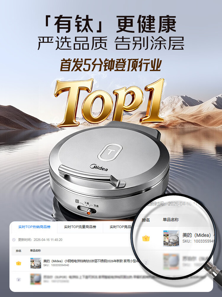 美的(Midea)小钢炮电饼铛有钛0涂层不锈钢2026年新款 家用小型40mm加大加深双面加热烙饼锅电煎锅京东自营S3ti