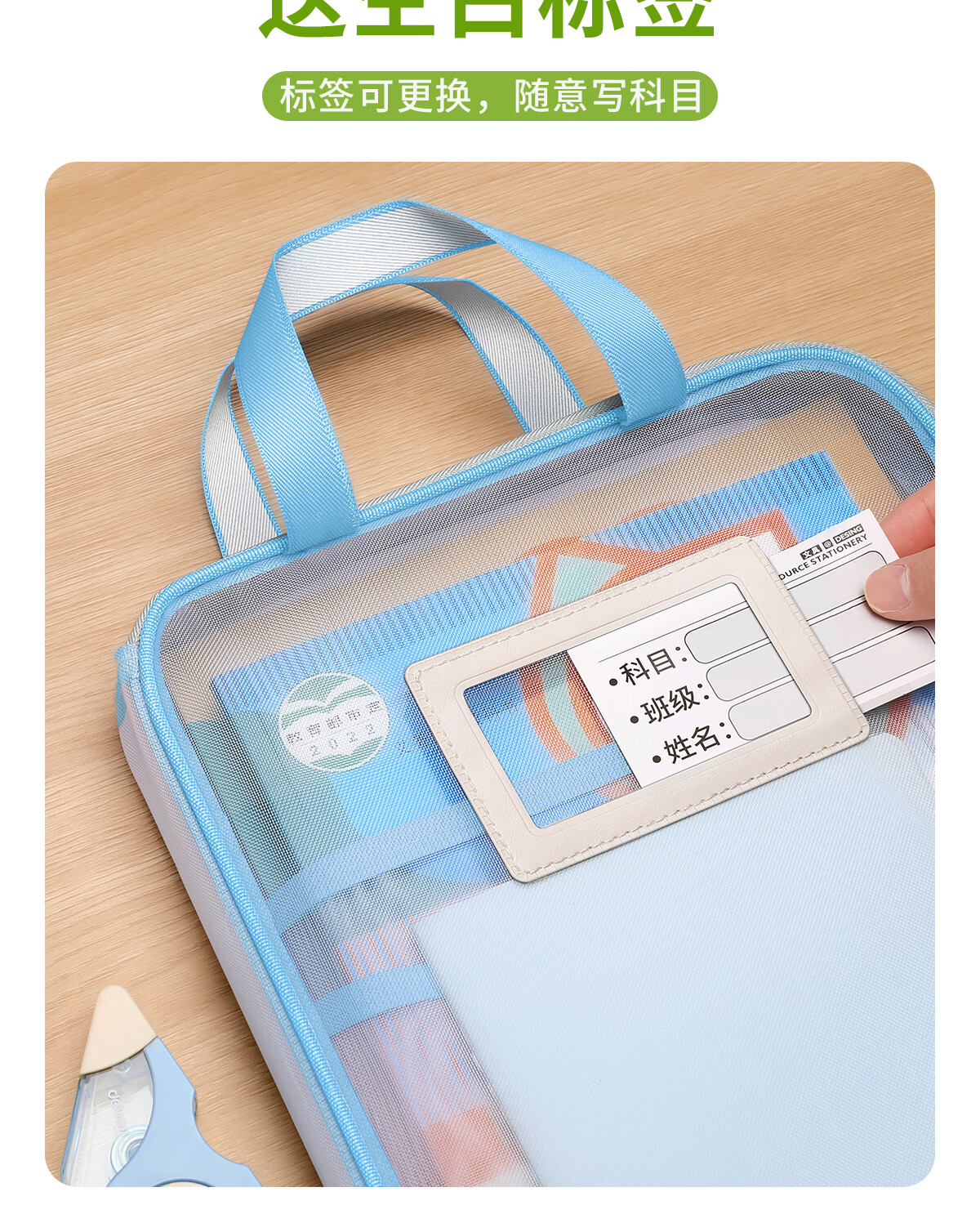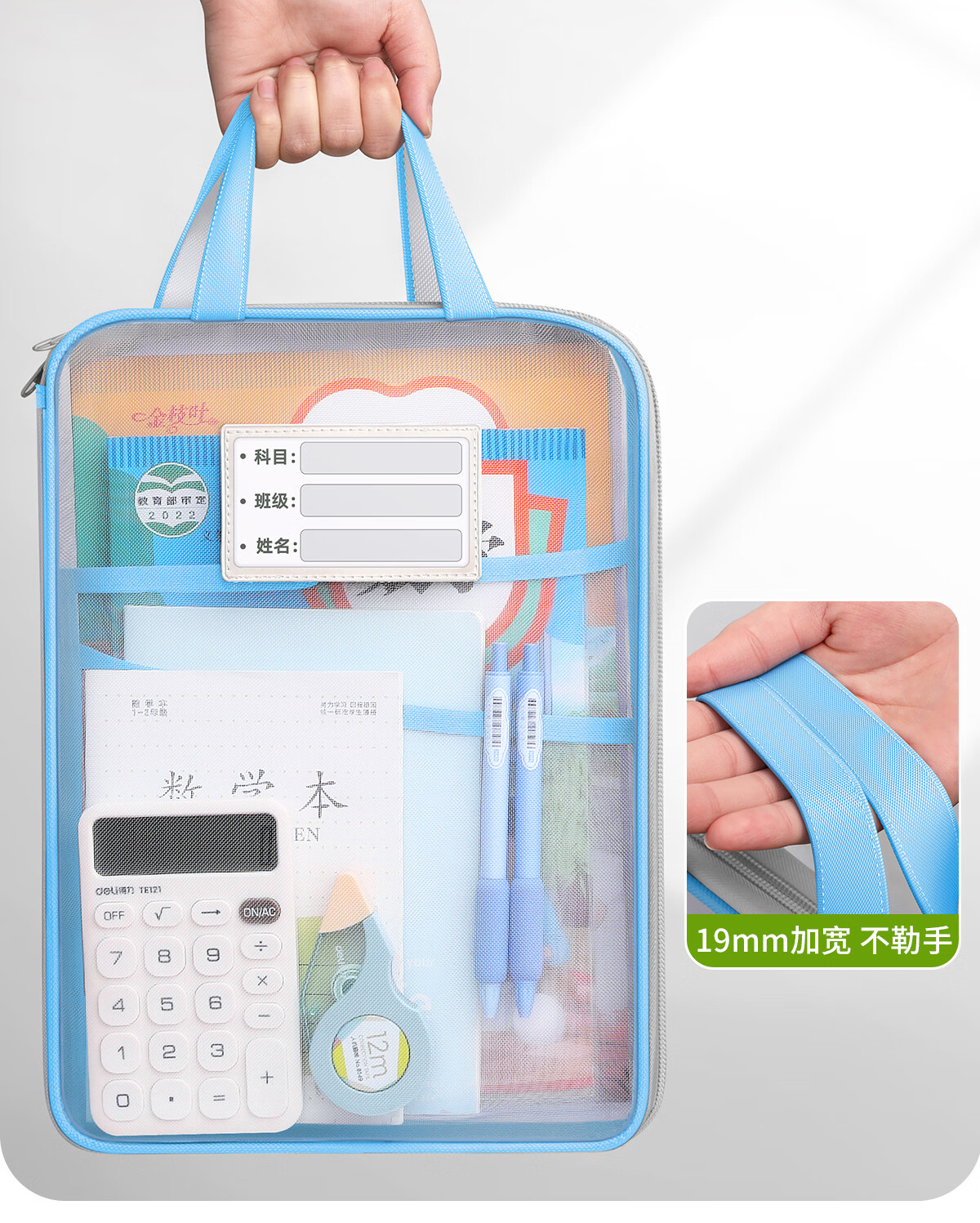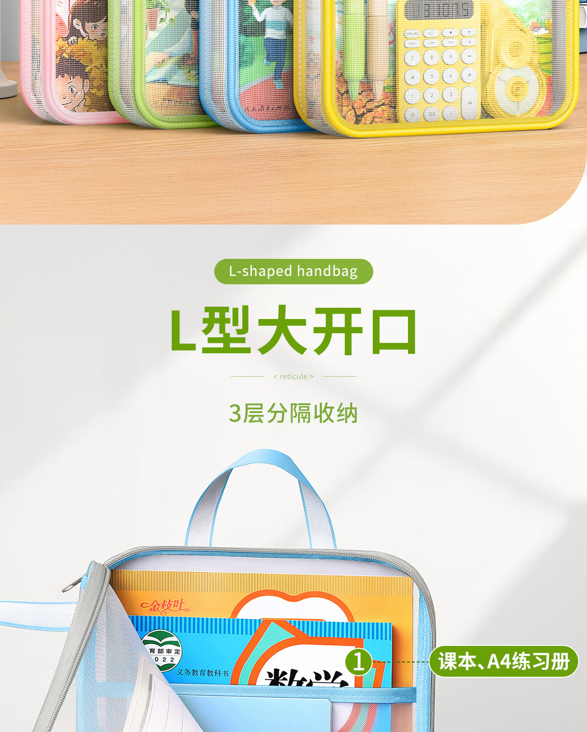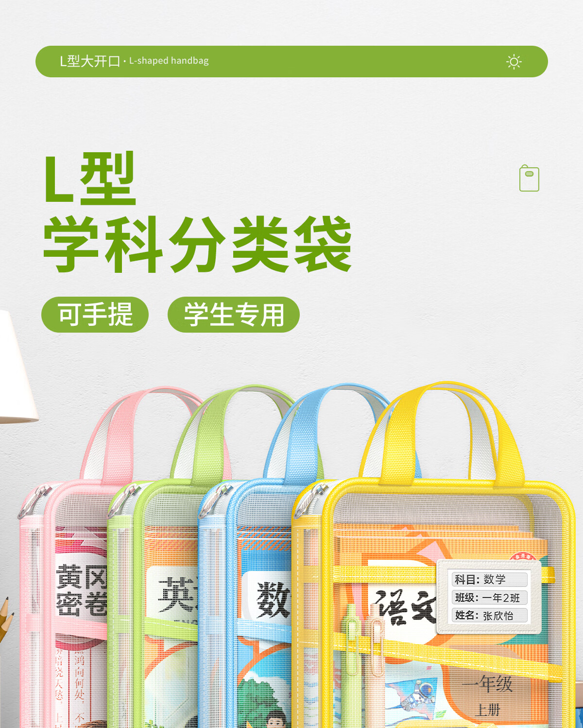思赞L型科目分类袋透明文件袋拉链式小学生网纱大开口手提拎书袋考试专用袋子补习袋档案袋试卷收纳袋I 4个装【蓝绿黄粉】3层加厚/送标签