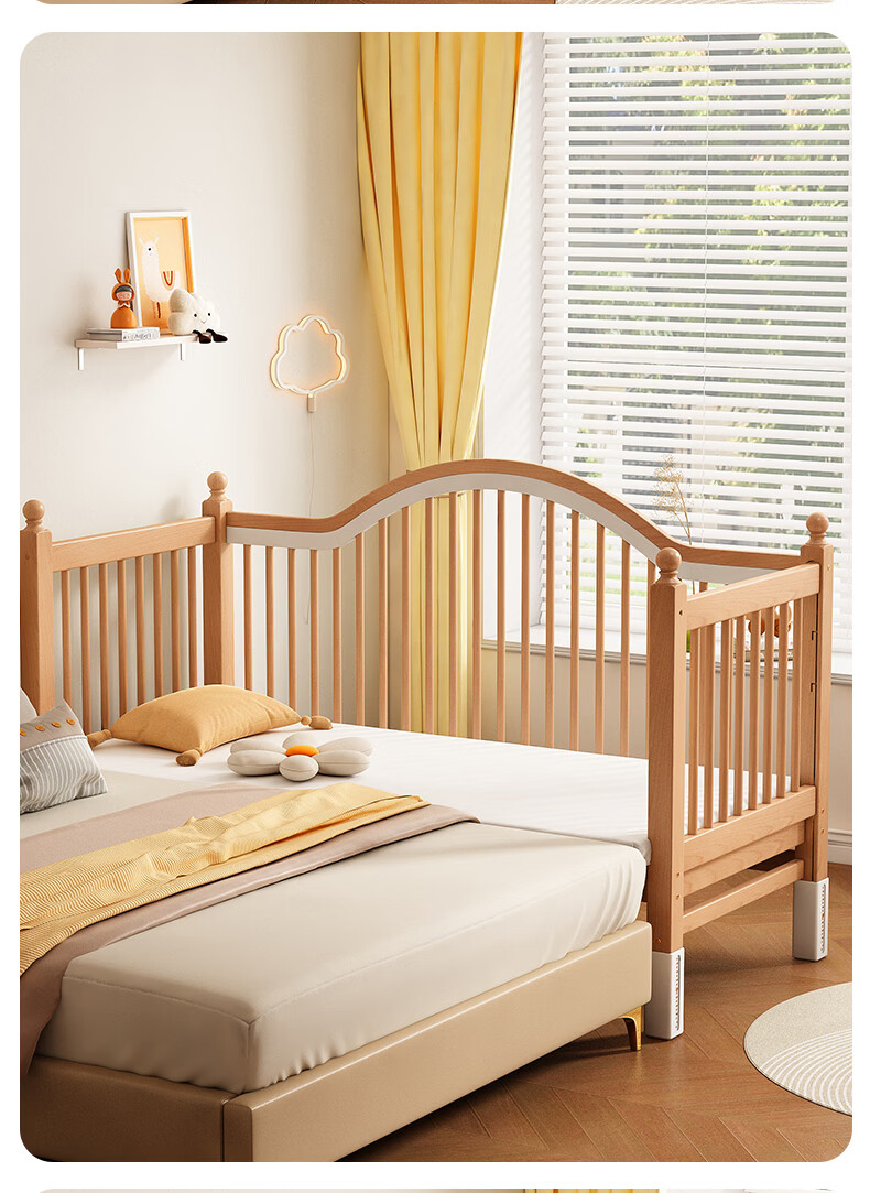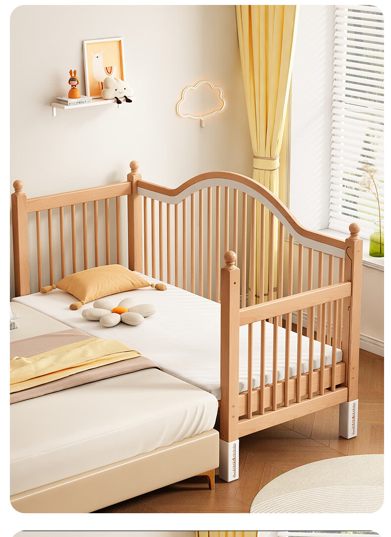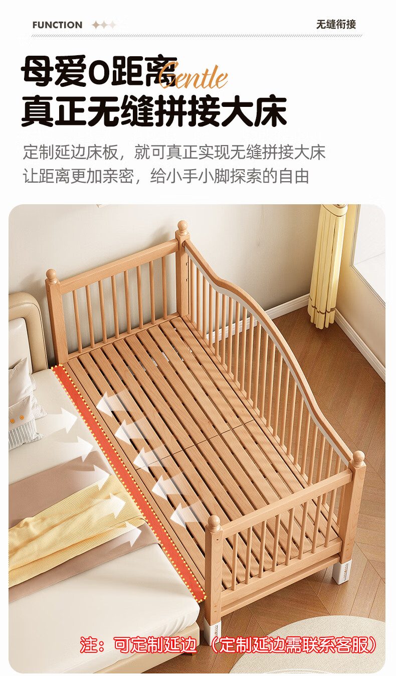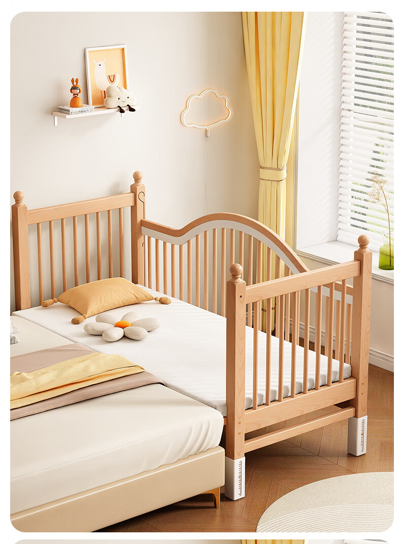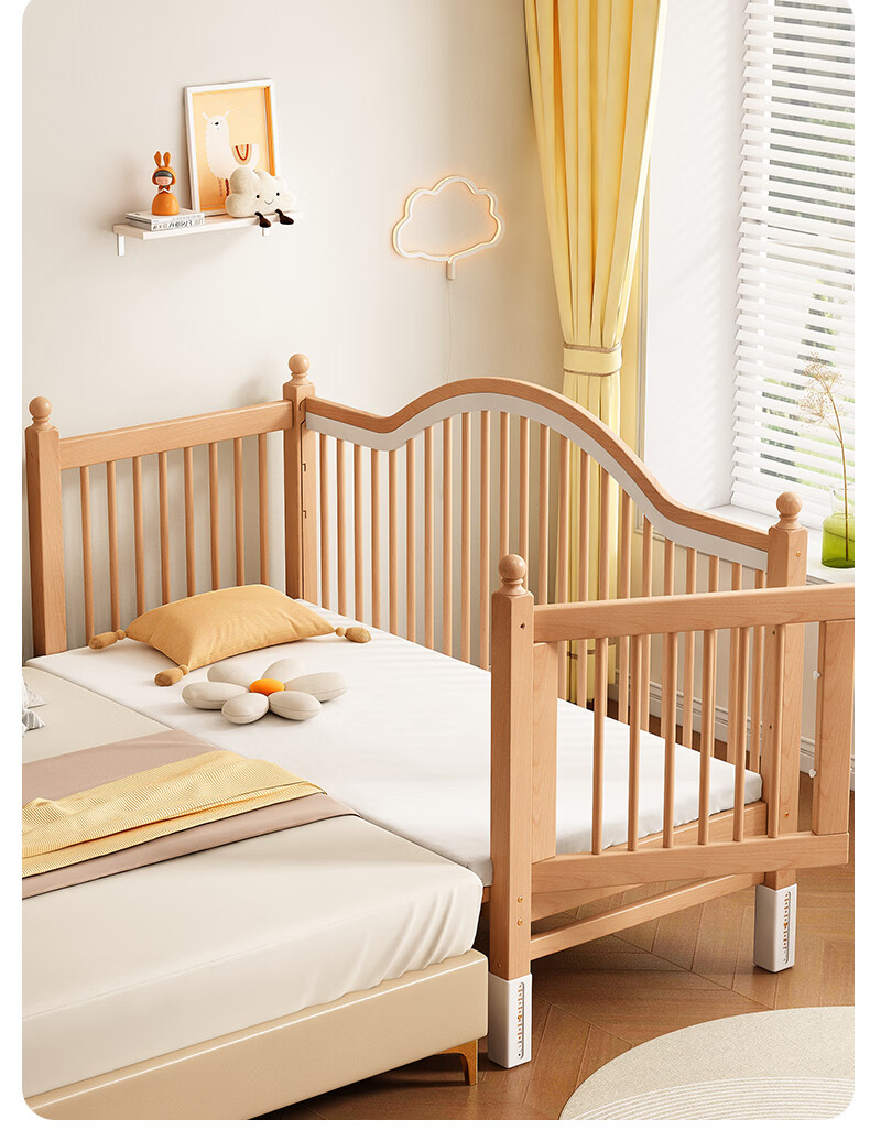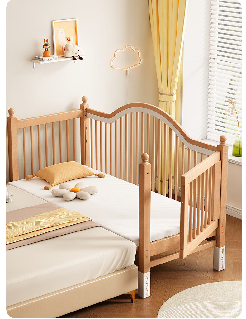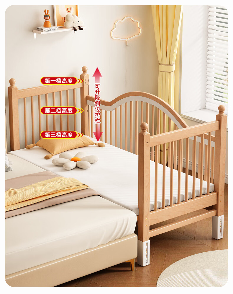 贝幸福 BAYLUCK榉木拼接床婴儿床实木儿童床加宽小孩床边床加高护栏可升降儿童床 单床(三面护栏)+10cm可拆洗空气纤维垫+纯棉床围 200*100CM【侧面升降+尾部带门 全榉木】