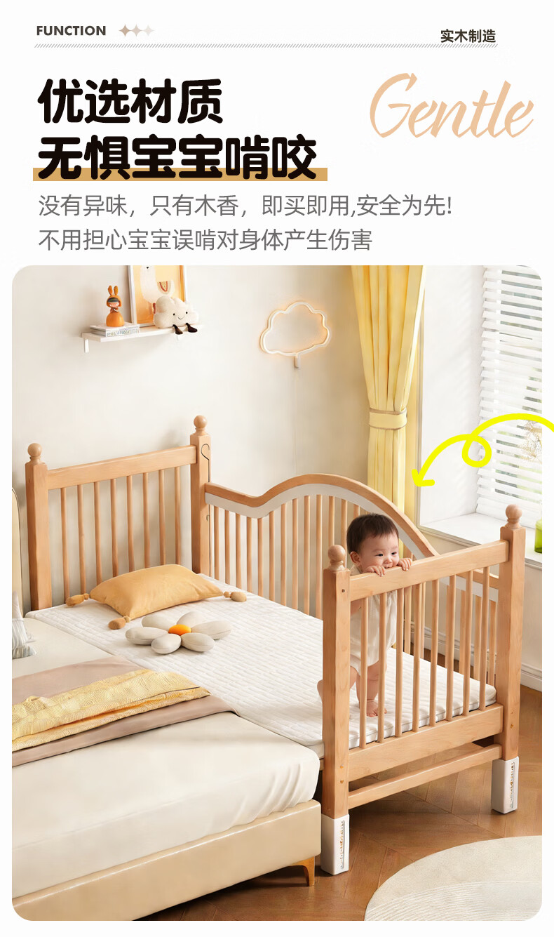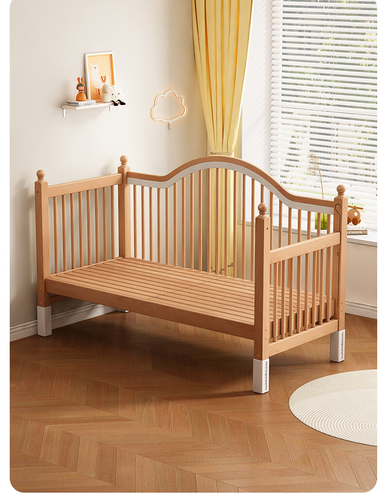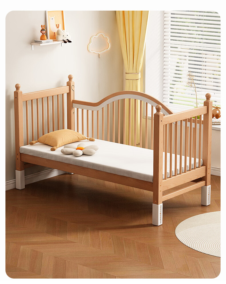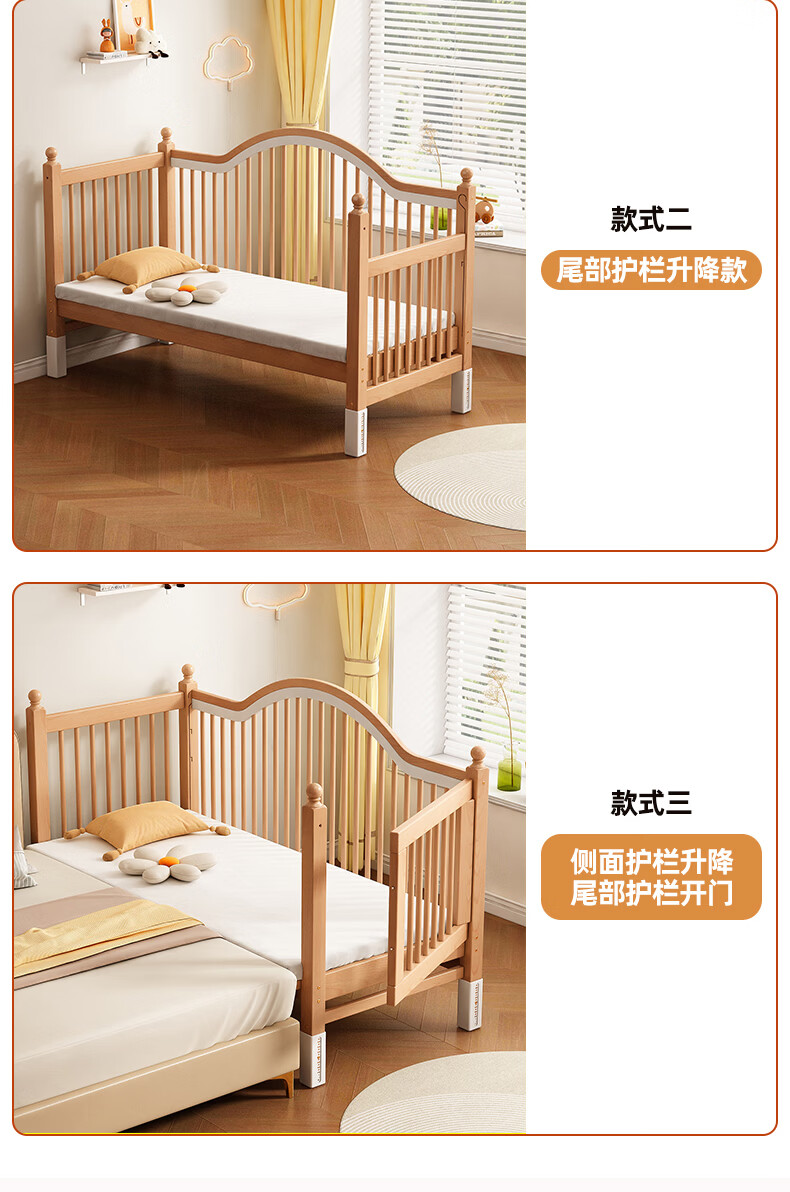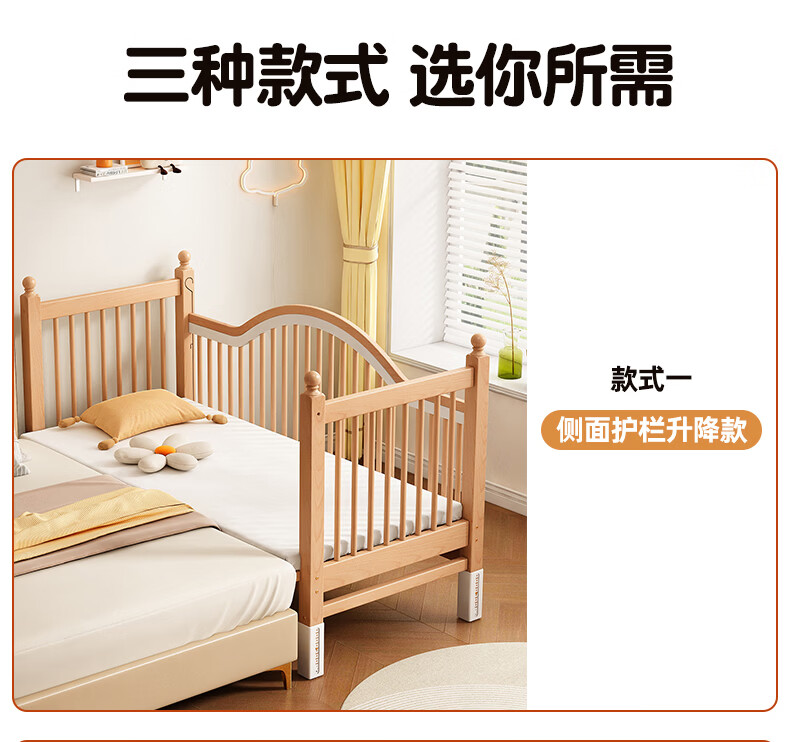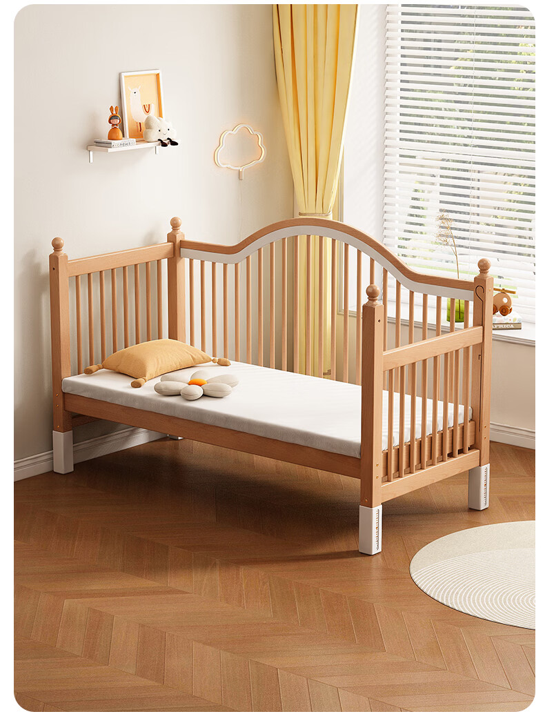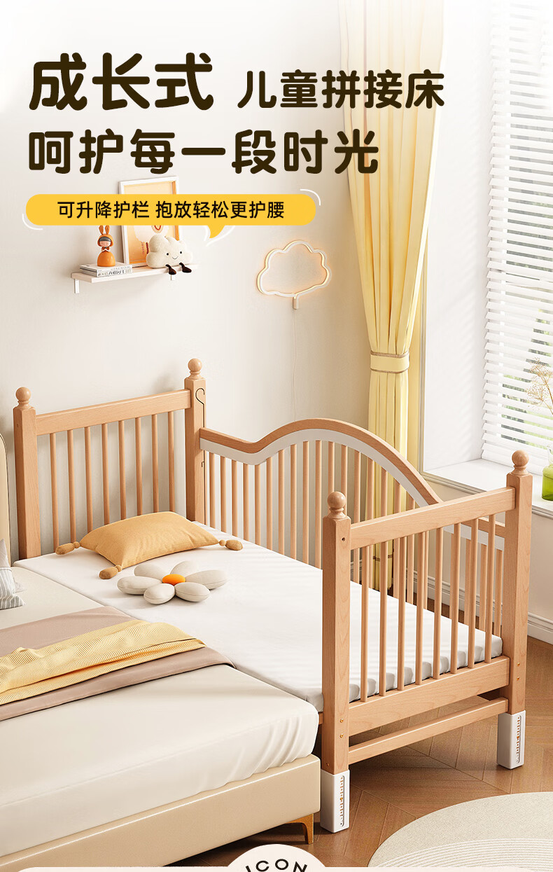 贝幸福 BAYLUCK榉木拼接床婴儿床实木儿童床加宽小孩床边床加高护栏可升降儿童床 单床(三面护栏)+10cm可拆洗空气纤维垫+纯棉床围 200*100CM【侧面升降+尾部带门 全榉木】
