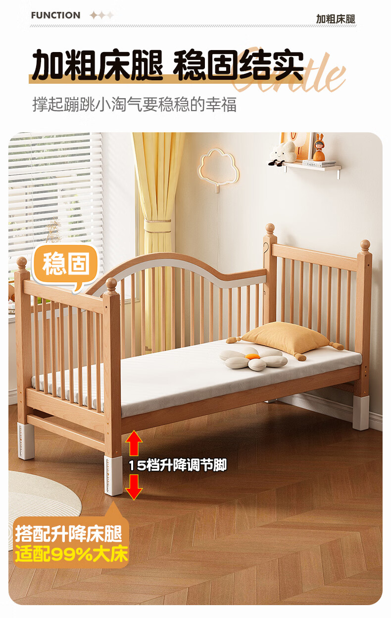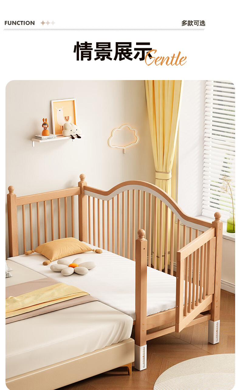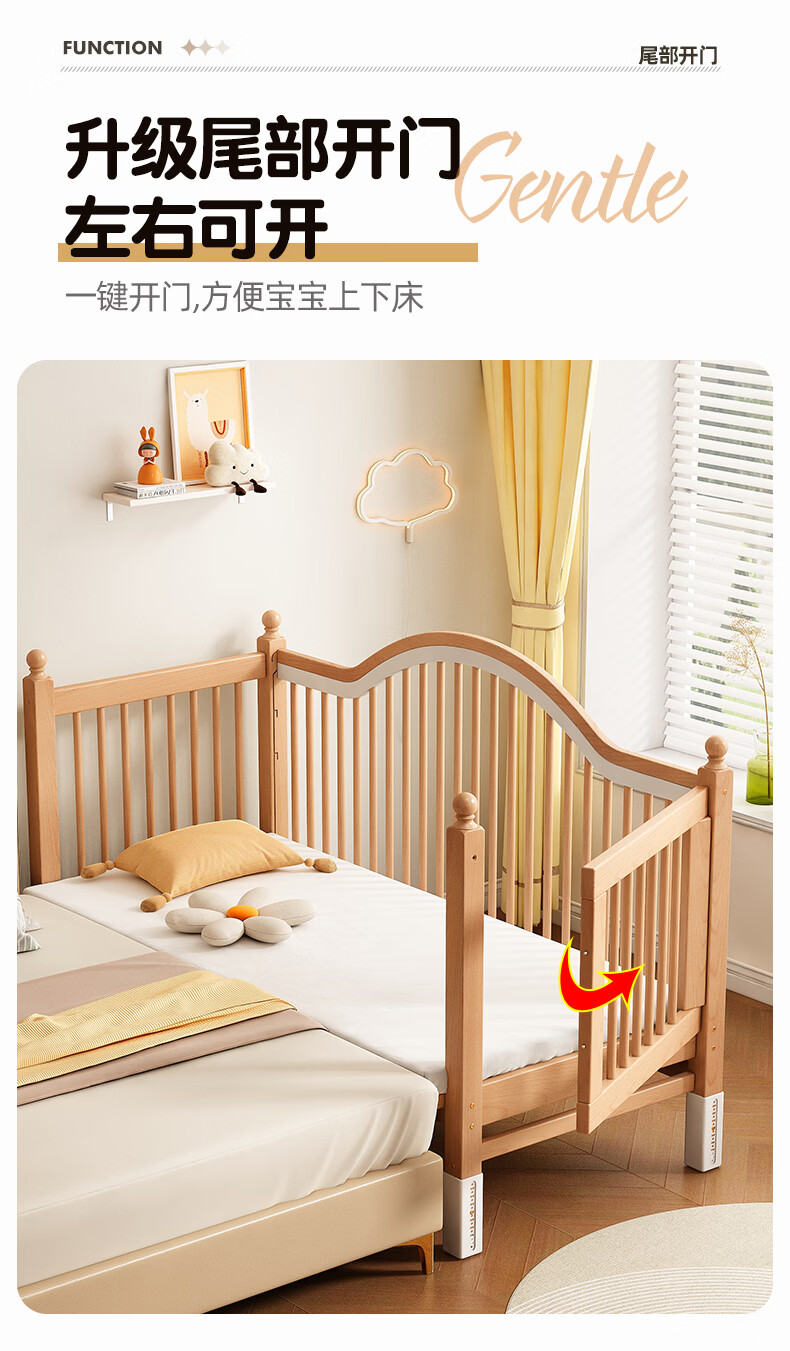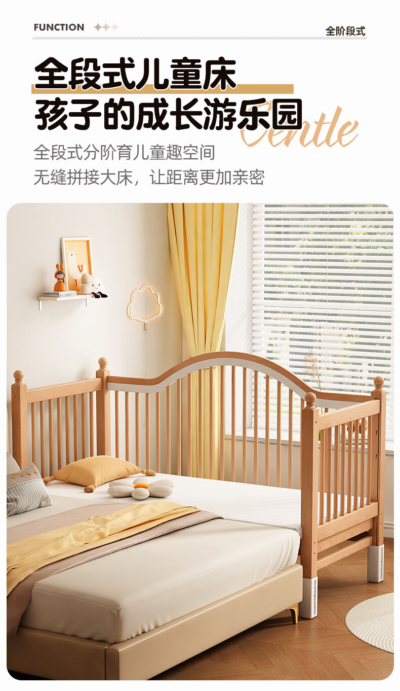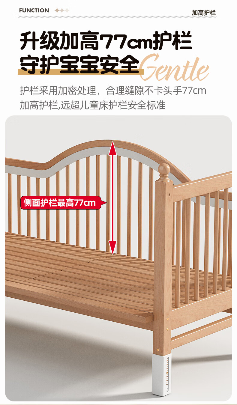 贝幸福 BAYLUCK榉木拼接床婴儿床实木儿童床加宽小孩床边床加高护栏可升降儿童床 单床(三面护栏)+10cm可拆洗空气纤维垫+纯棉床围 200*100CM【侧面升降+尾部带门 全榉木】