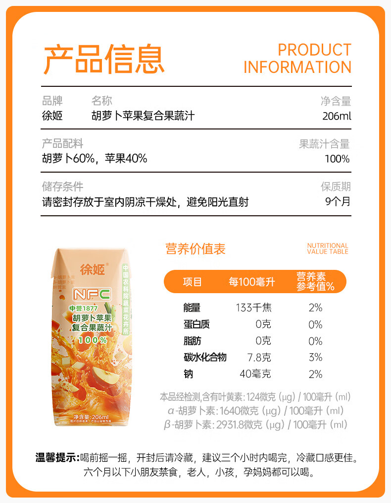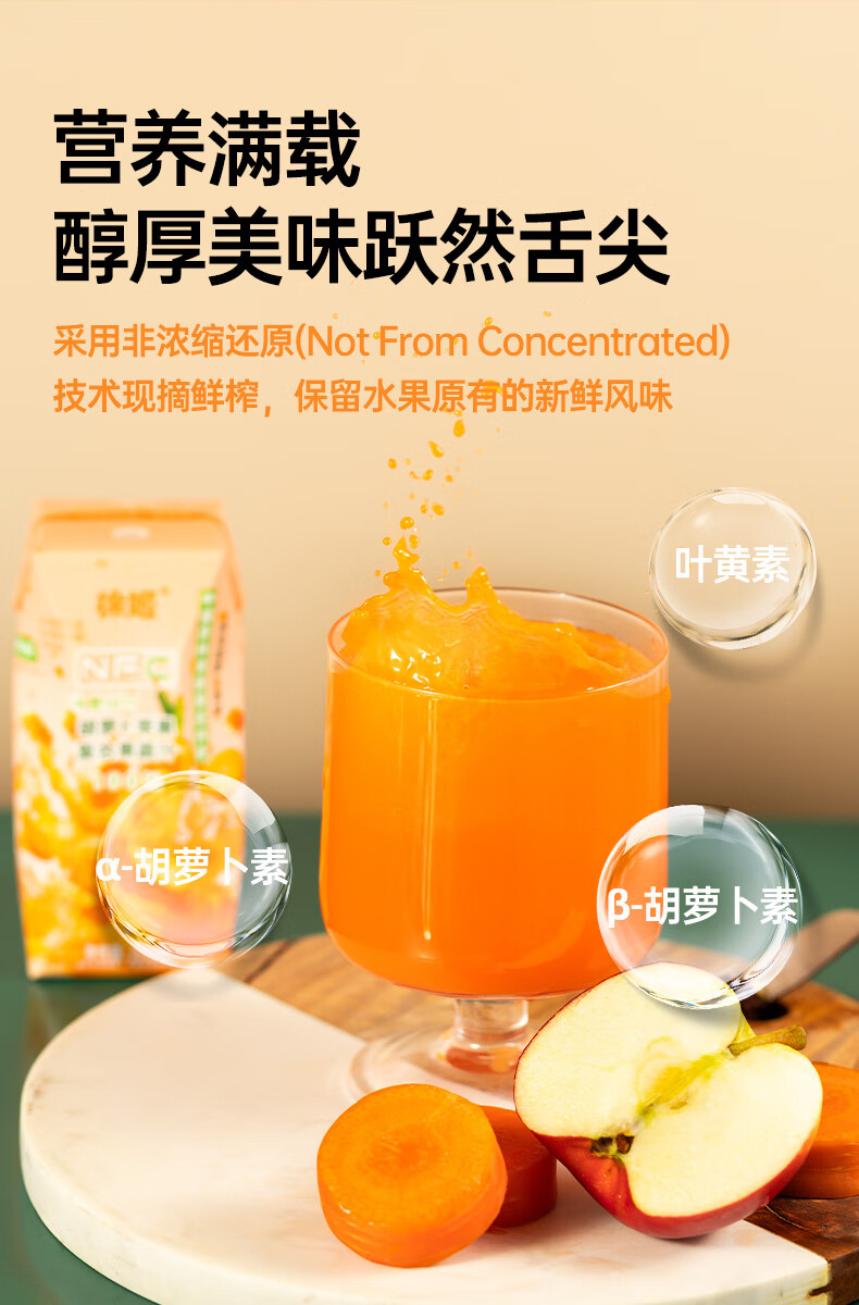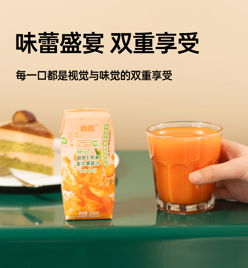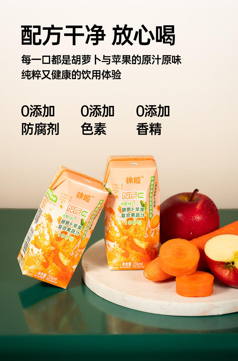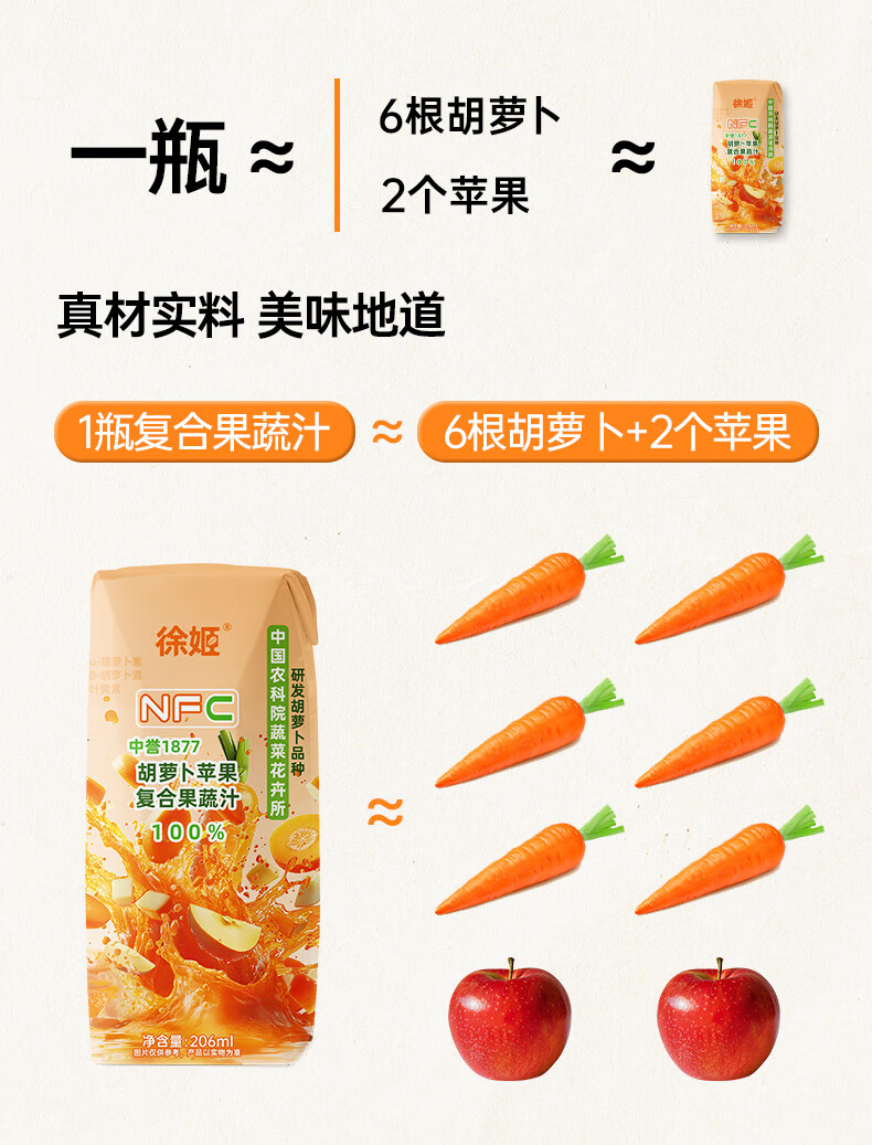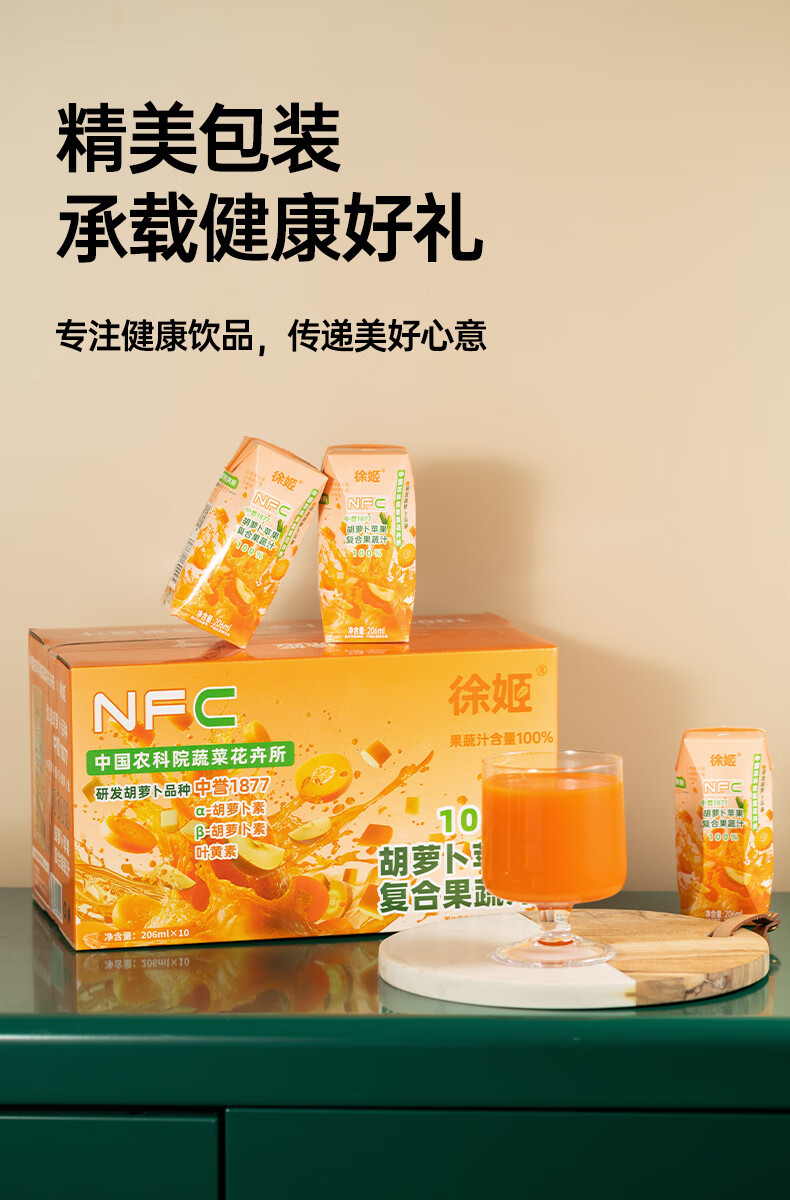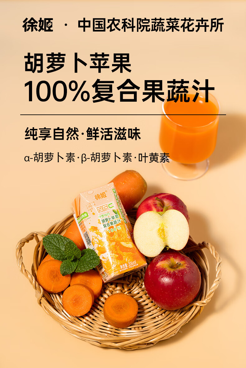 徐姬中国农科院NFC胡萝卜苹果汁100%纯果蔬汁果汁饮料送礼整箱年货节 100%胡萝卜苹果汁 206g*10盒