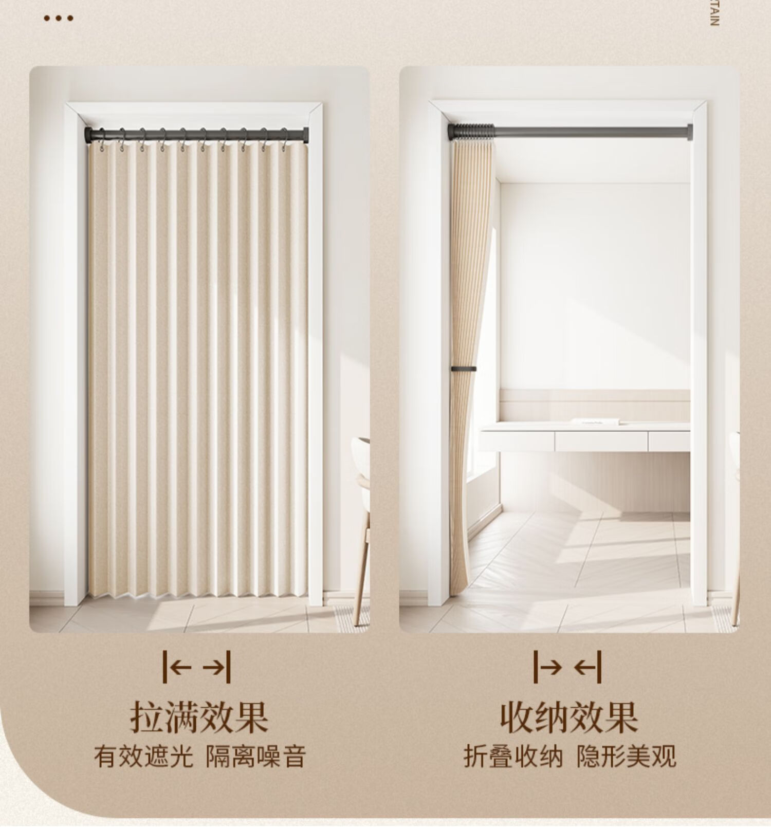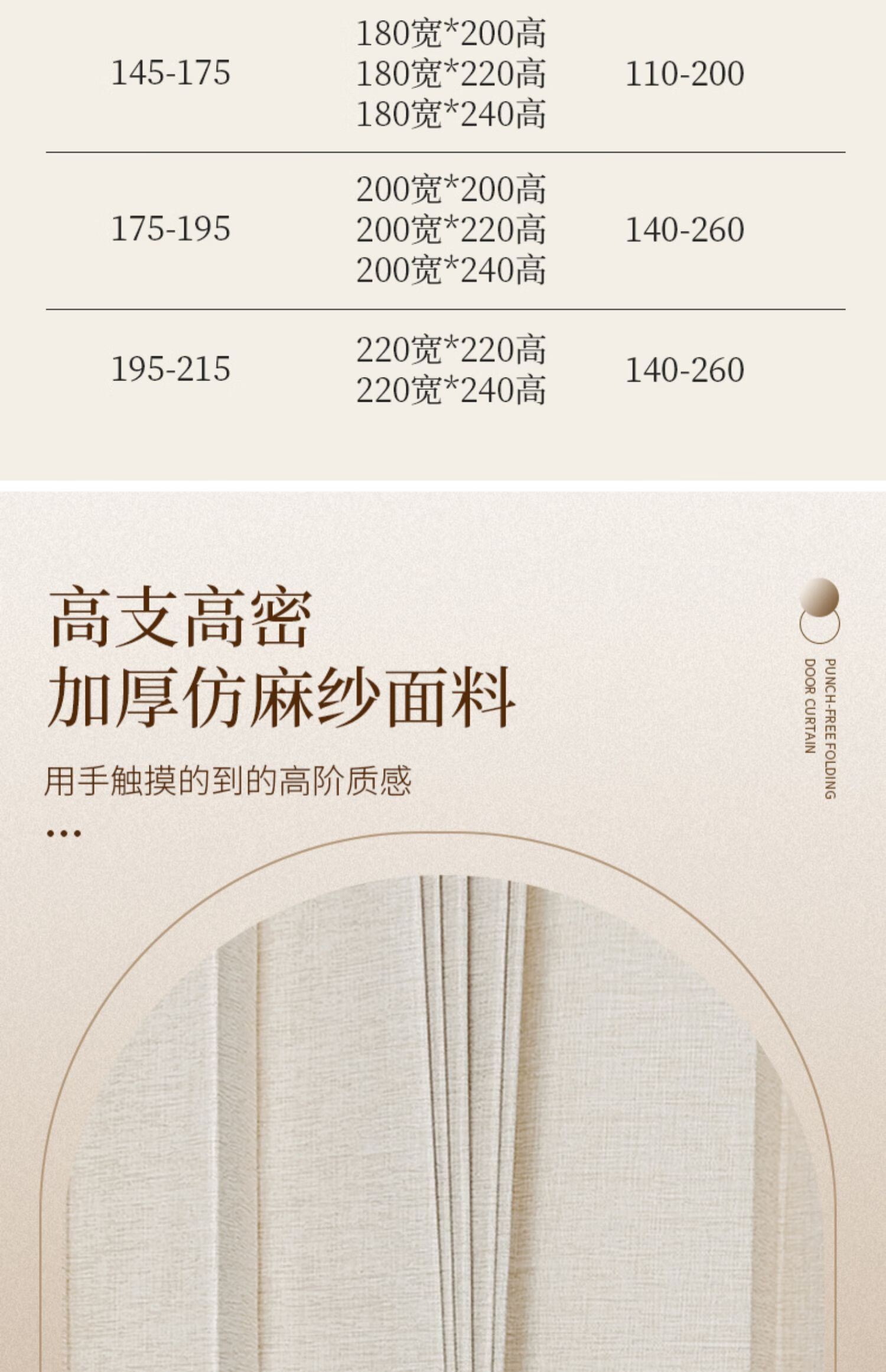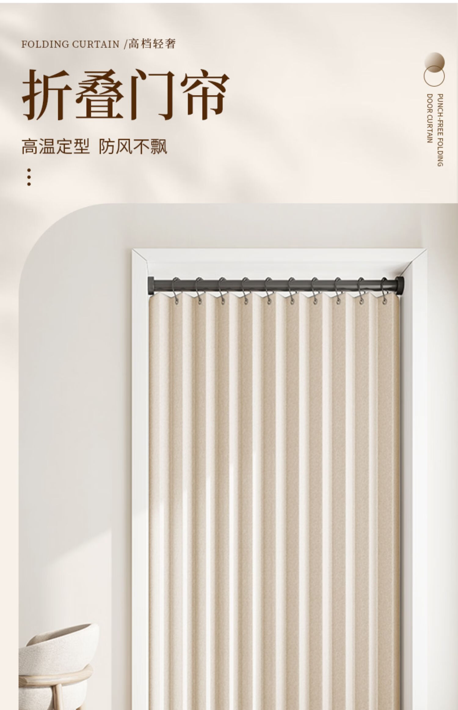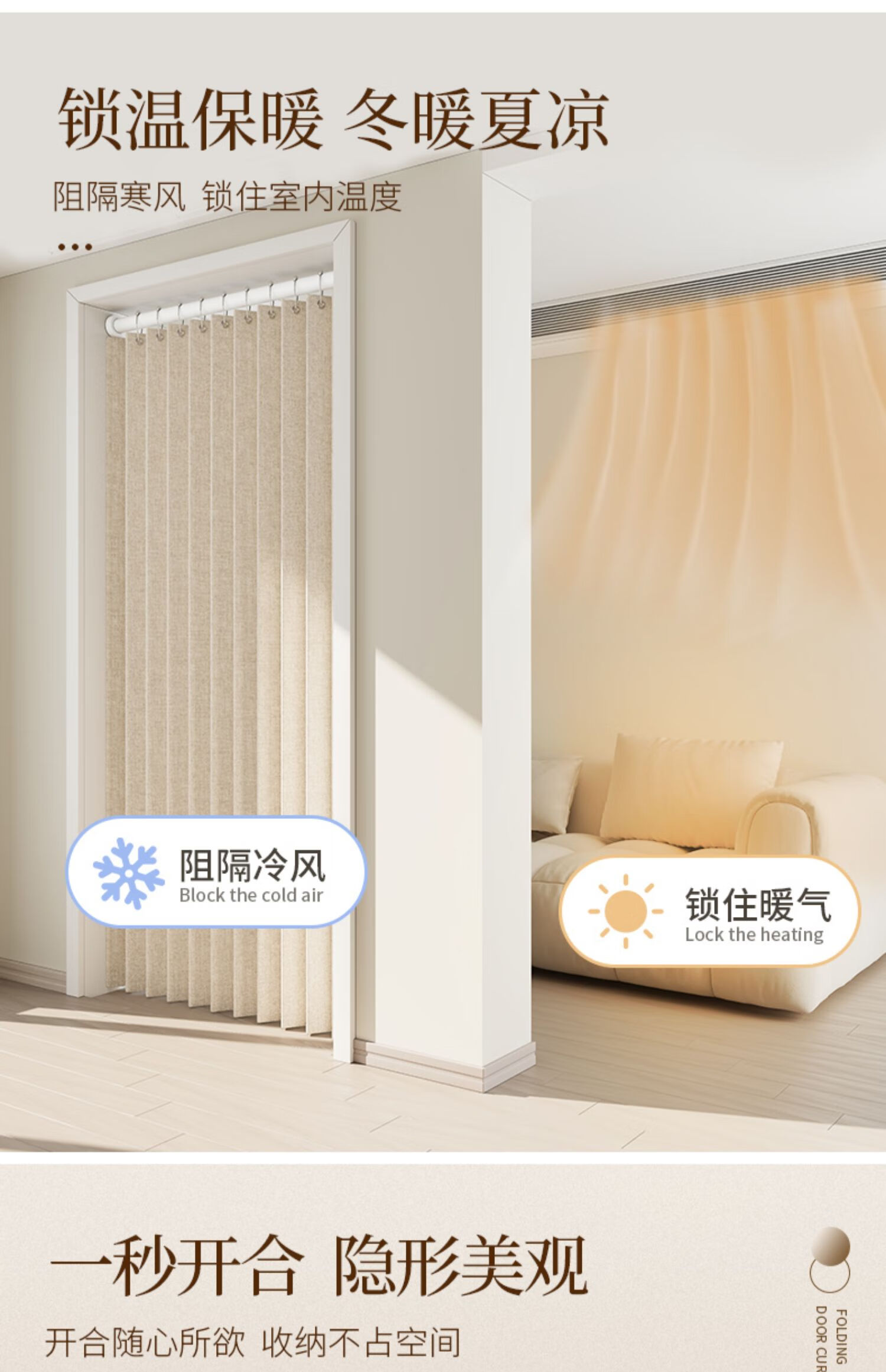 施香曼定制折叠门帘阻风风热加厚隔断帘卧室厨房遮挡帘免打孔家用简约 暖米色单帘 [适用175-195墙宽]200宽*200