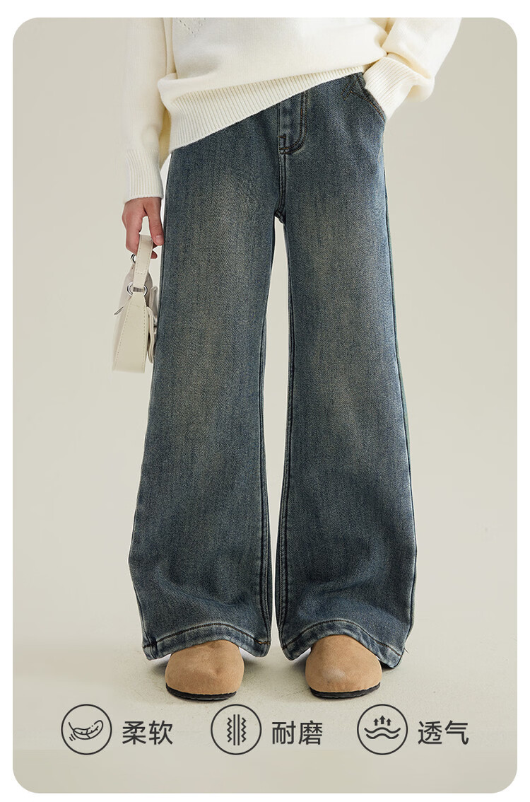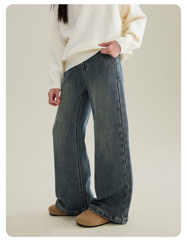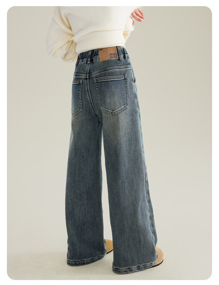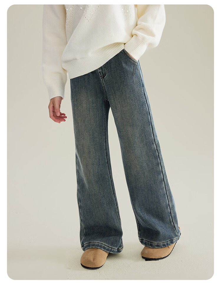 媛媛公主女童加绒牛仔裤冬新款儿童裤子中大童加厚阔腿裤百搭保暖直筒长裤 牛仔蓝 110