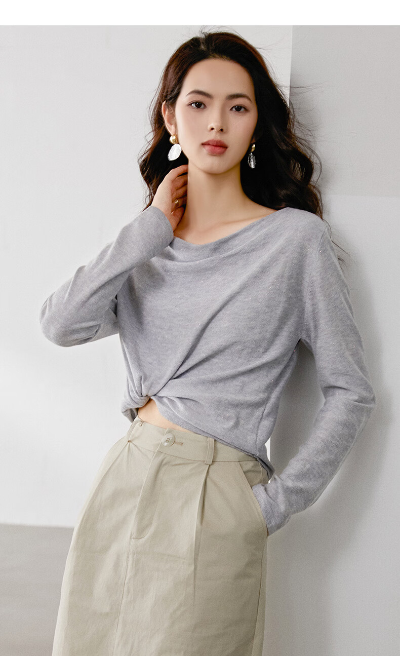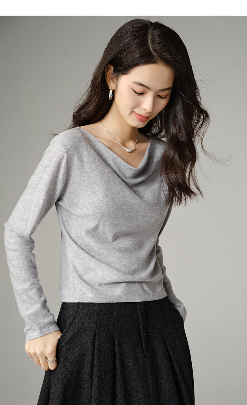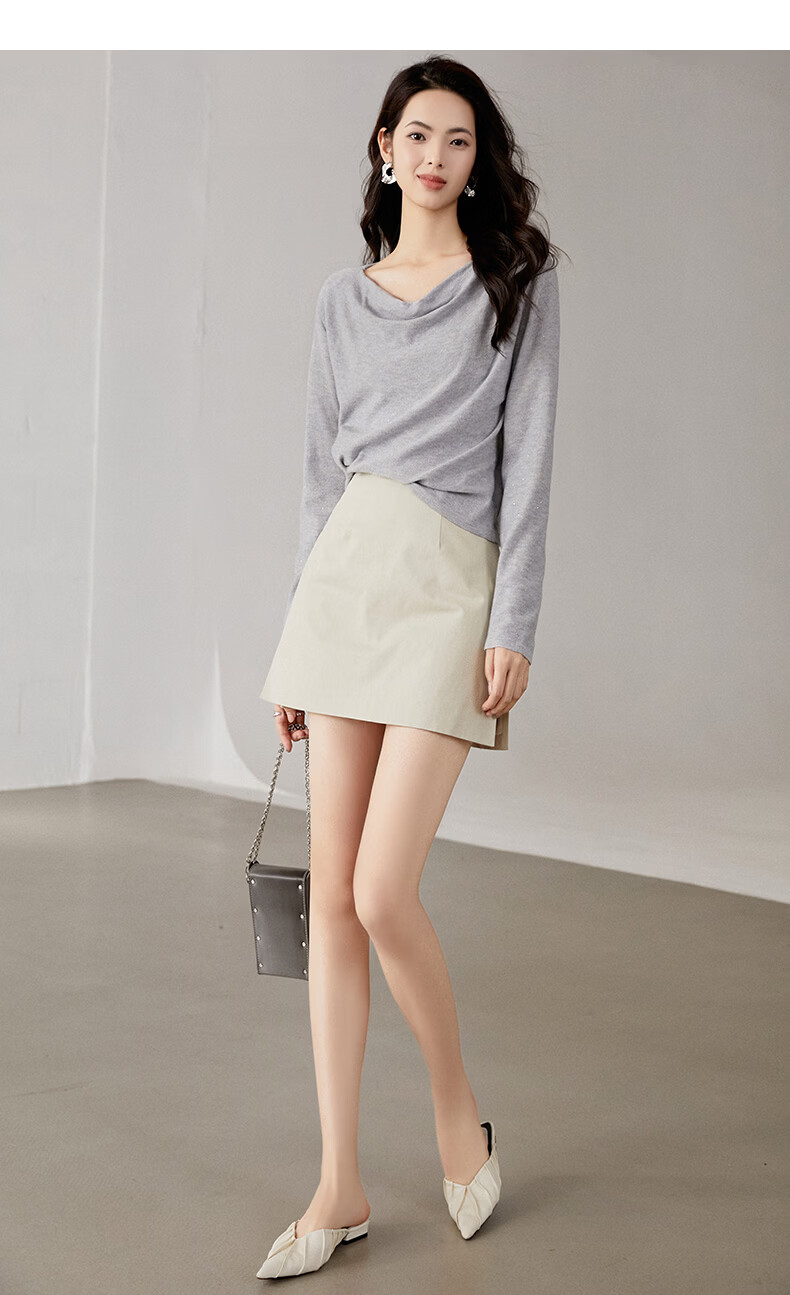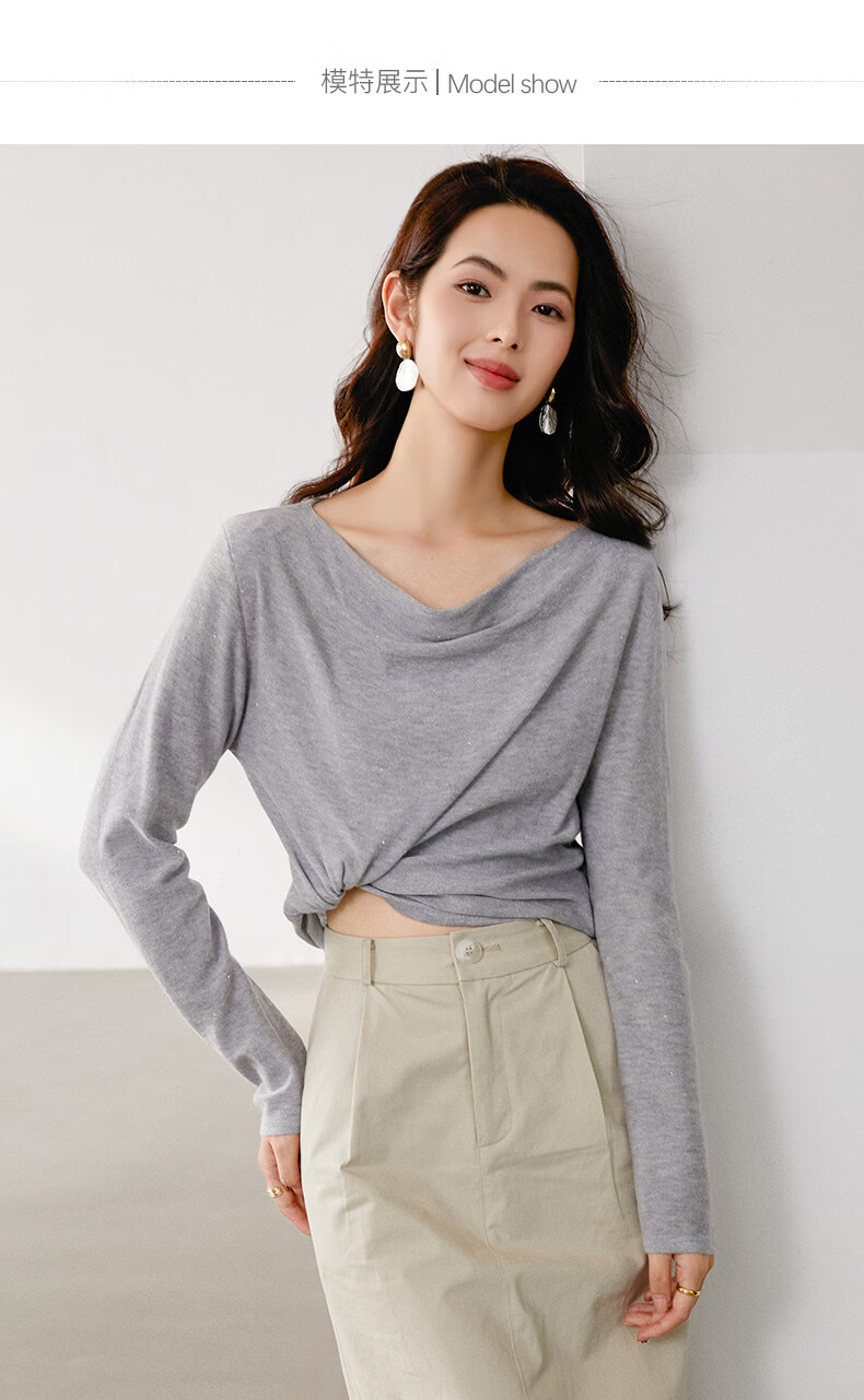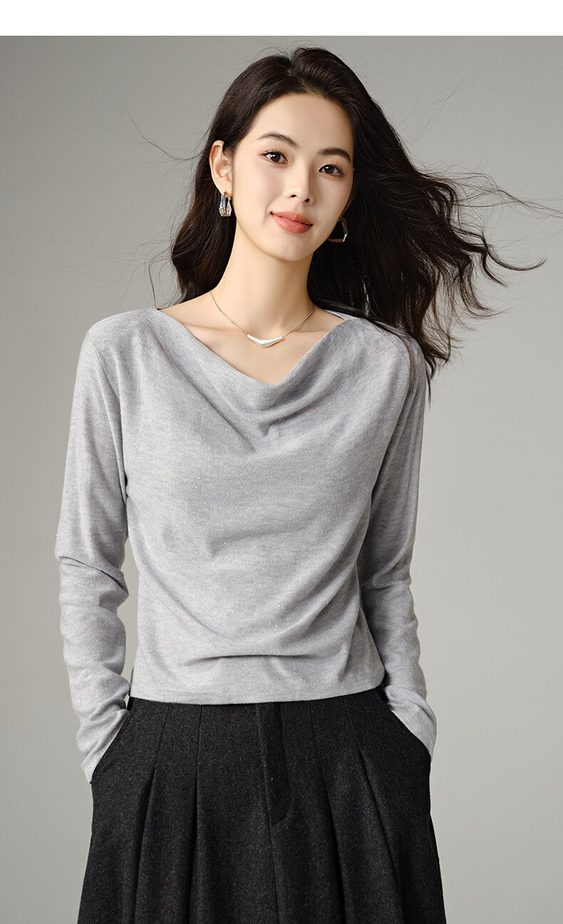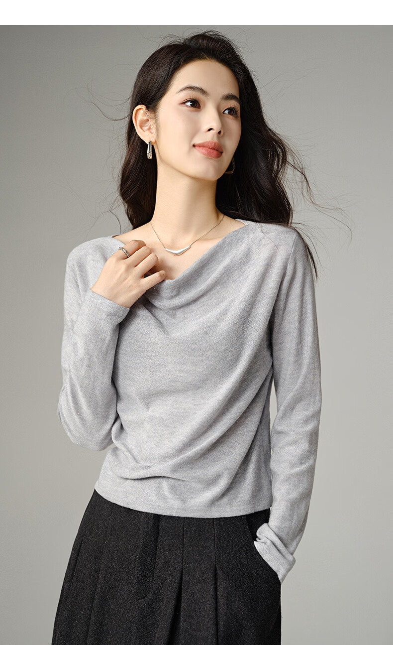 晚白【断码清仓】2026春款时尚优雅荡领毛衣亲肤柔软修身舒适针织衫女 灰色 M