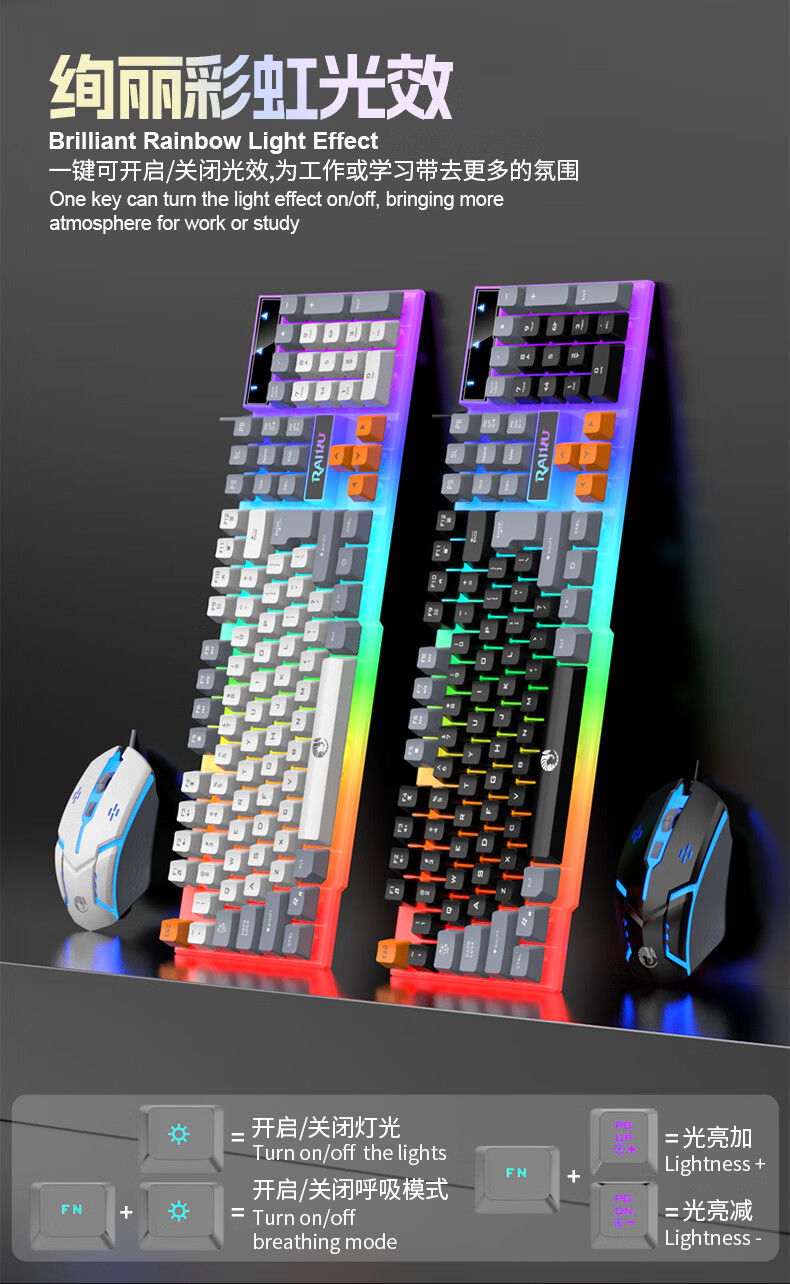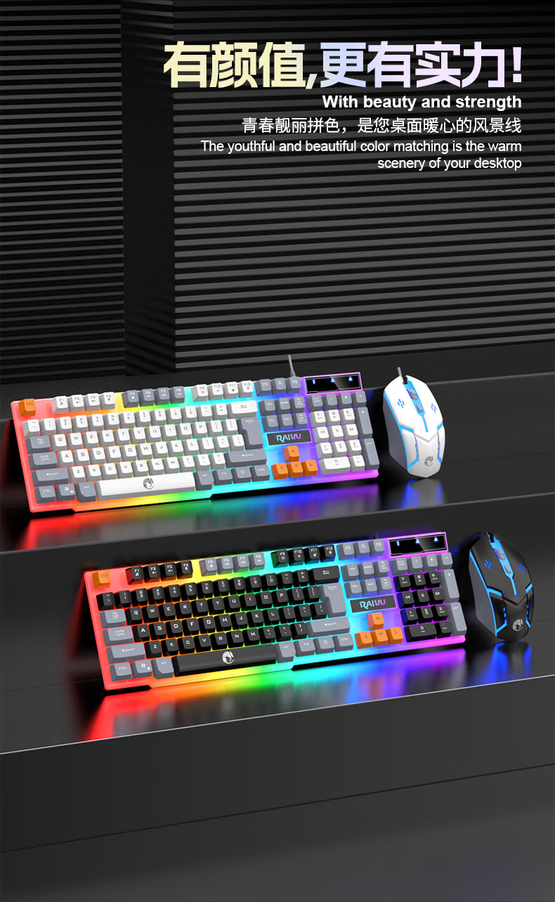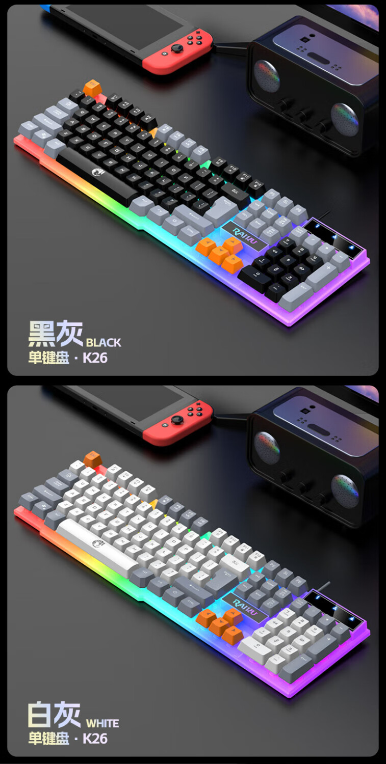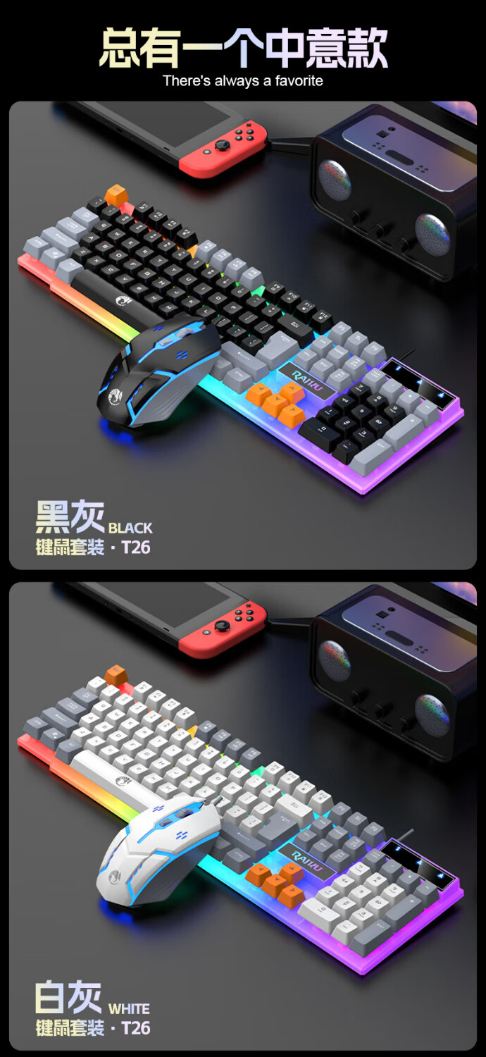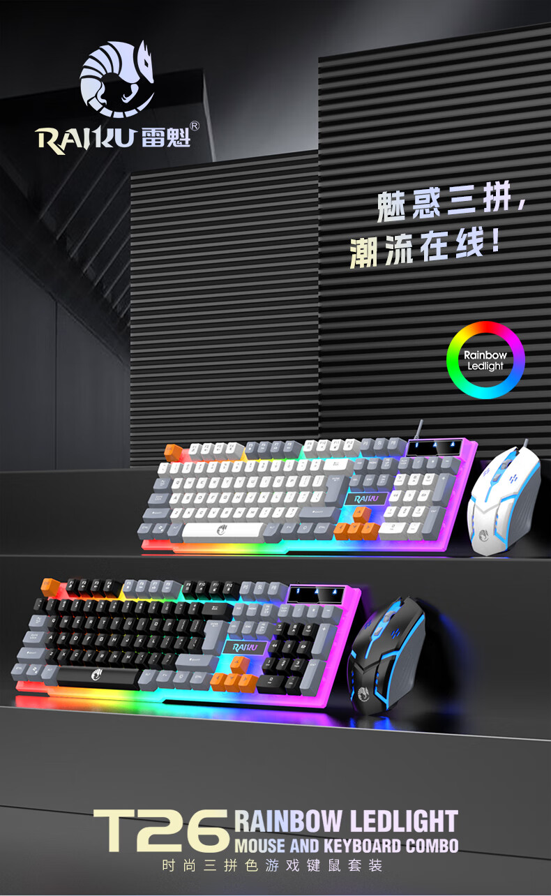 雷魁有线USB键盘鼠标套装游戏电竞笔记本电脑家用炫光时尚魅惑三拼色悬浮键帽多媒体按键机械手感雷魁 键鼠套装【机械手感三拼色背光】T26_黑灰