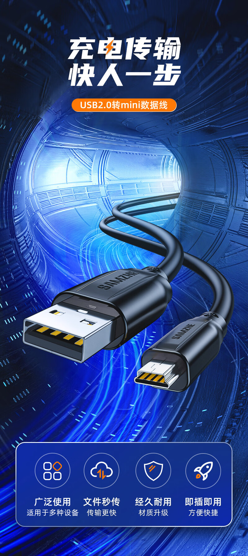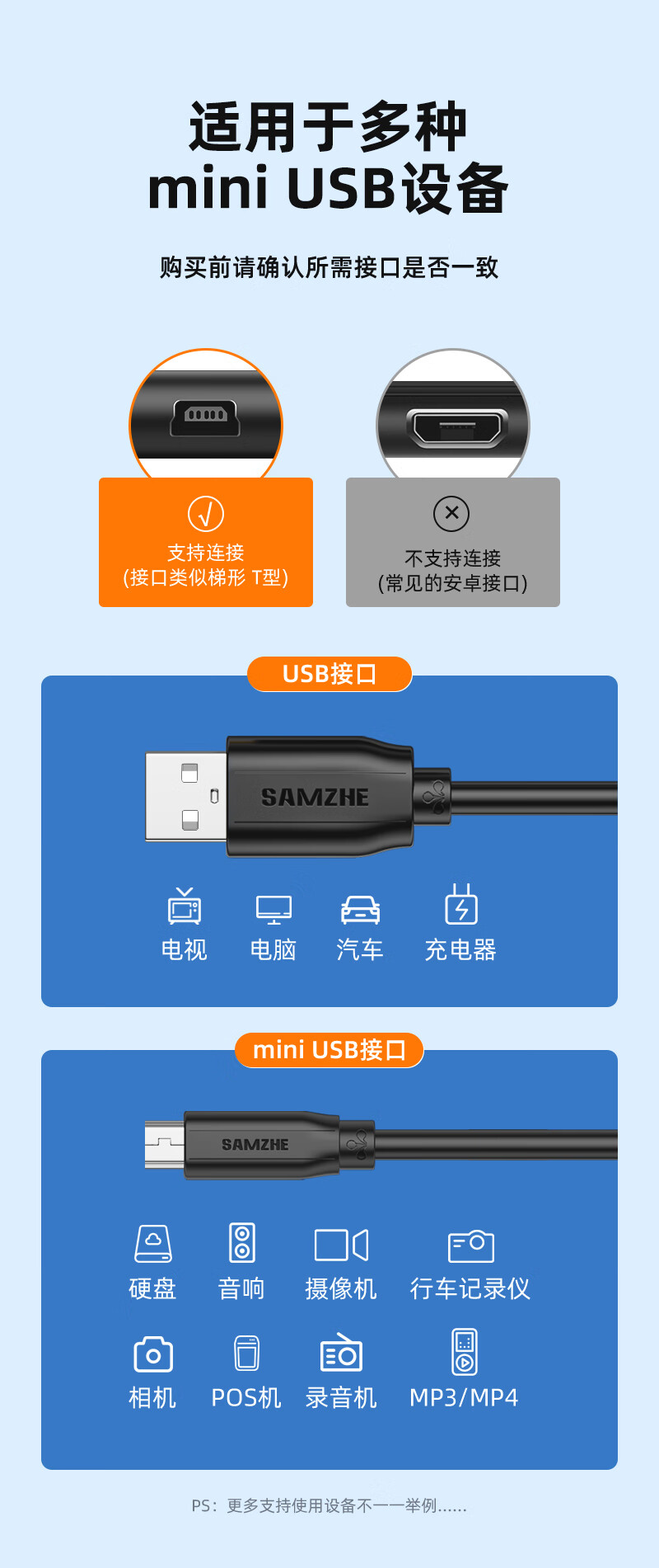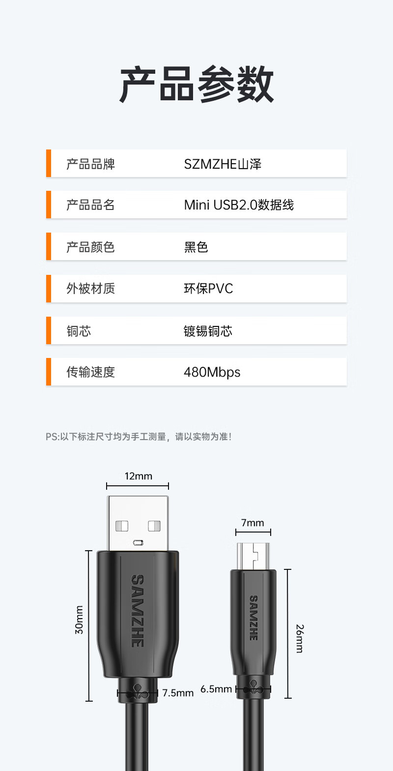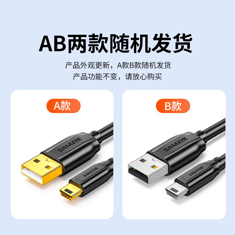 山泽USB2.0转Mini USB数据线0.5米T型口充电连接线适用于平板移动硬盘行车记录仪数码相机摄像机UBR05