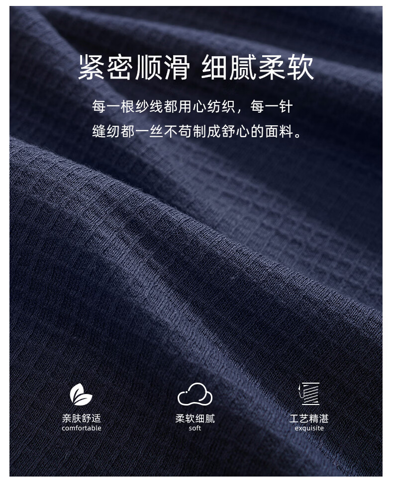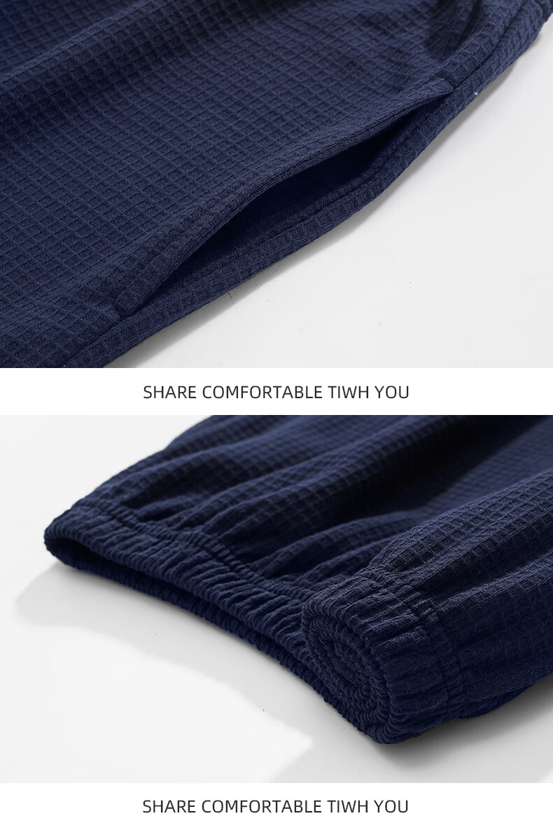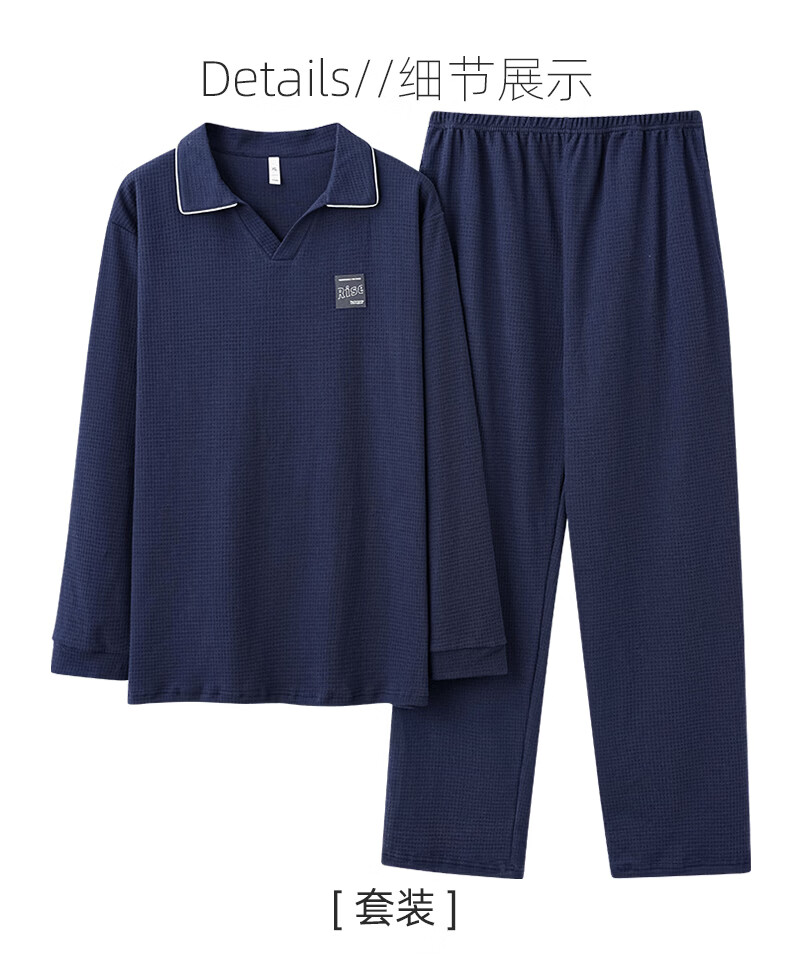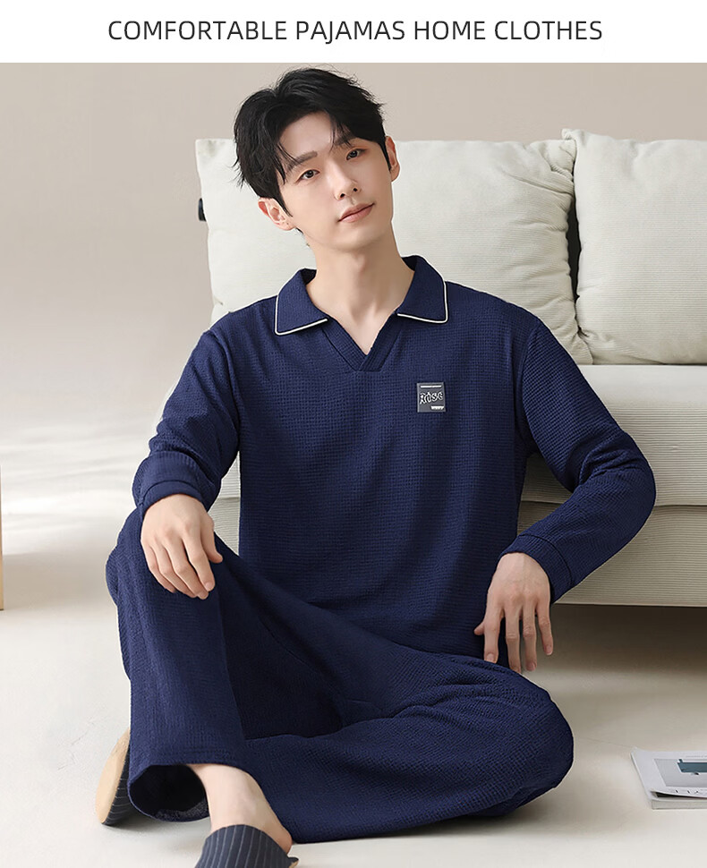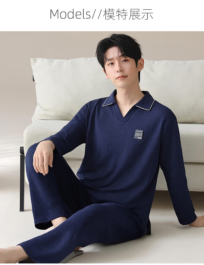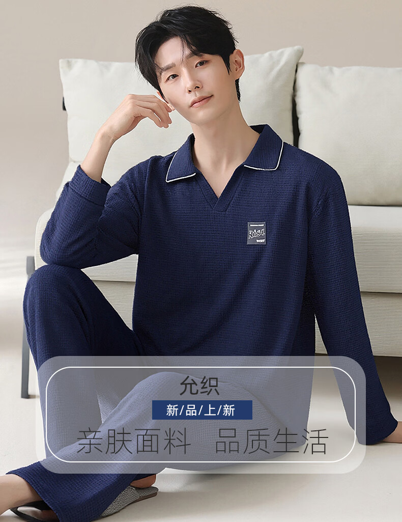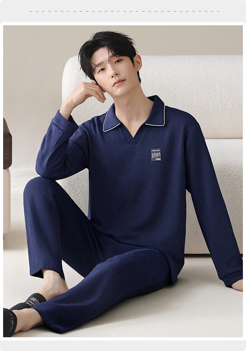 允织华夫格纯棉睡衣男春秋季新款长袖男士睡裤可外穿家居服秋冬天套装 8615-宝蓝 L (170) :建议100-135斤穿着