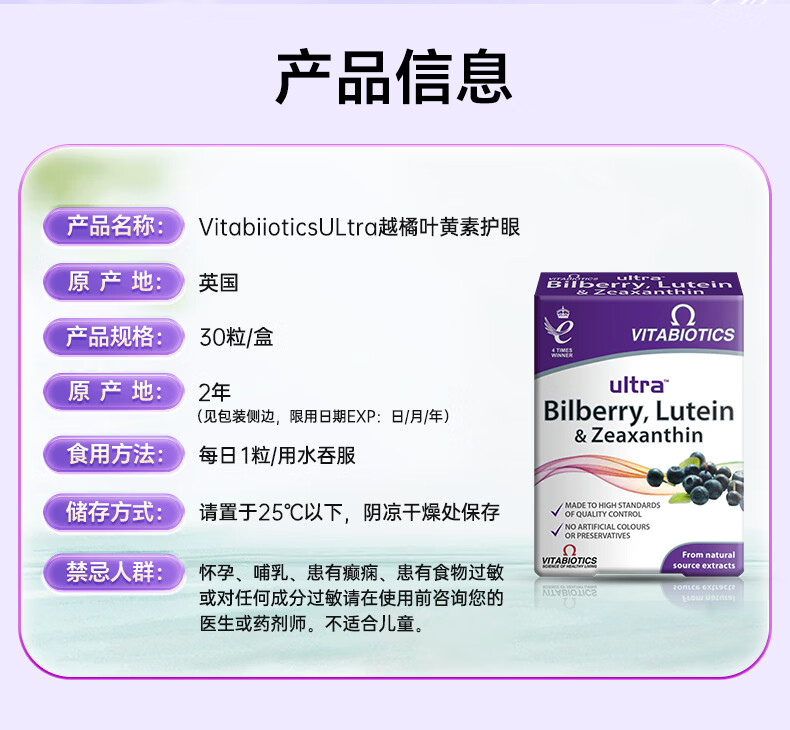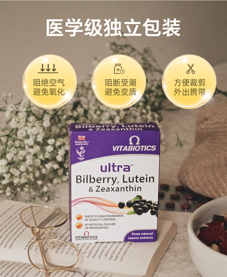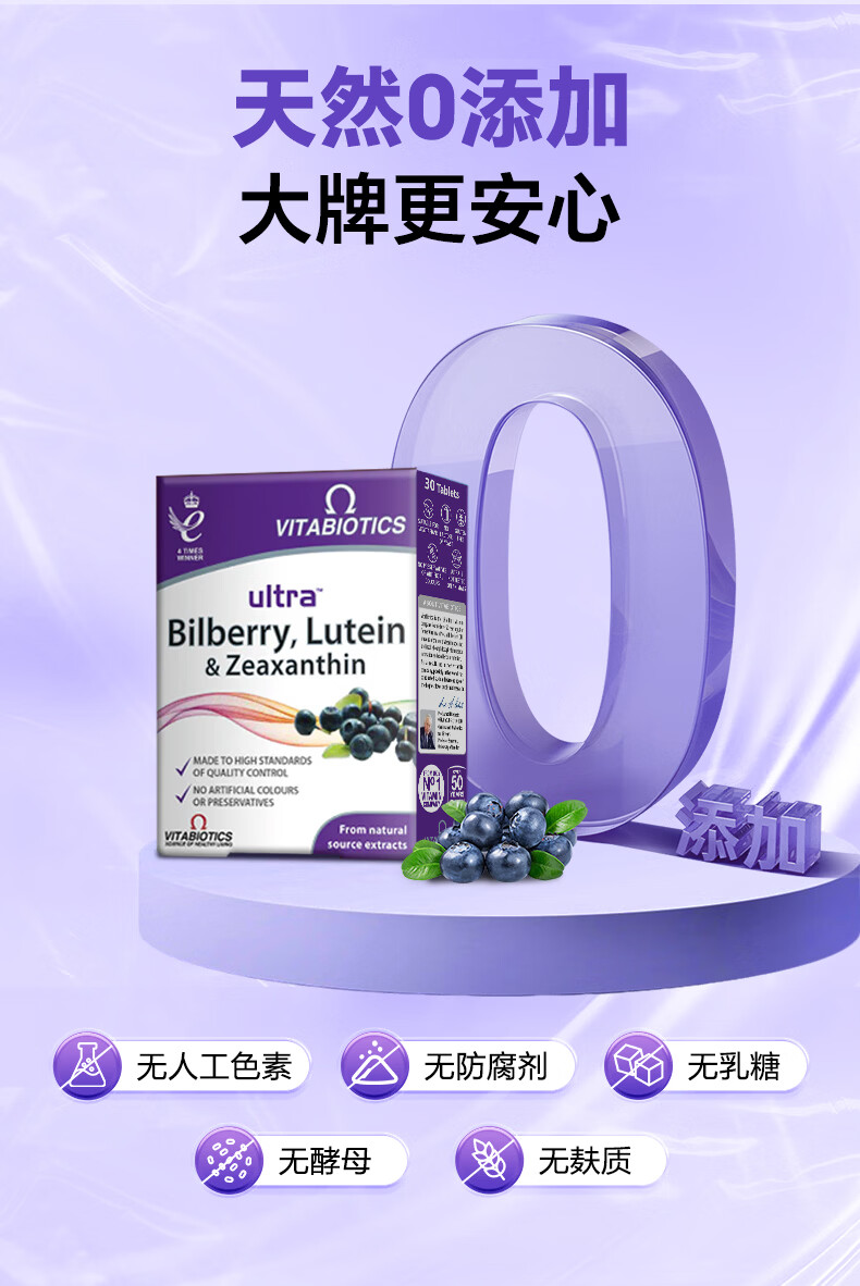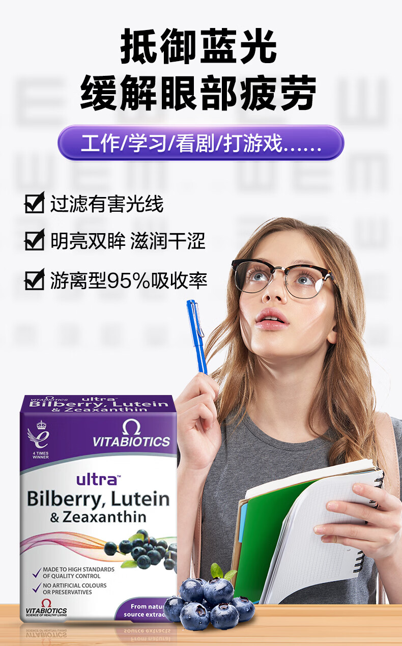 VITABIOTICS薇塔贝尔叶黄素成人护眼片越橘玉米黄质护视力【26年8月到期】 【明亮双眸】叶黄素 30片*1盒