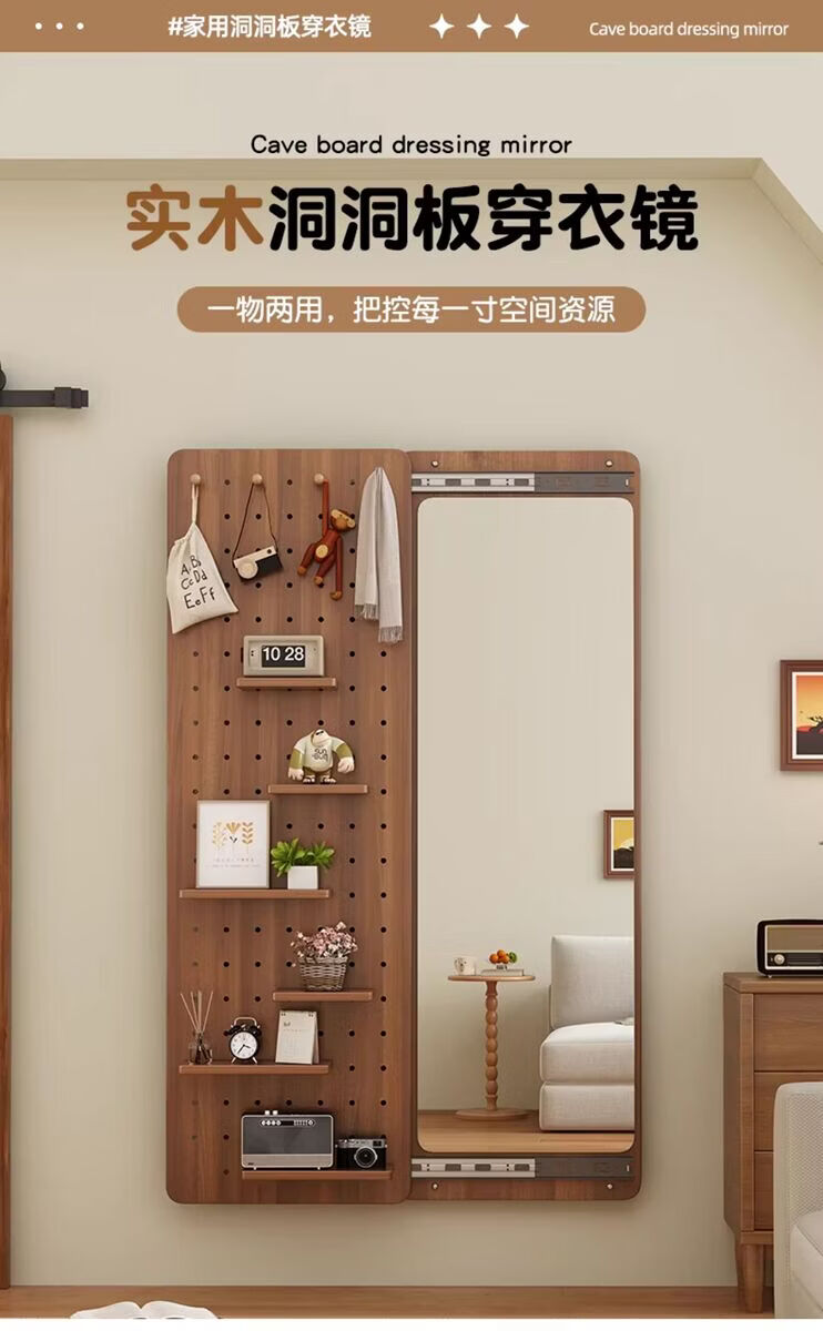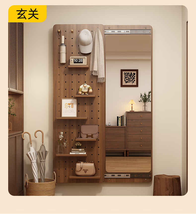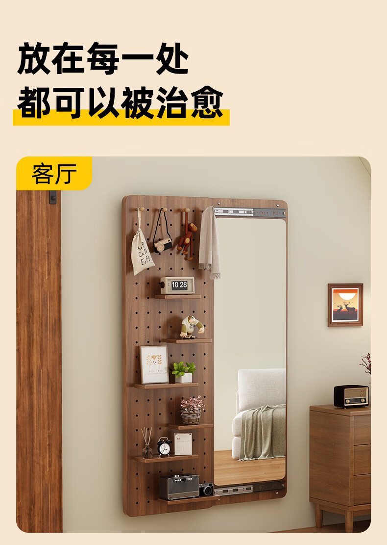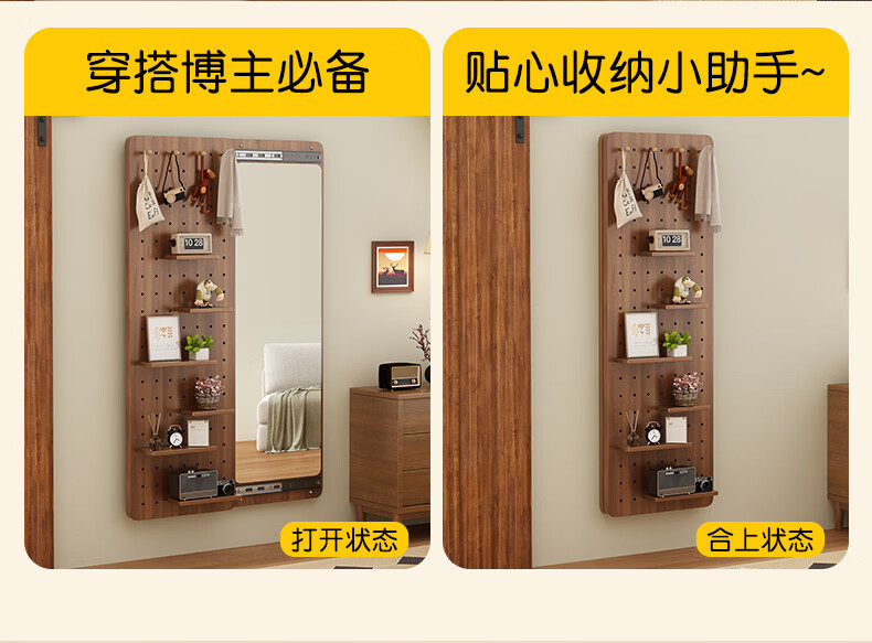 溥畔隐藏式洞洞板穿衣镜推拉全身镜子家用衣帽架一体壁挂墙玄关试衣镜 [上门包安装]宽50X高150cm 原木色 (左右
