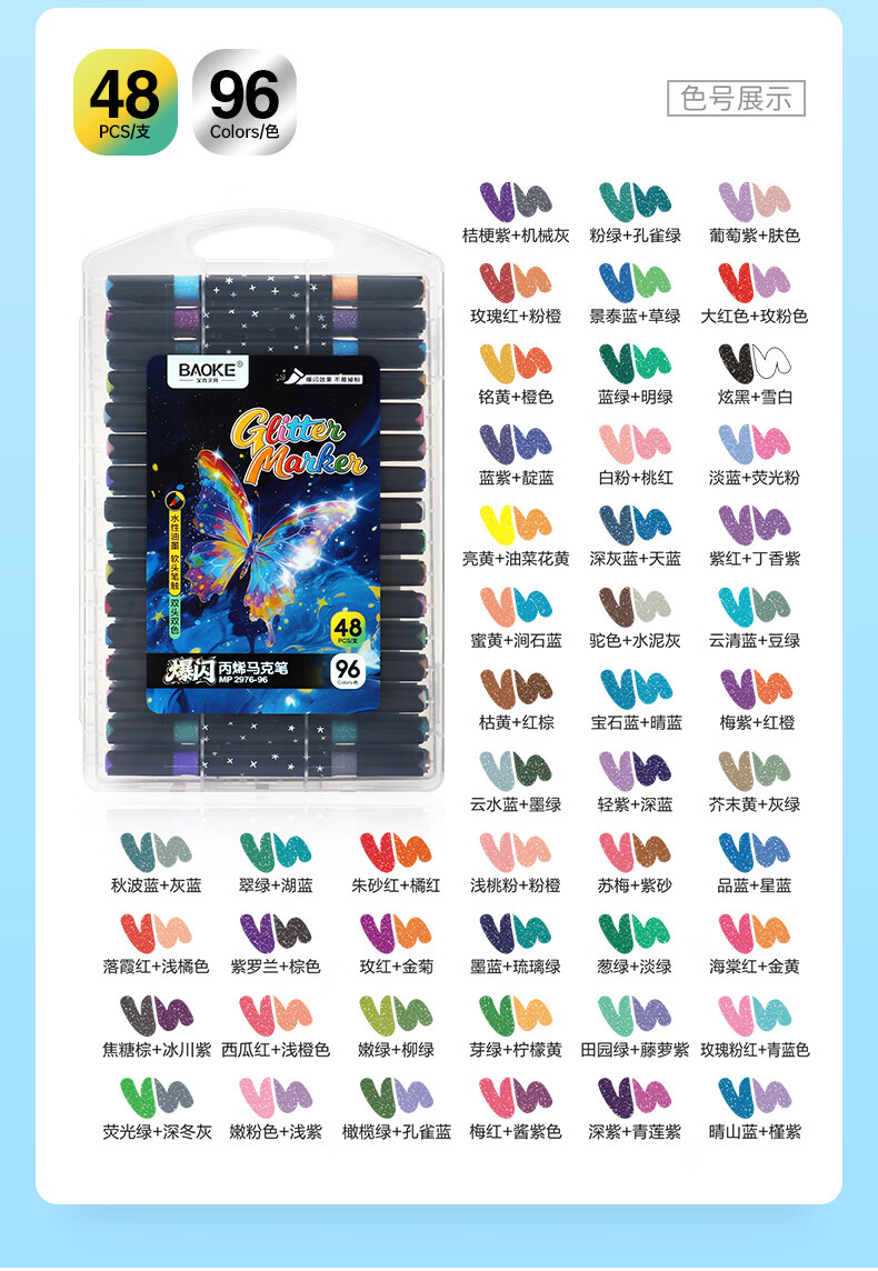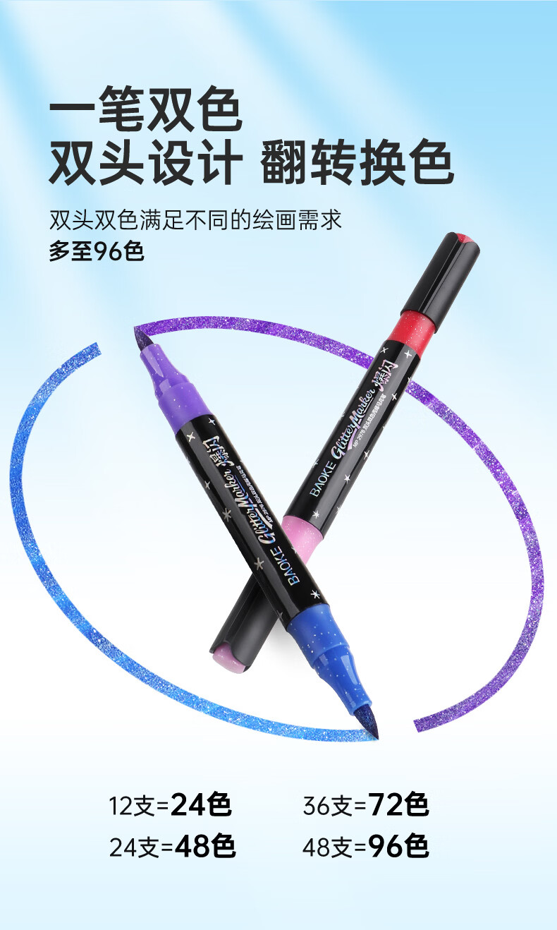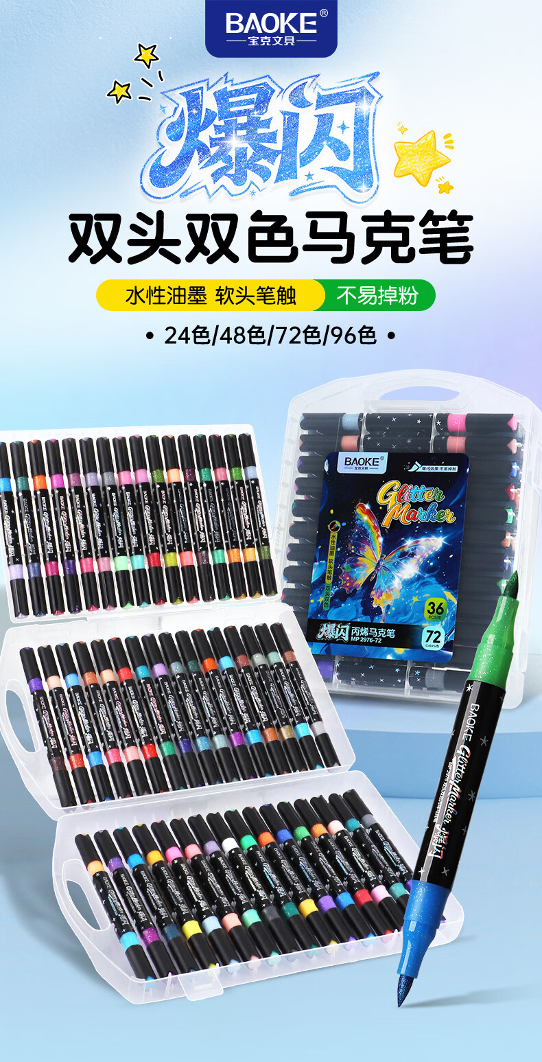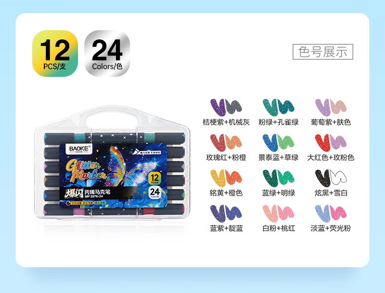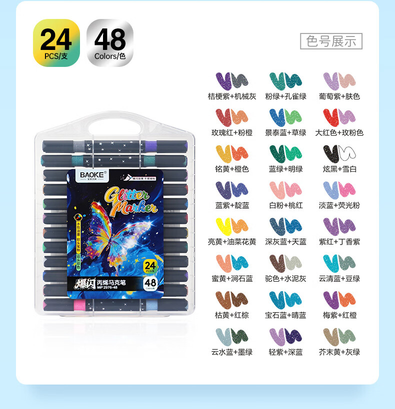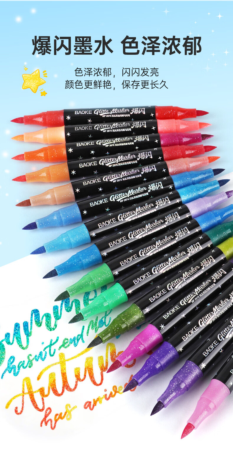 宝克(BAOKE)丙烯双头马克笔 覆盖力强不易褪色安全无异味 儿童小学生美术画画专用涂鸦MP2955 双头软绘爆闪闪绘马克笔-24色 MP2976