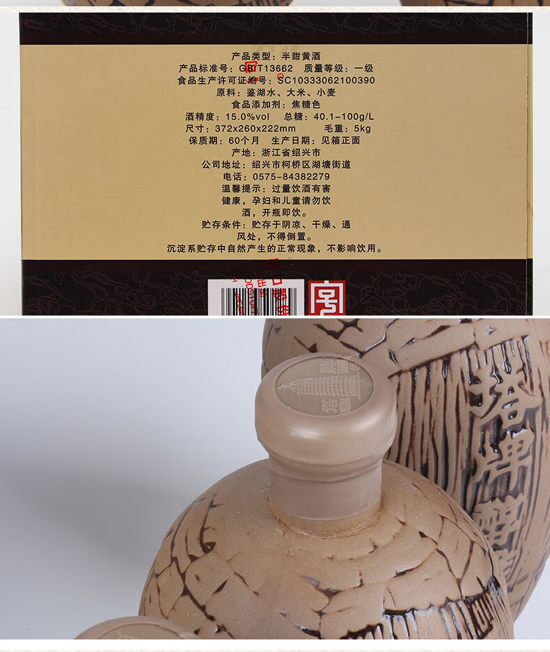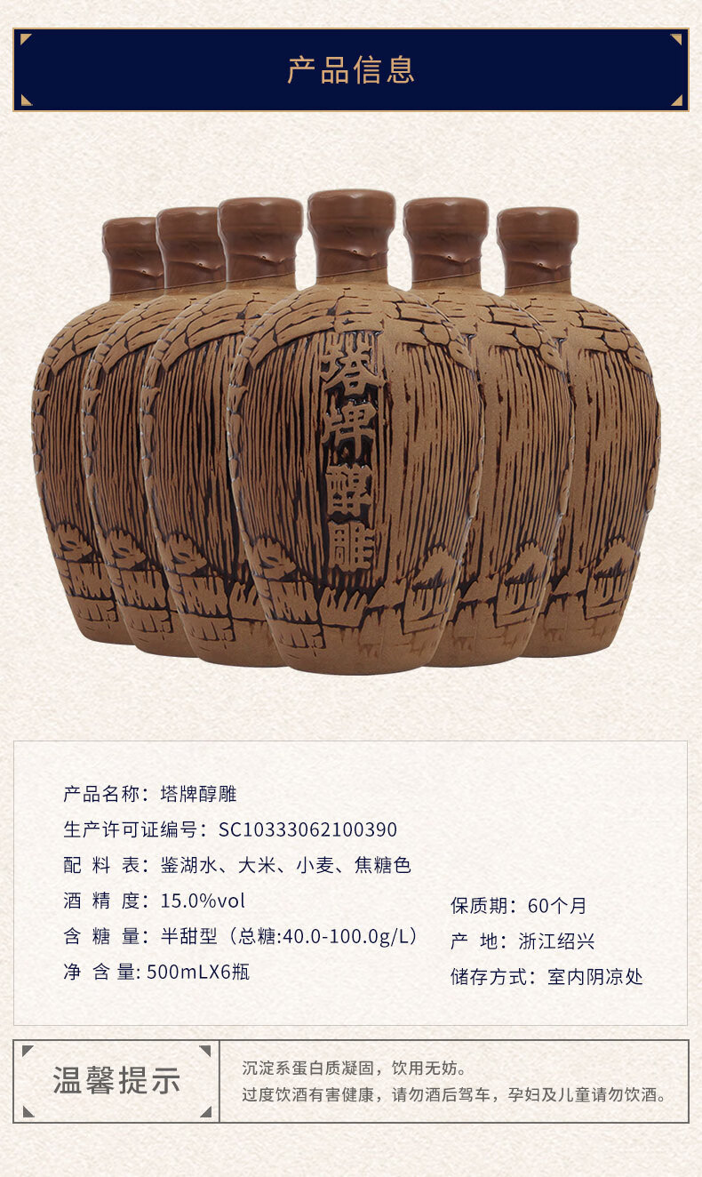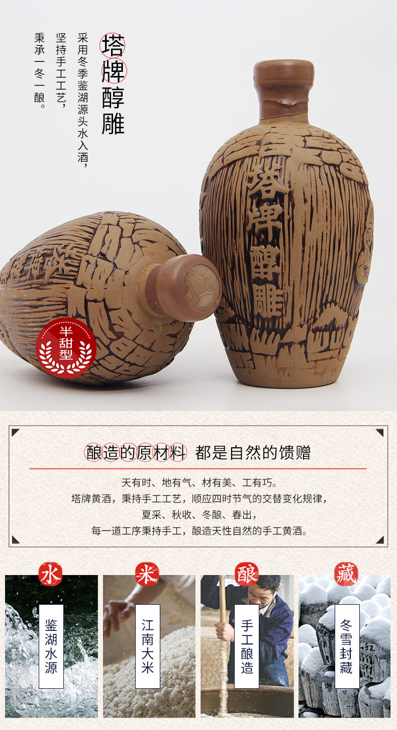 塔牌醇雕 绍兴黄酒 半甜型手工冬酿花雕酒 陶坛整箱 500mL 6瓶