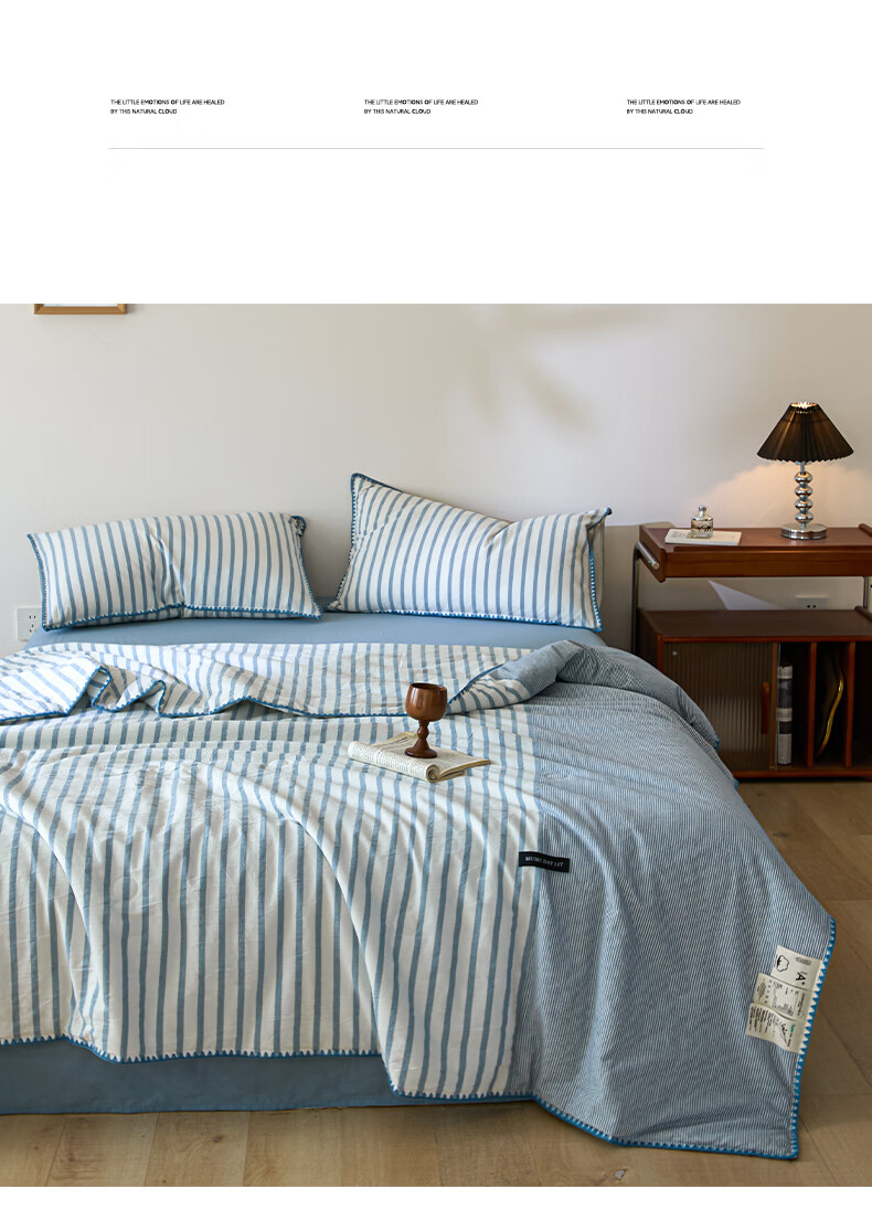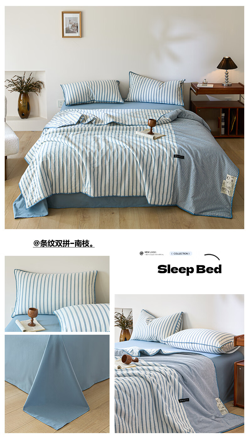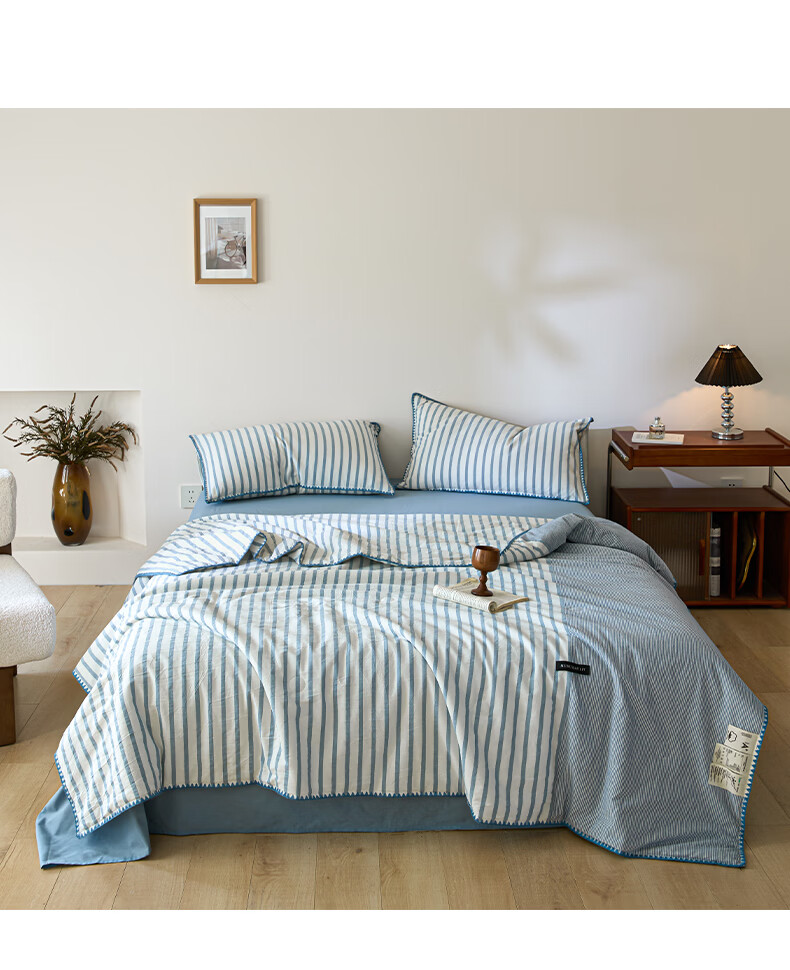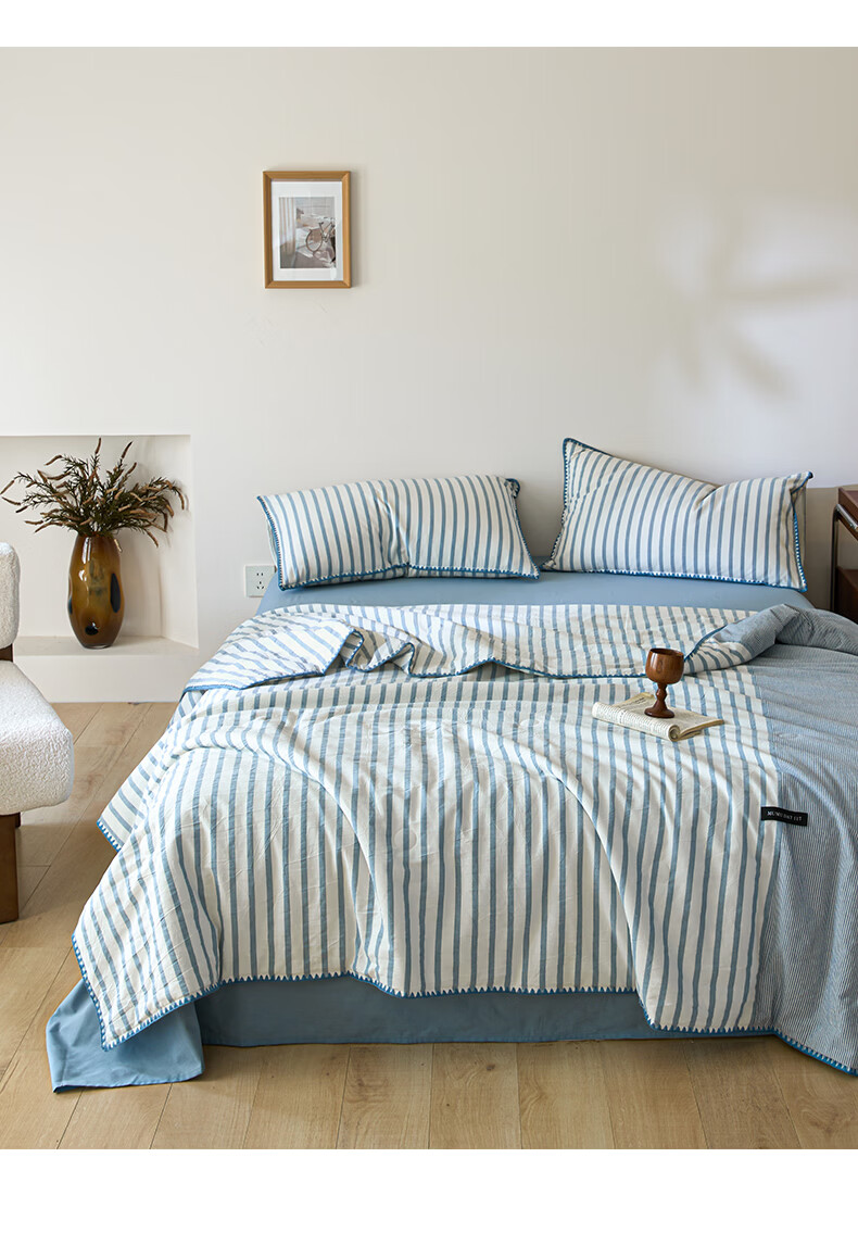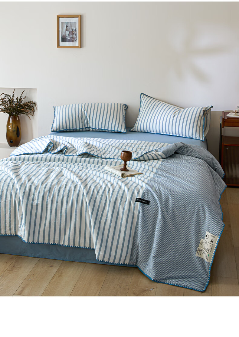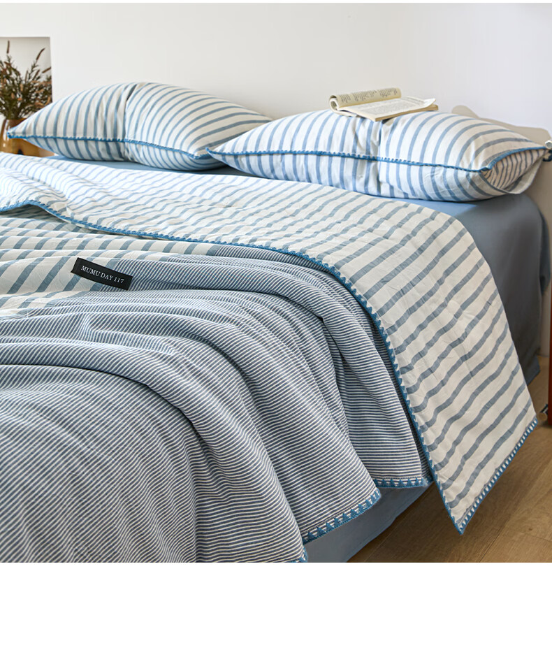 无印良品全棉夏凉被夏季空调被纯棉100%双面可机洗抗菌薄款被子夏被四件套 条纹双拼-南枝【全棉面料 贝壳花边】 150*200cm单夏被 通用