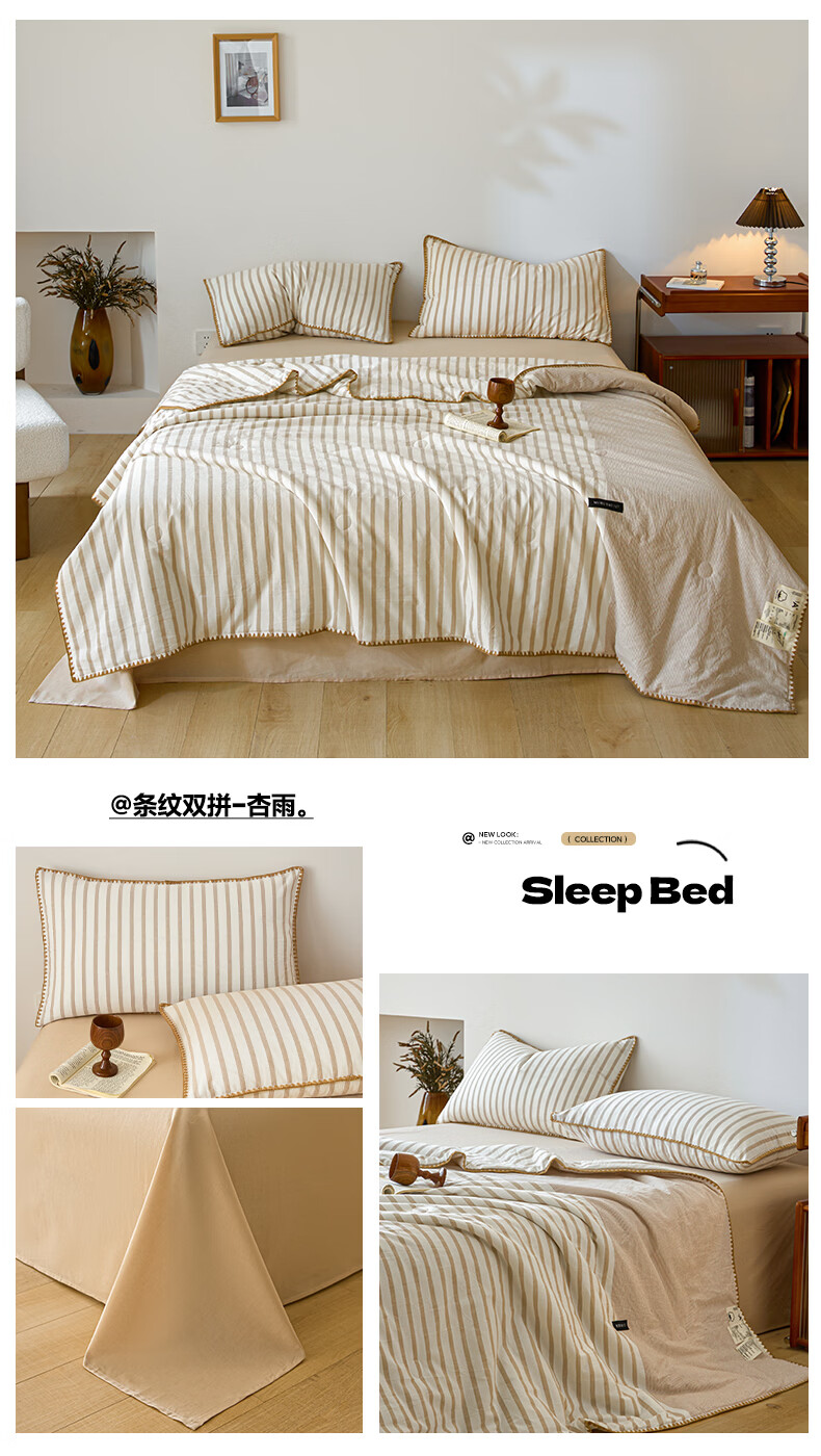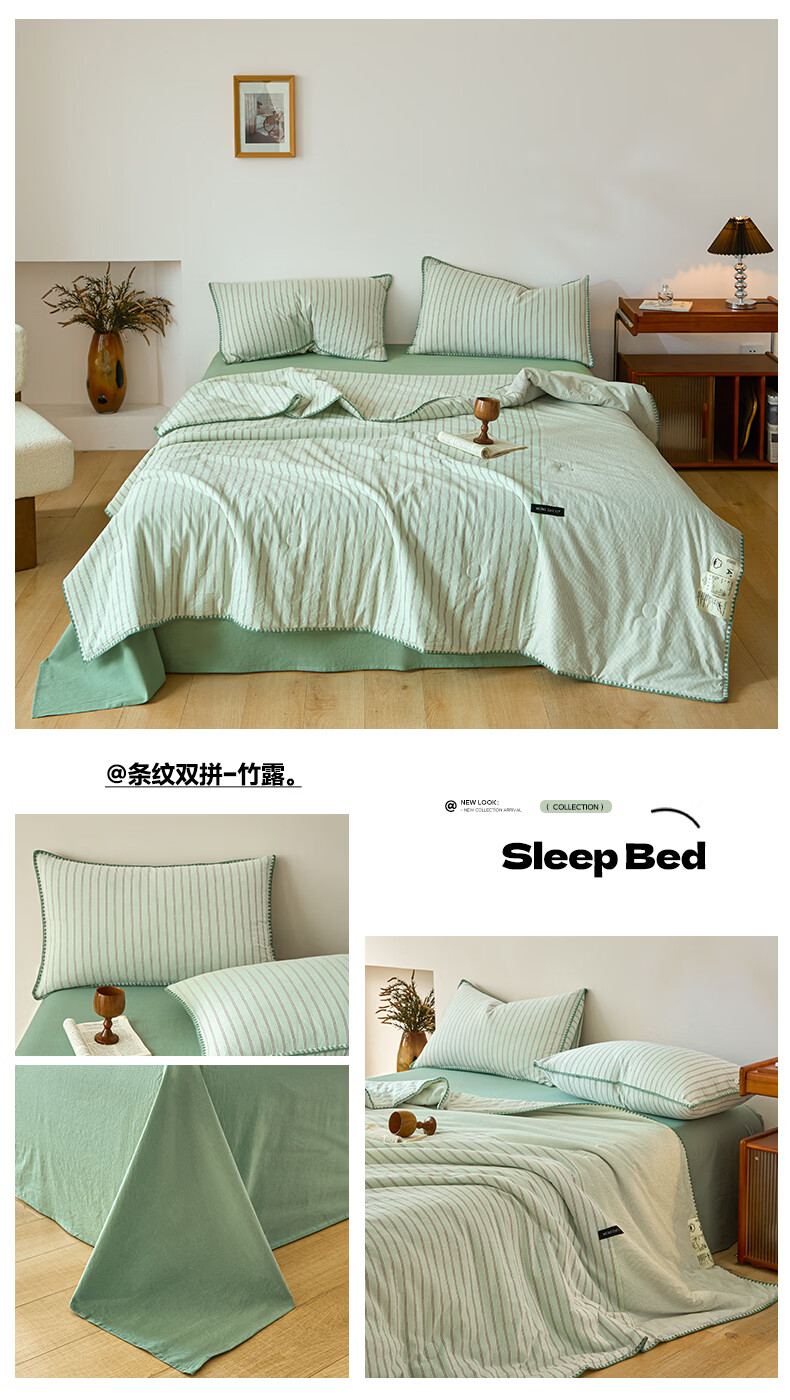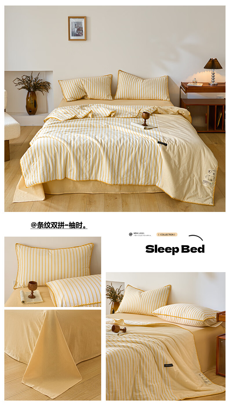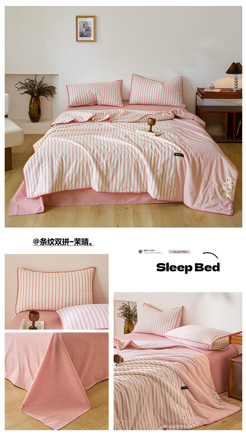 无印良品全棉夏凉被夏季空调被纯棉100%双面可机洗抗菌薄款被子夏被四件套 条纹双拼-南枝【全棉面料 贝壳花边】 150*200cm单夏被 通用