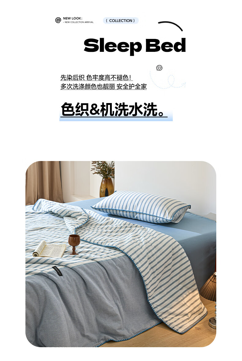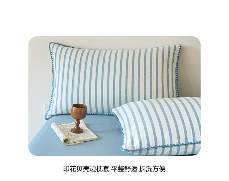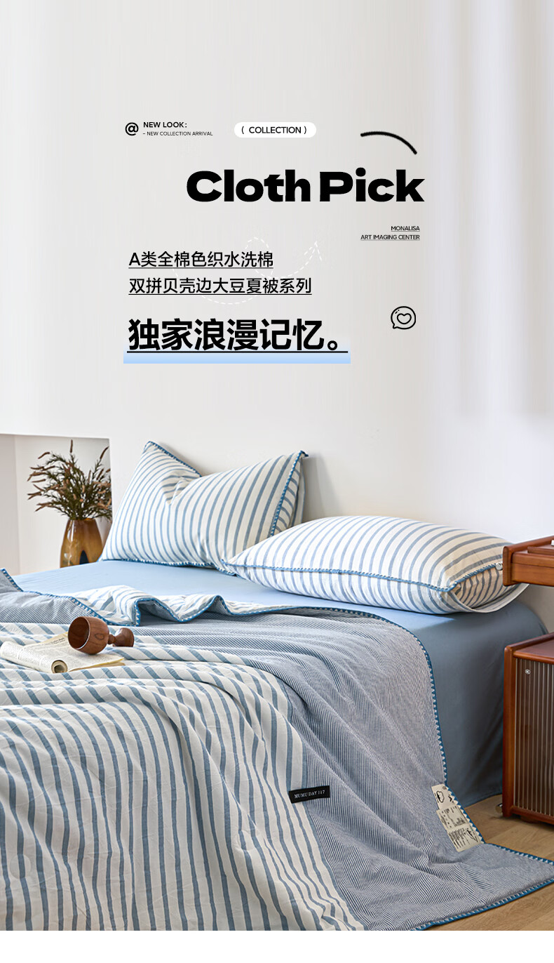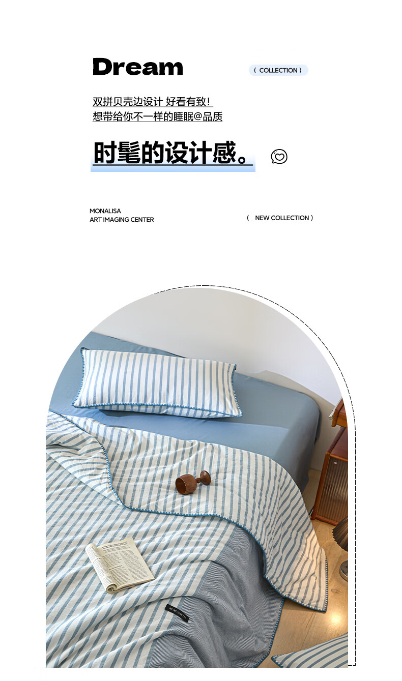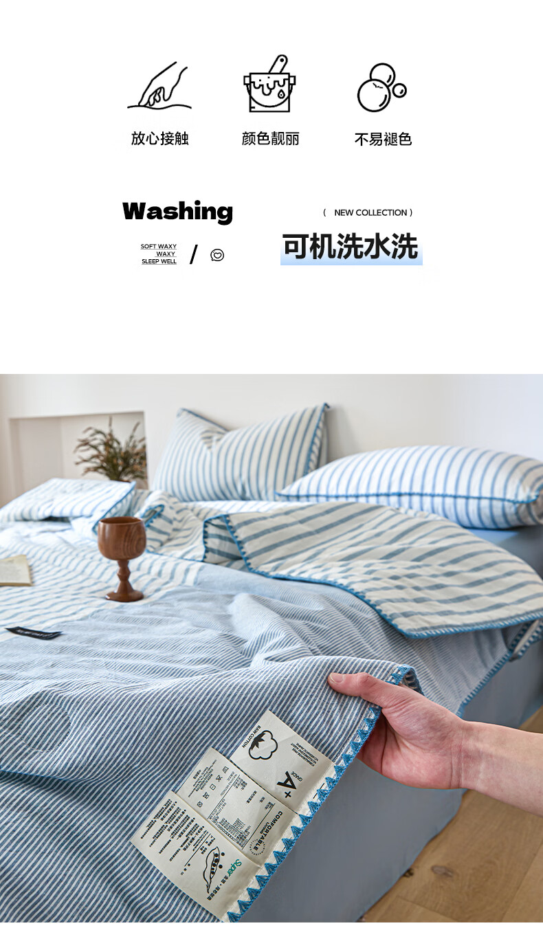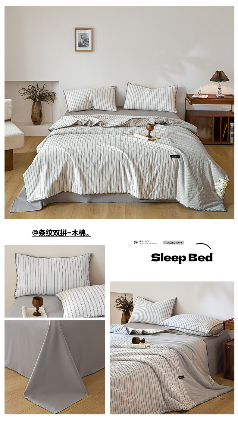无印良品全棉夏凉被夏季空调被纯棉100%双面可机洗抗菌薄款被子夏被四件套 条纹双拼-南枝【全棉面料 贝壳花边】 150*200cm单夏被 通用