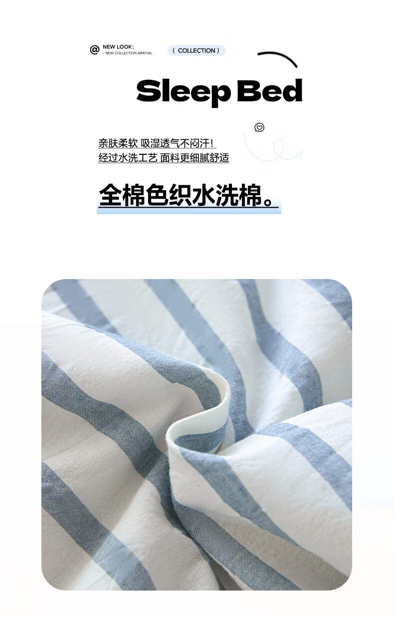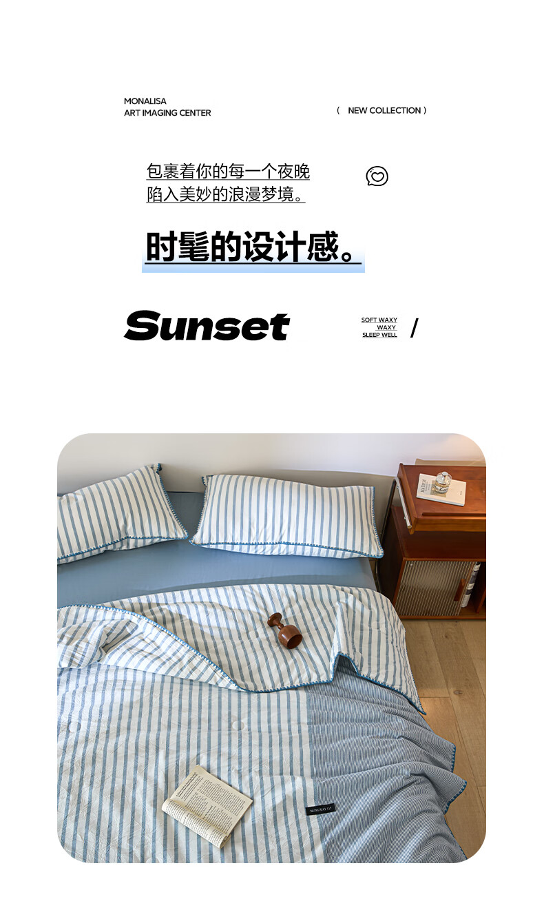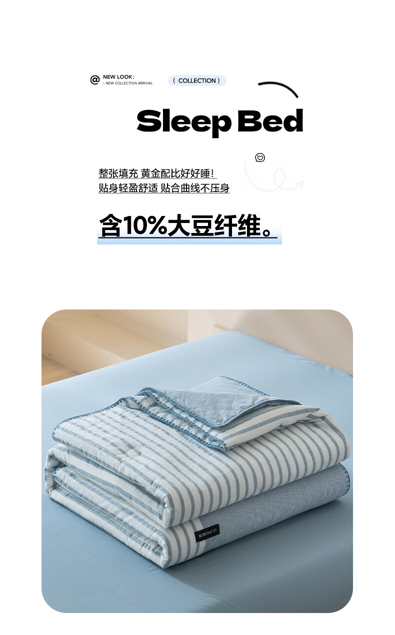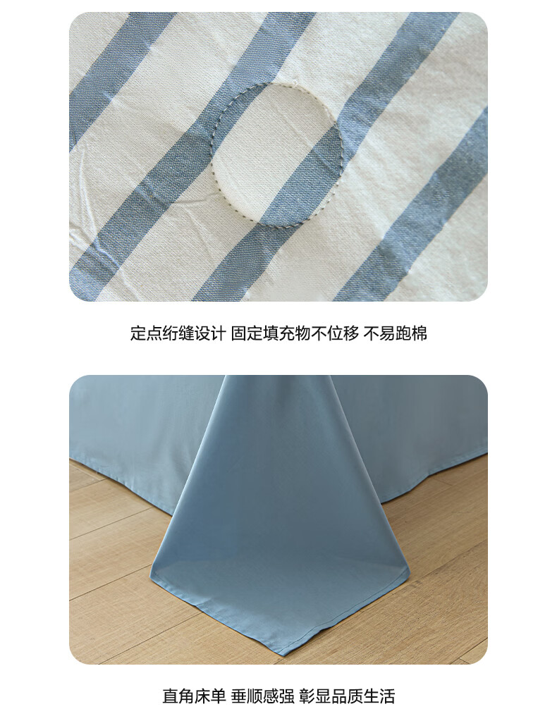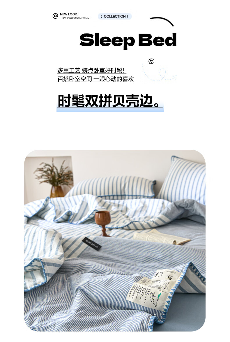 无印良品全棉夏凉被夏季空调被纯棉100%双面可机洗抗菌薄款被子夏被四件套 条纹双拼-南枝【全棉面料 贝壳花边】 150*200cm单夏被 通用