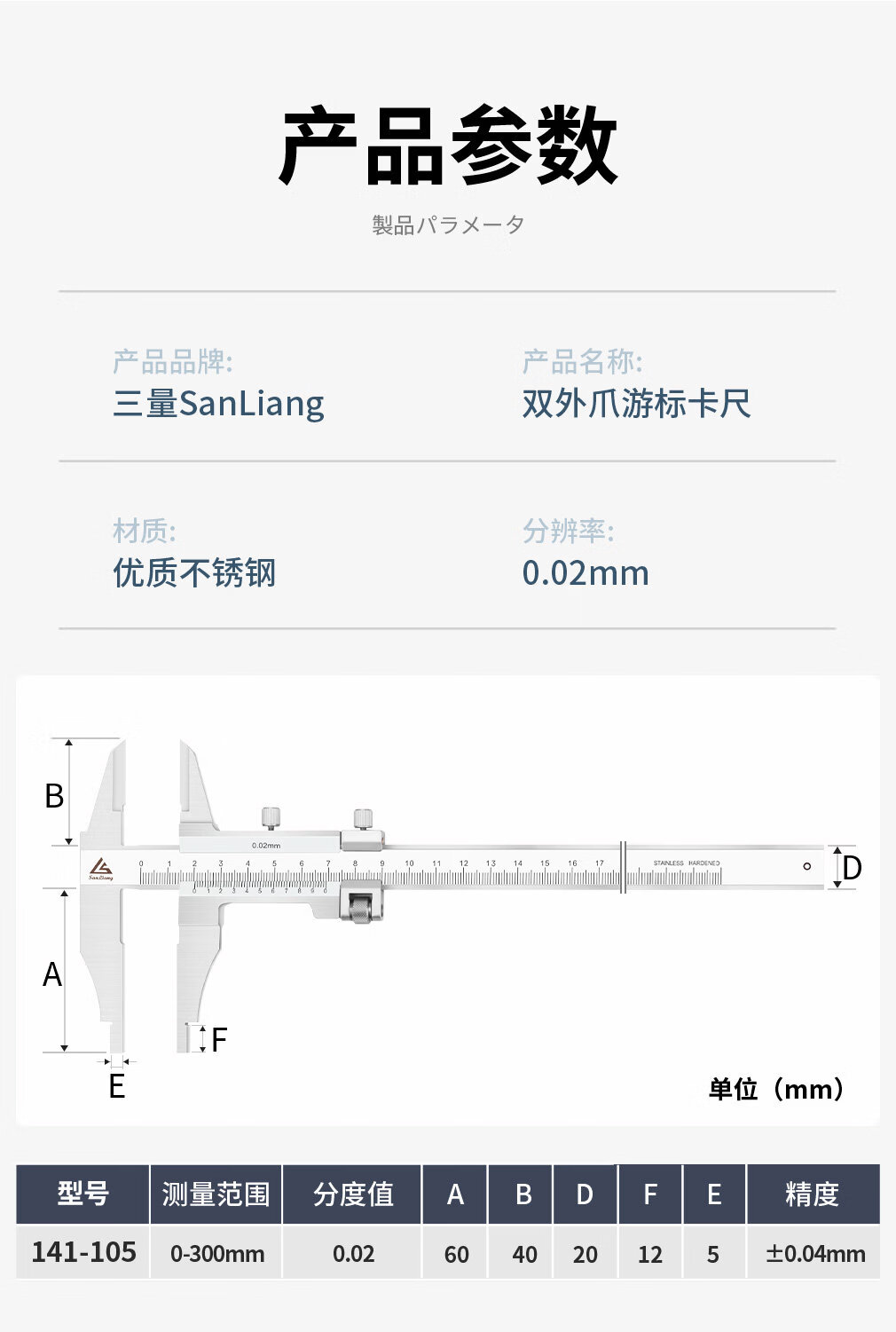 三量(sanliang)正品三量H型0-300mm双外爪游标卡尺高精度三型卡尺不锈钢卡尺 141-105 0-300*60mm不锈钢(H型) 无规格
