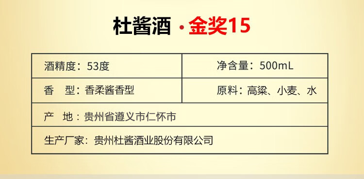 杜酱酒(金奖15)茅台镇53度酱香型白酒 纯粮坤沙酒 高度窖藏老酒 53度 500mL 6瓶 整箱带酒杯+手提袋