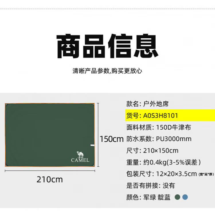 骆驼户外防潮垫防水便携郊游垫野炊地垫野餐垫帐篷垫摆摊垫子地布 A1W3LP101J-黄色