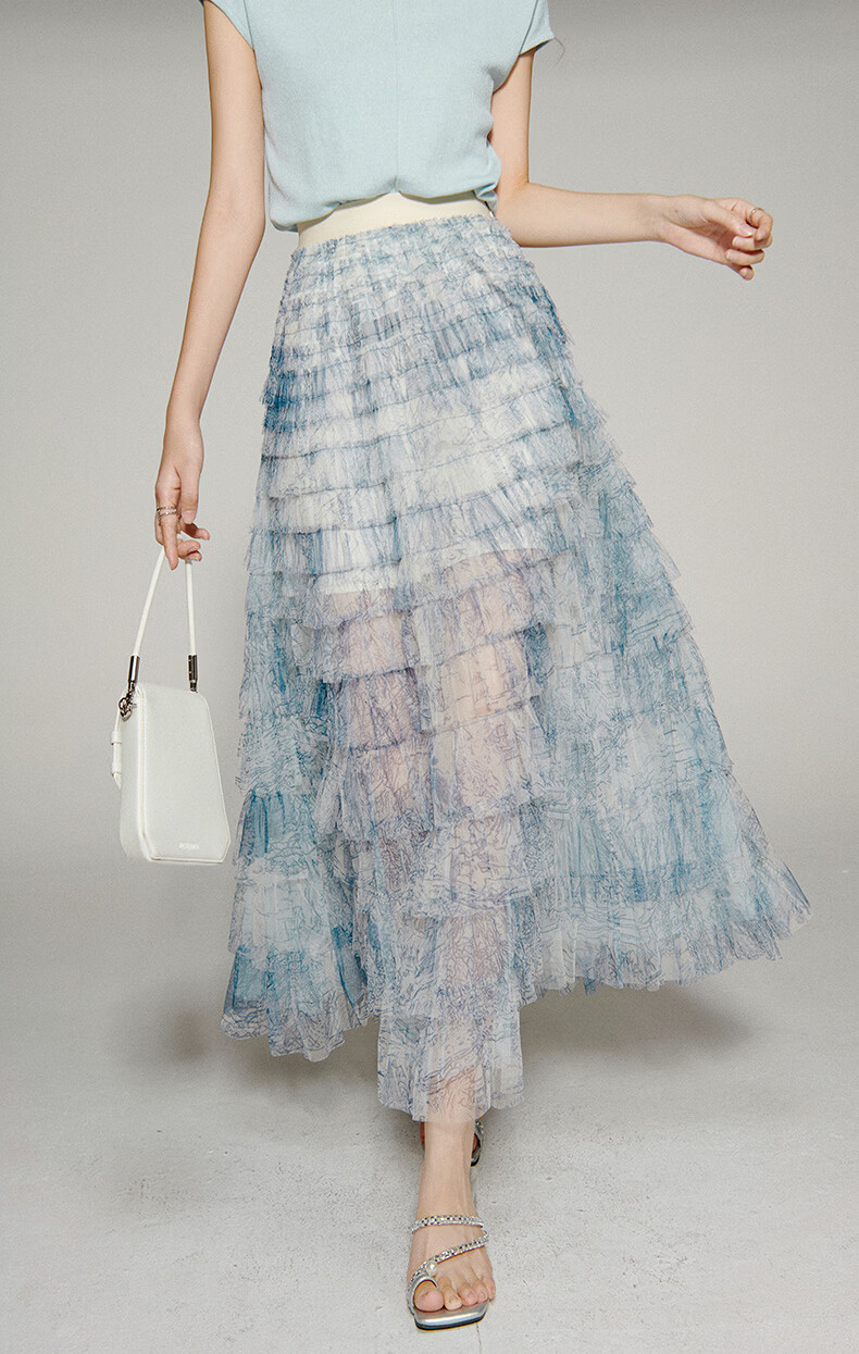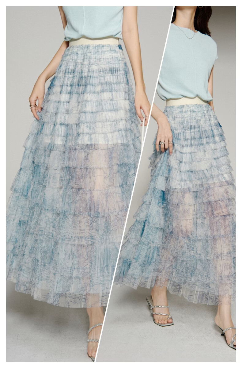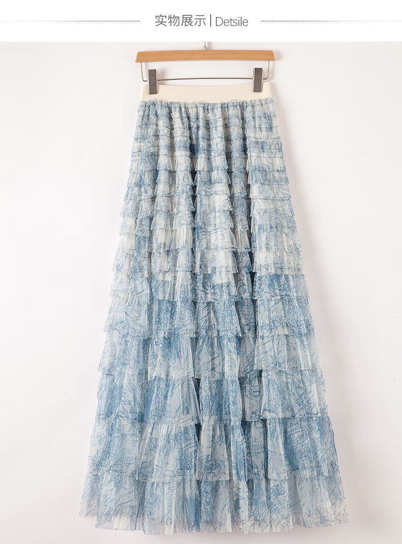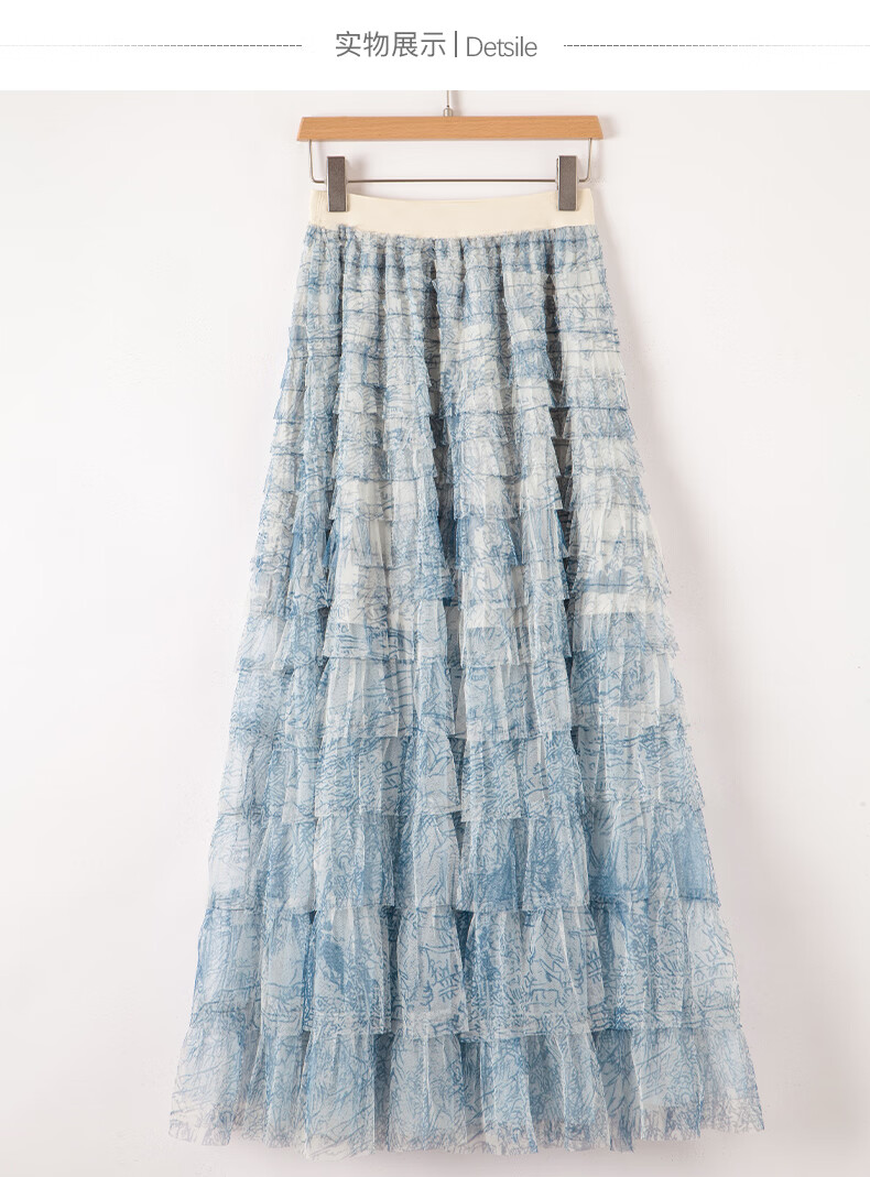 晚白【新品】2026年春款时尚洋气印花网纱半裙松紧高腰晕染长款蛋糕裙 蓝色 S