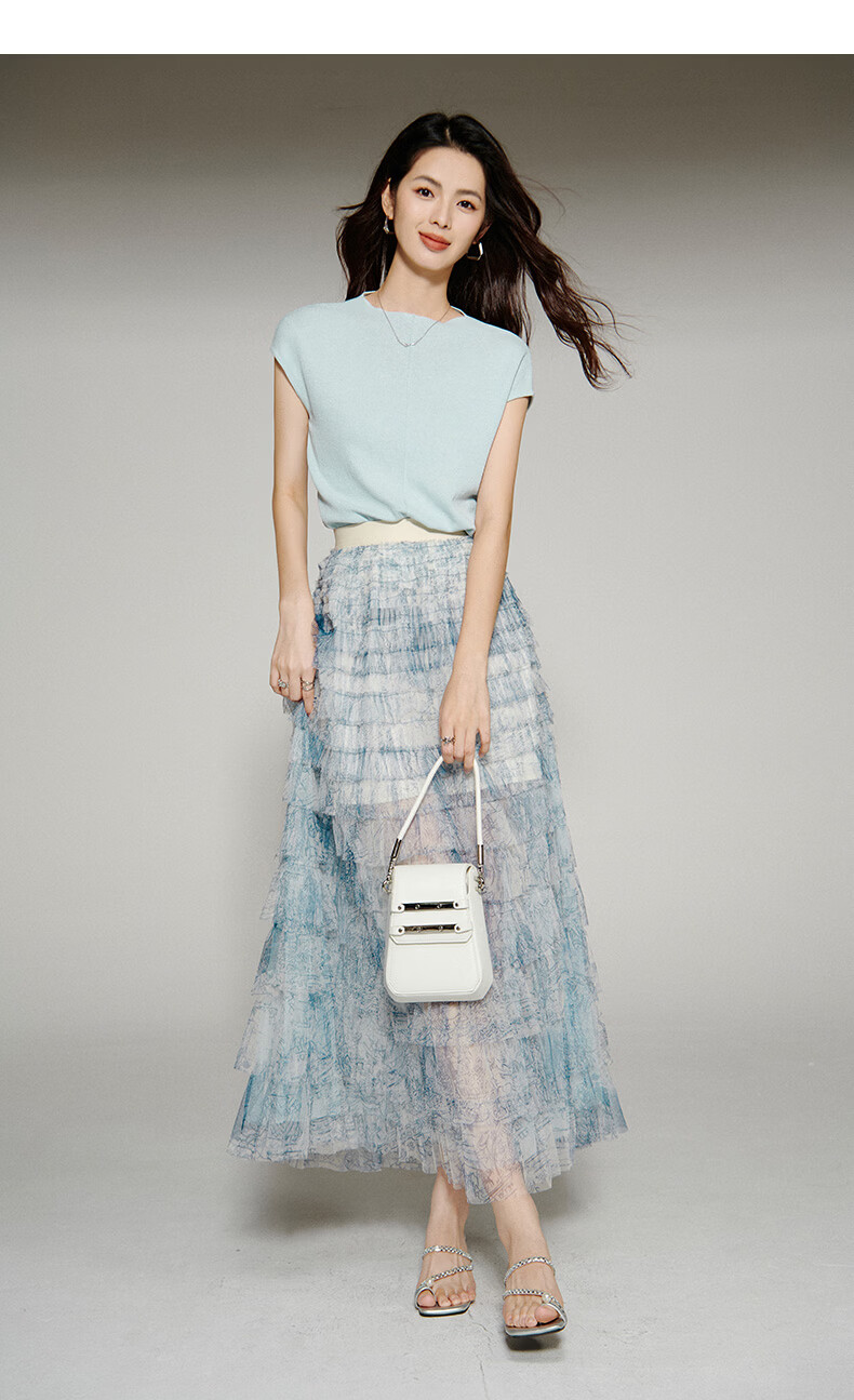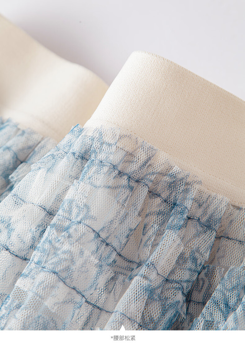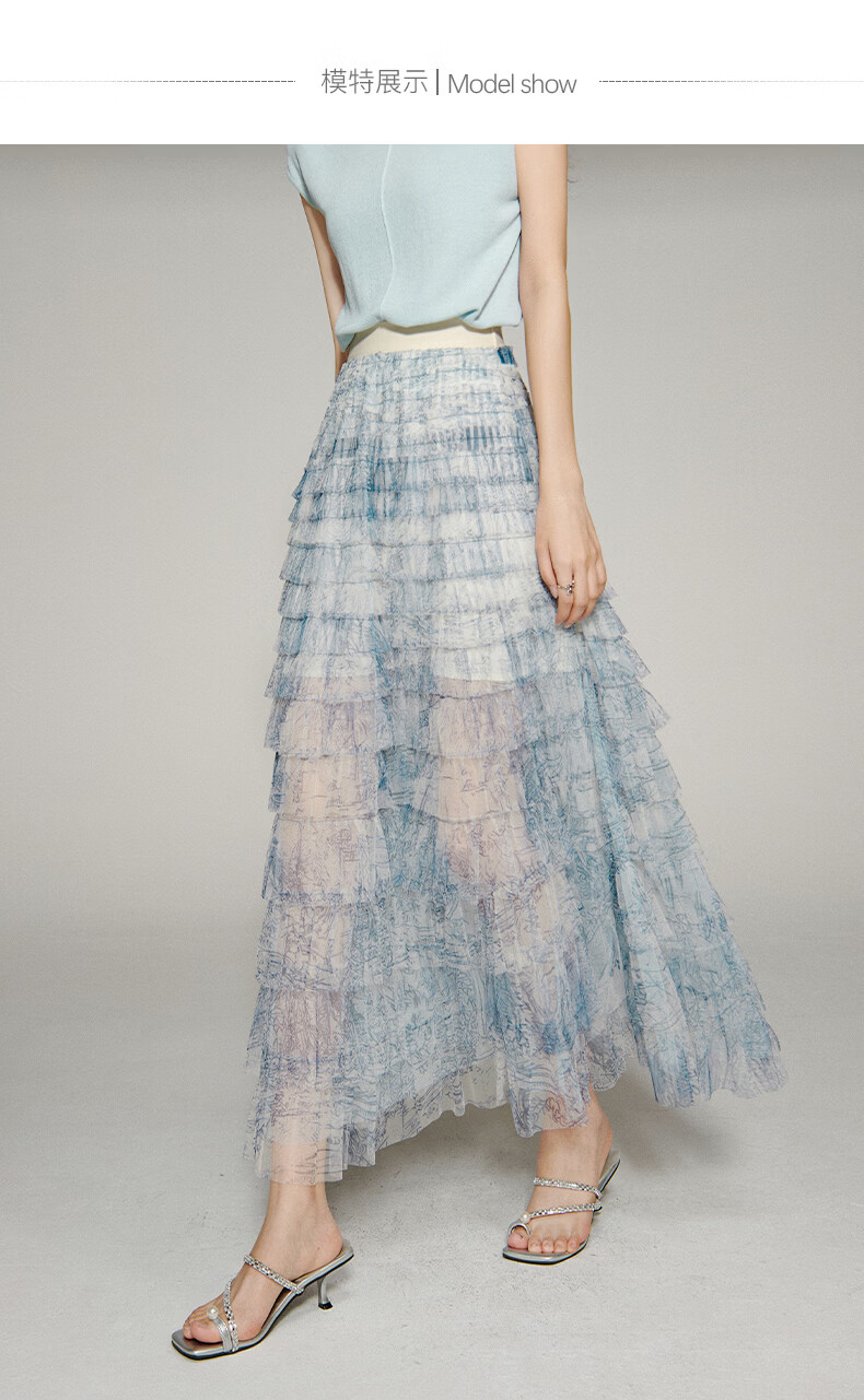 晚白【新品】2026年春款时尚洋气印花网纱半裙松紧高腰晕染长款蛋糕裙 蓝色 S