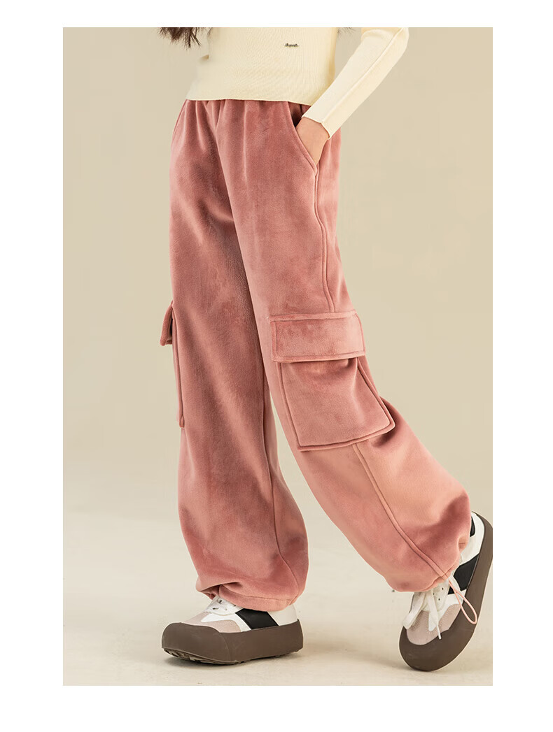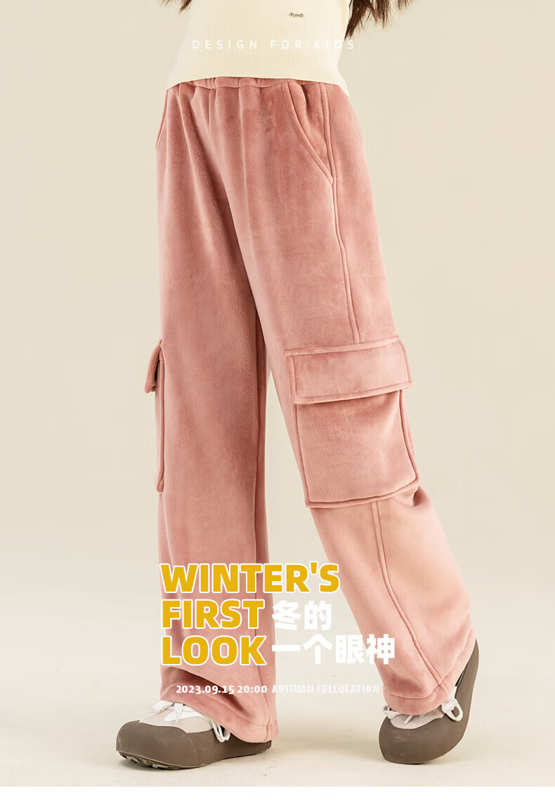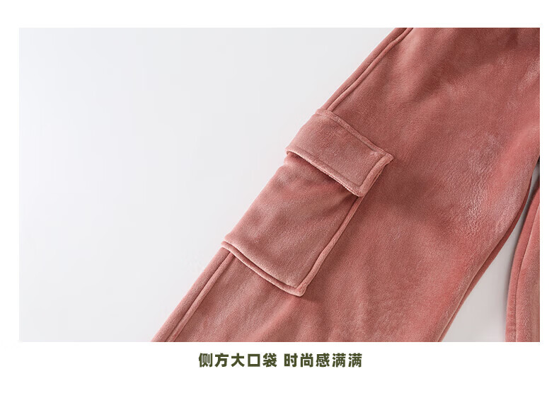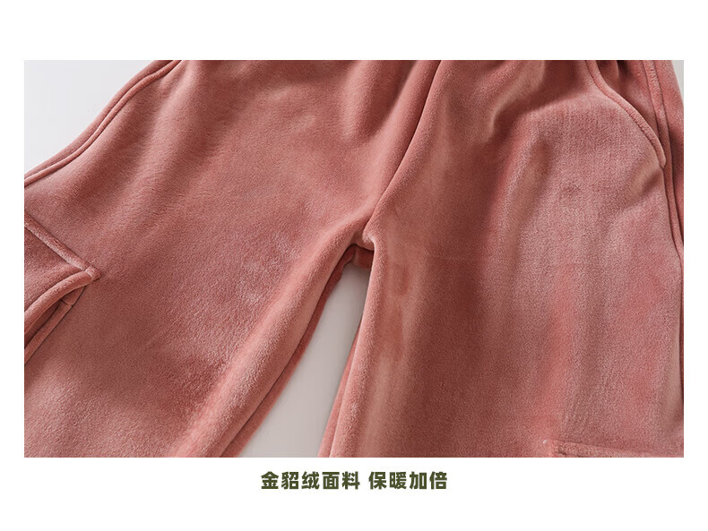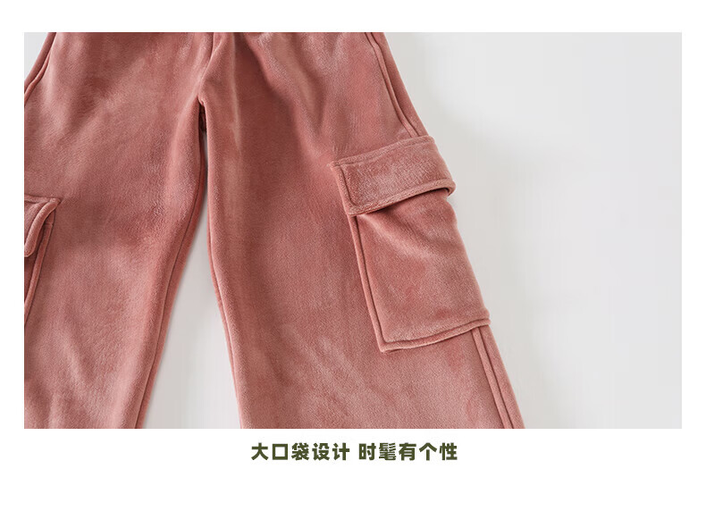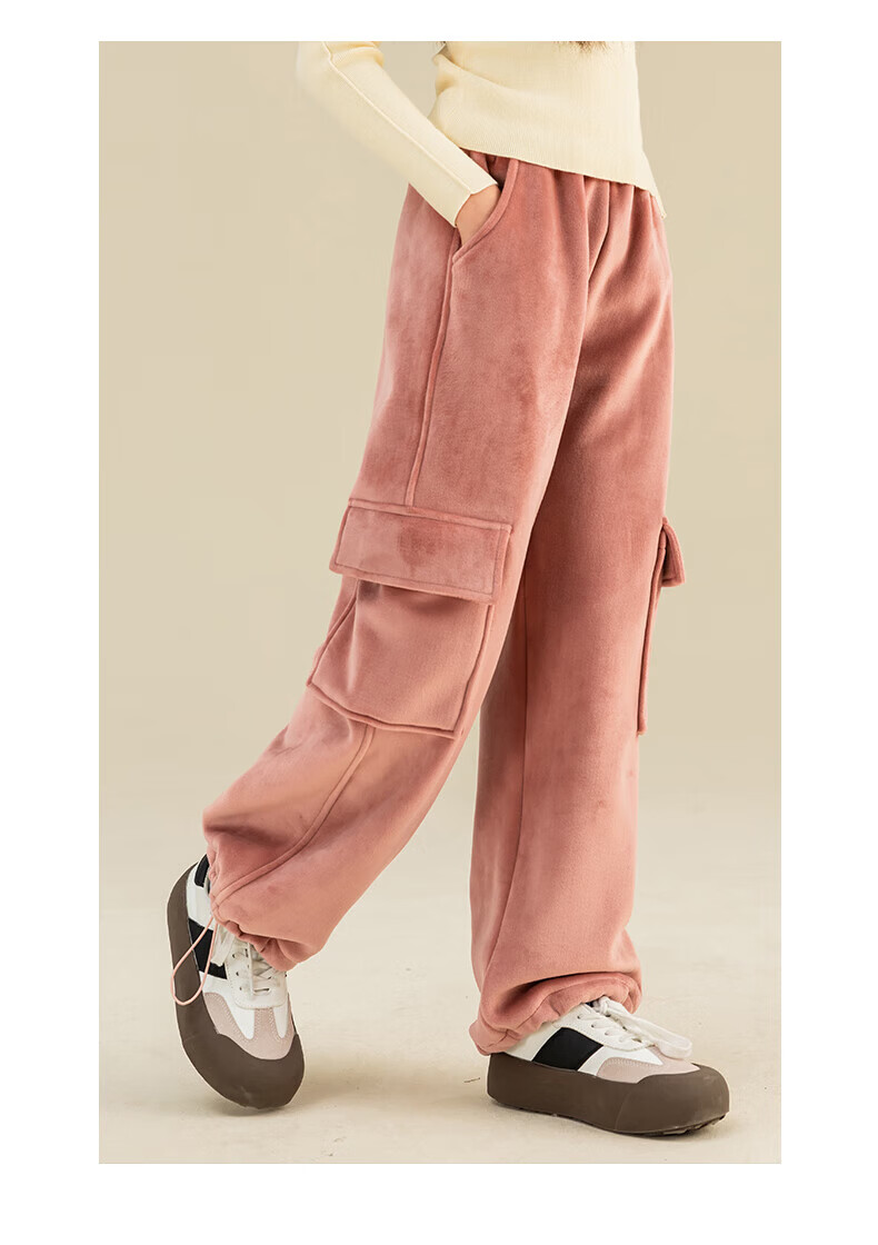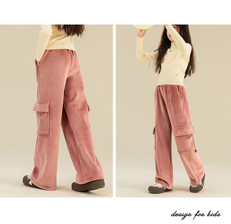 淘町女童裤子加绒秋冬中大童大口袋一体绒粉色宽松女宝工装裤 灰粉色 170