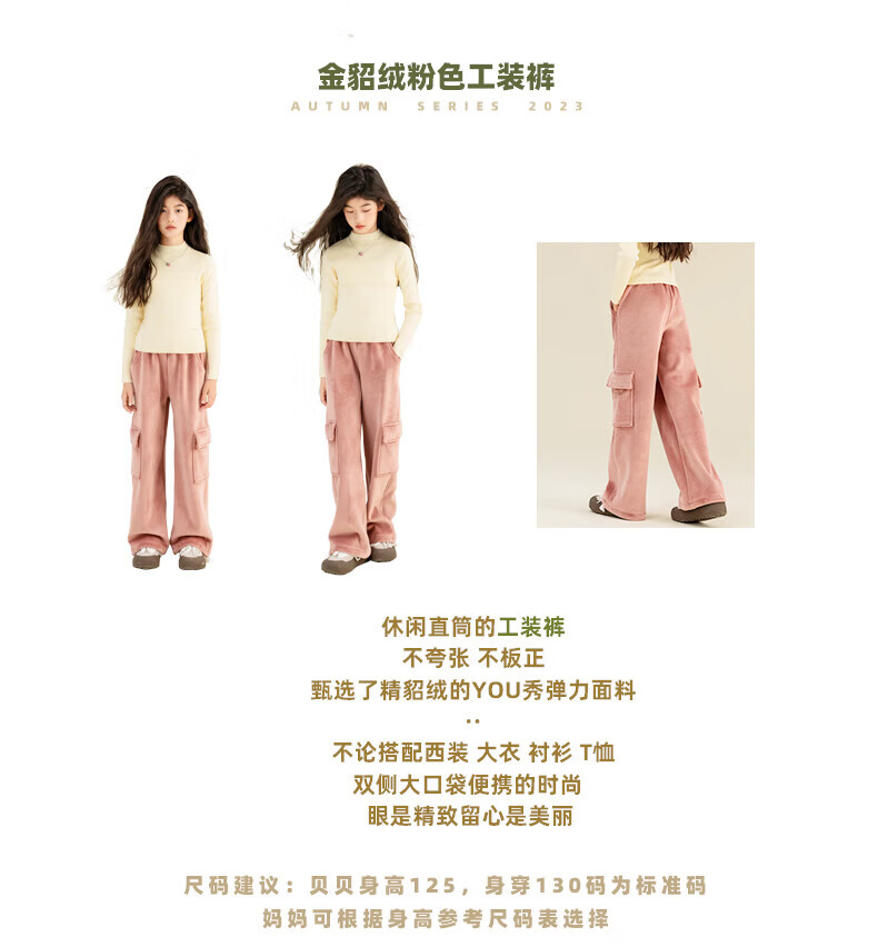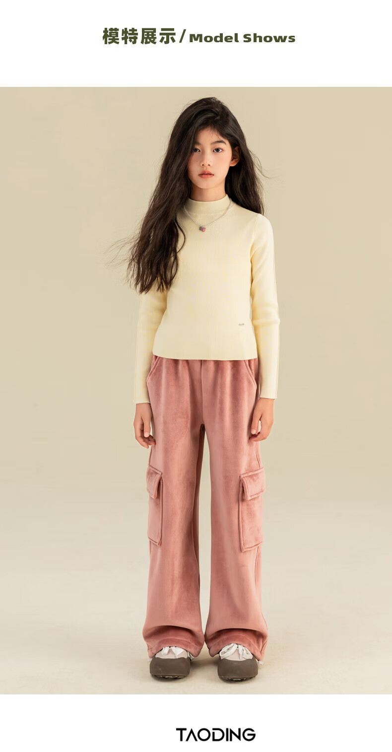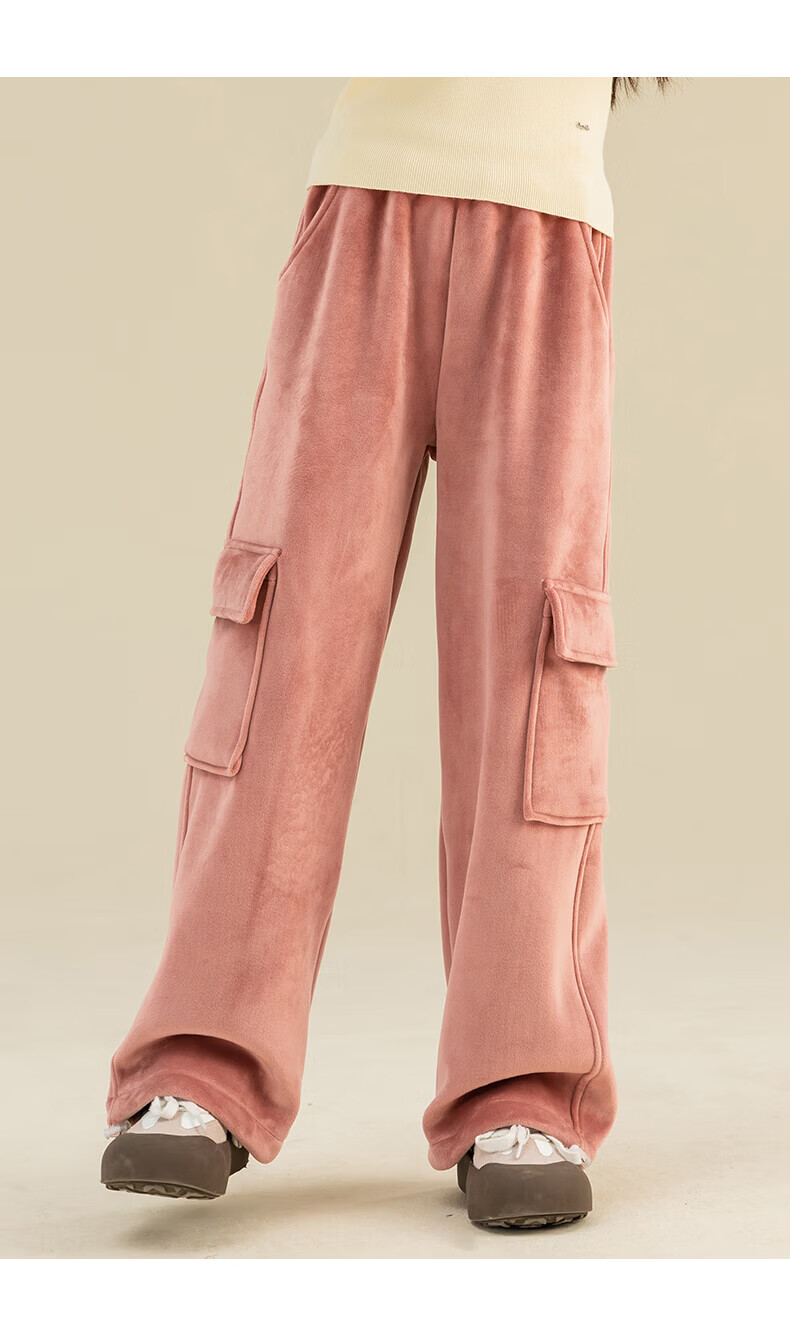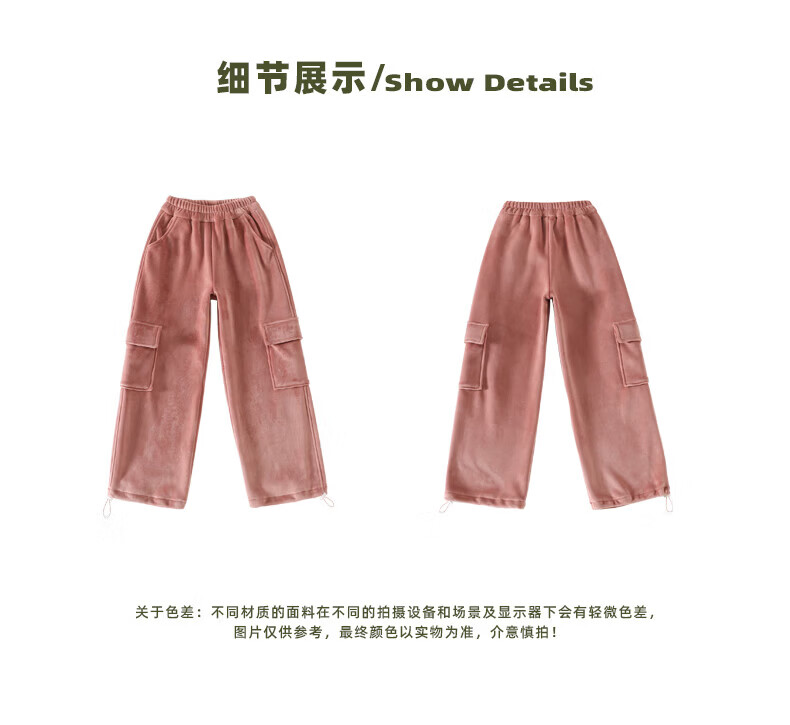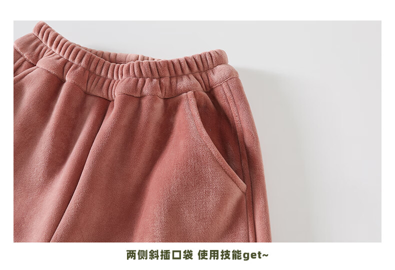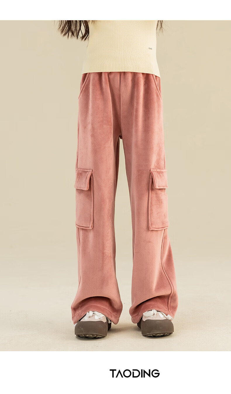 淘町女童裤子加绒秋冬中大童大口袋一体绒粉色宽松女宝工装裤 灰粉色 170