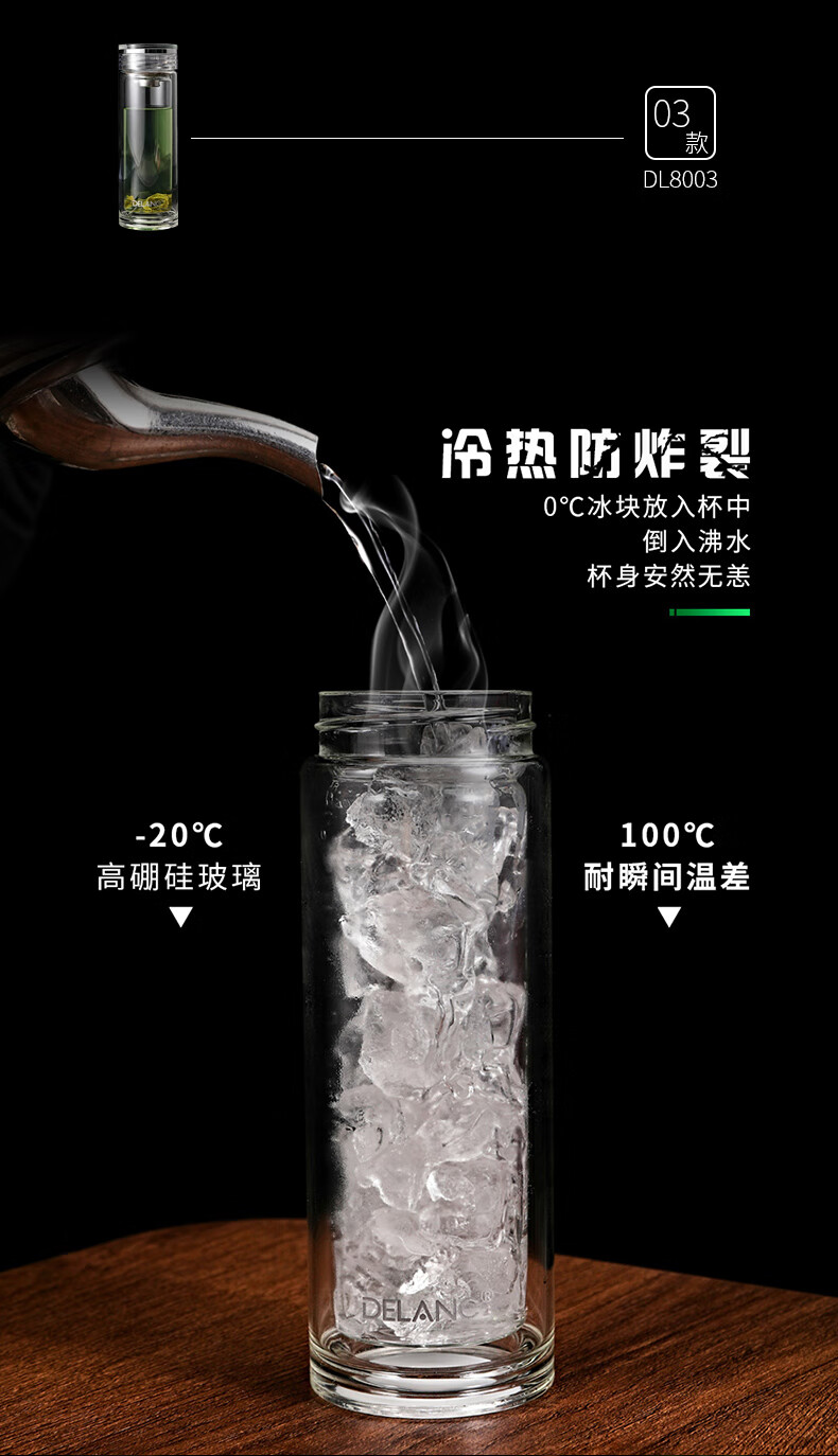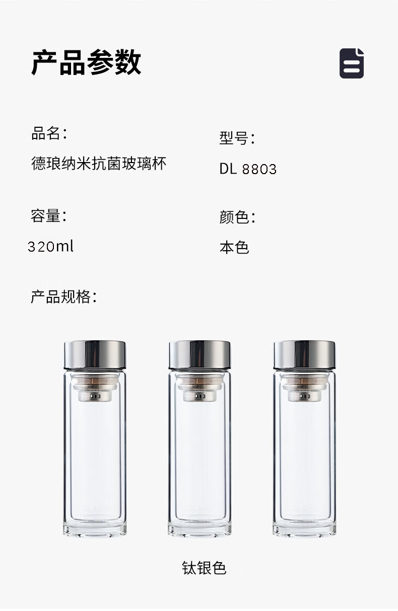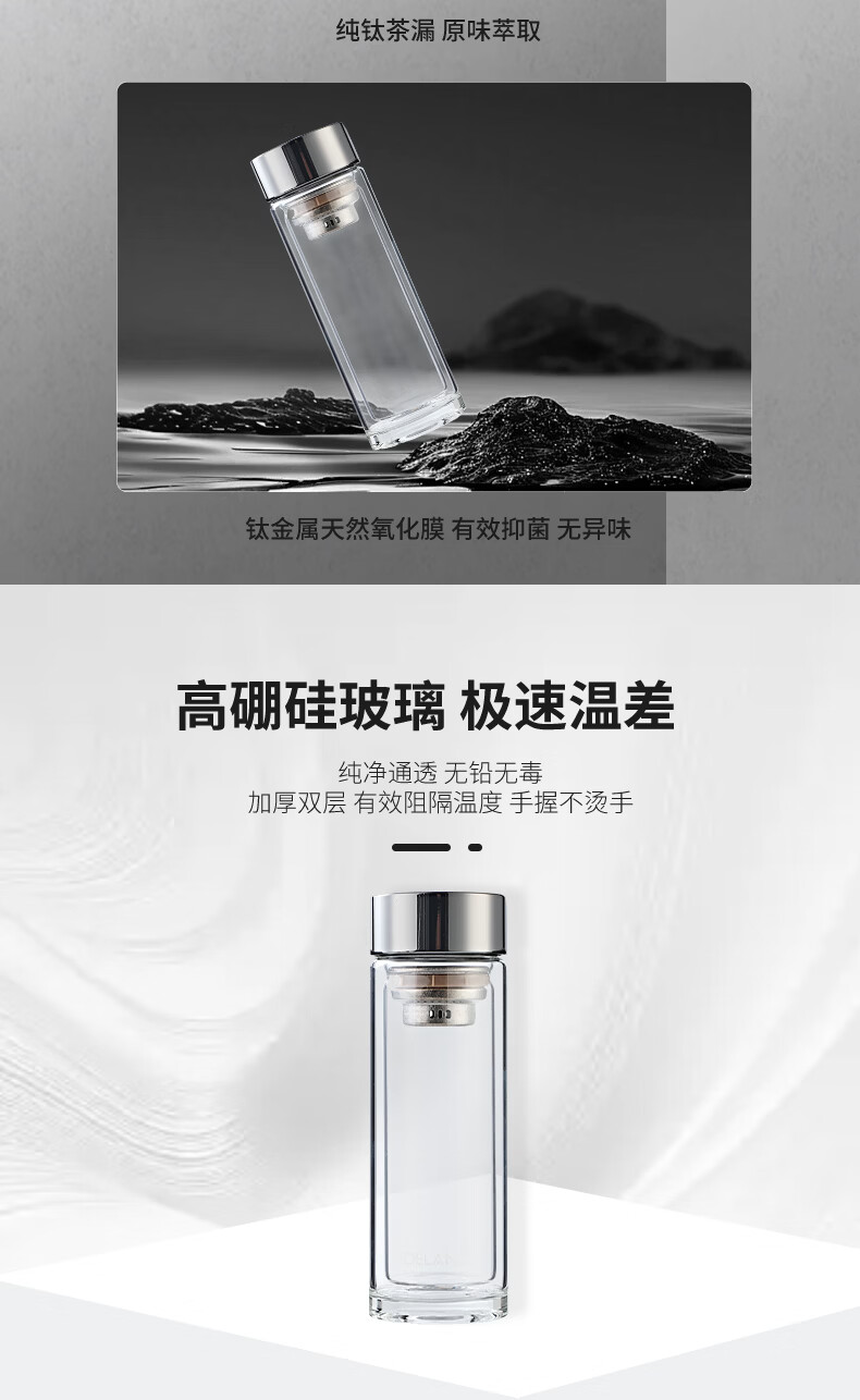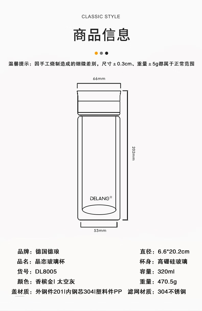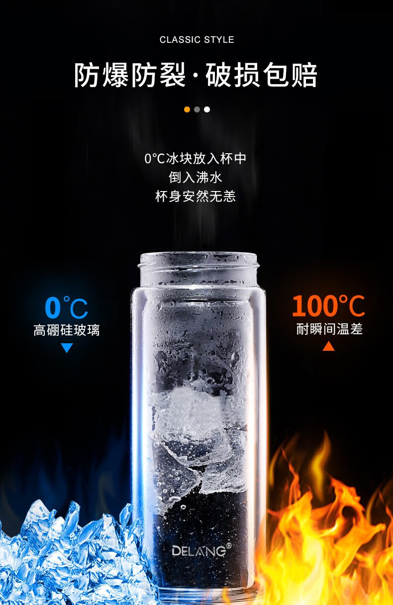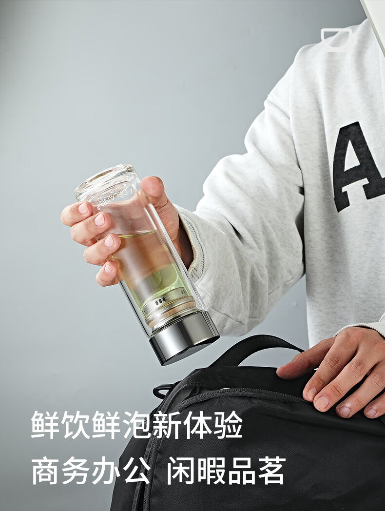 德琅(DELANG)德国品牌水杯双层玻璃杯商务办公玻璃杯 茶水分离杯8001-钢本色-独立茶仓