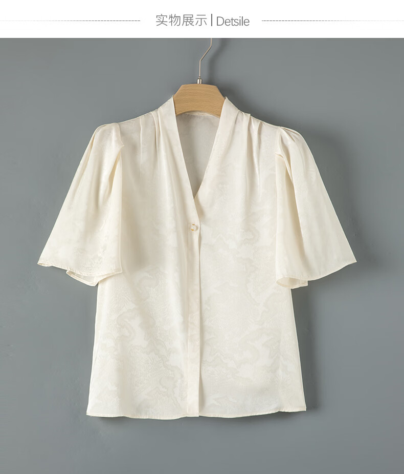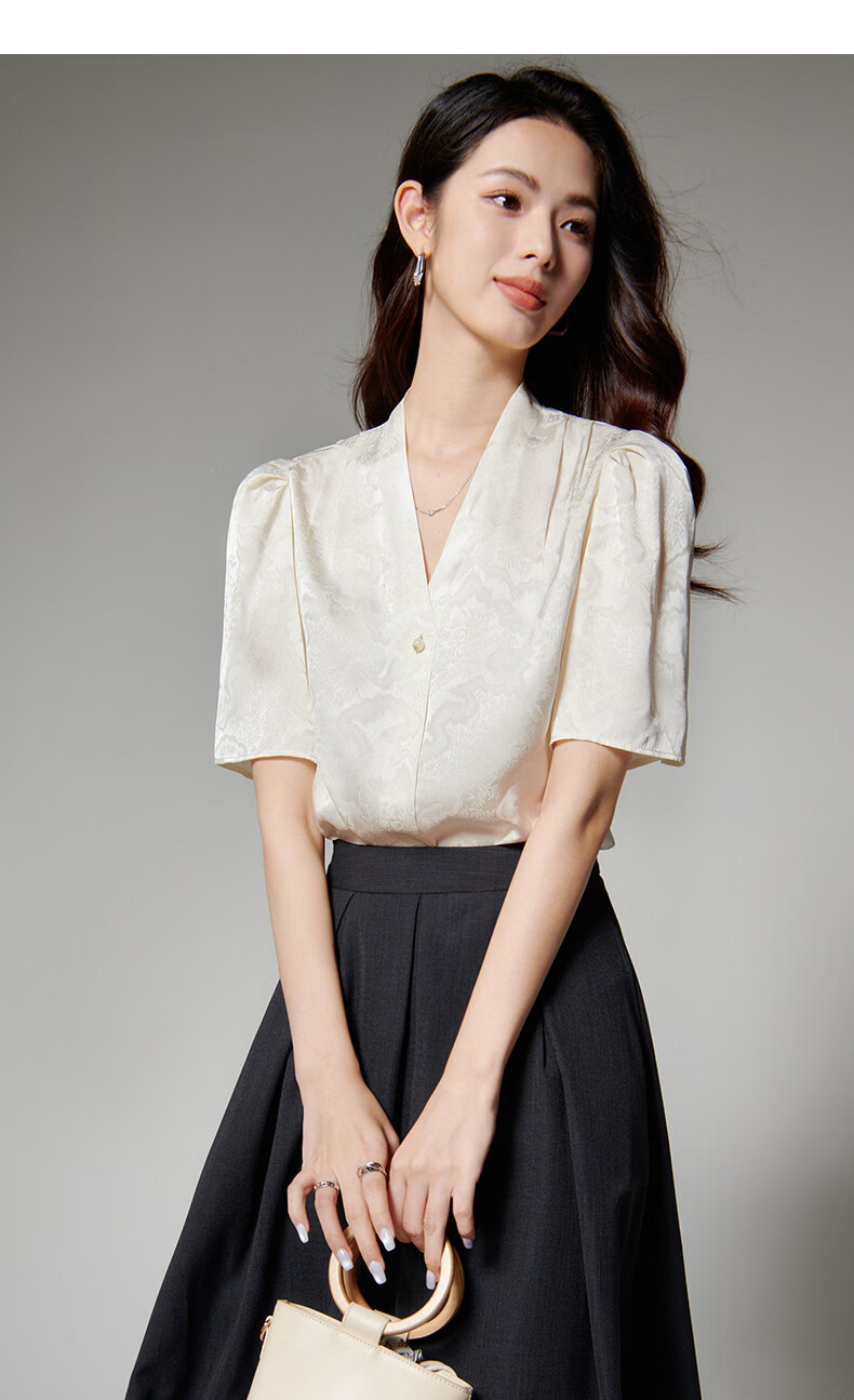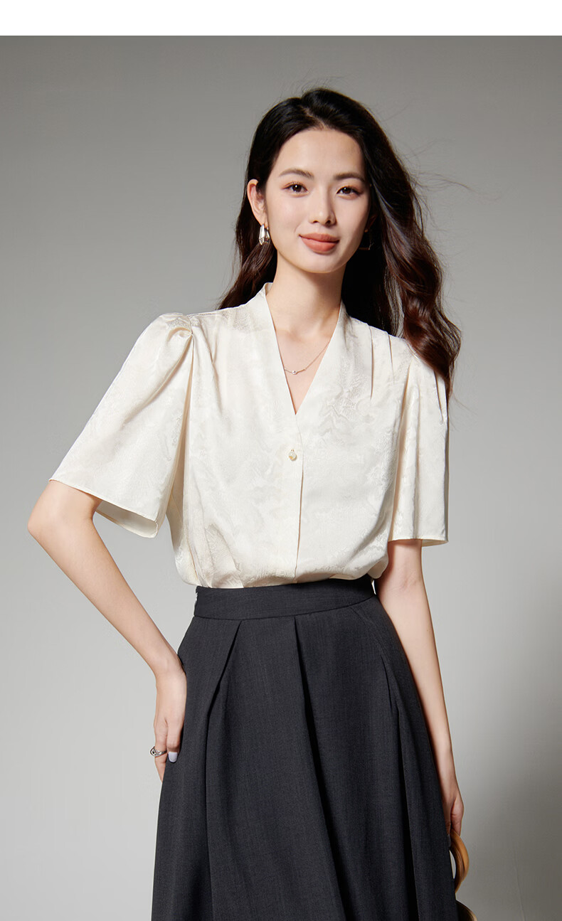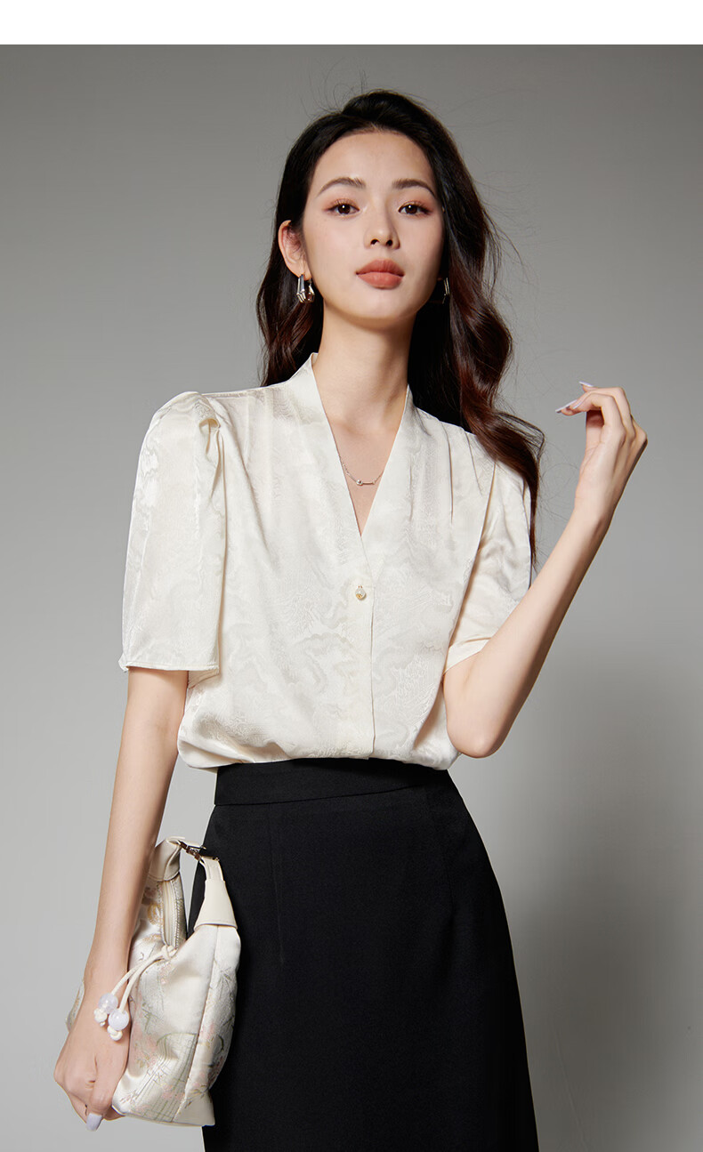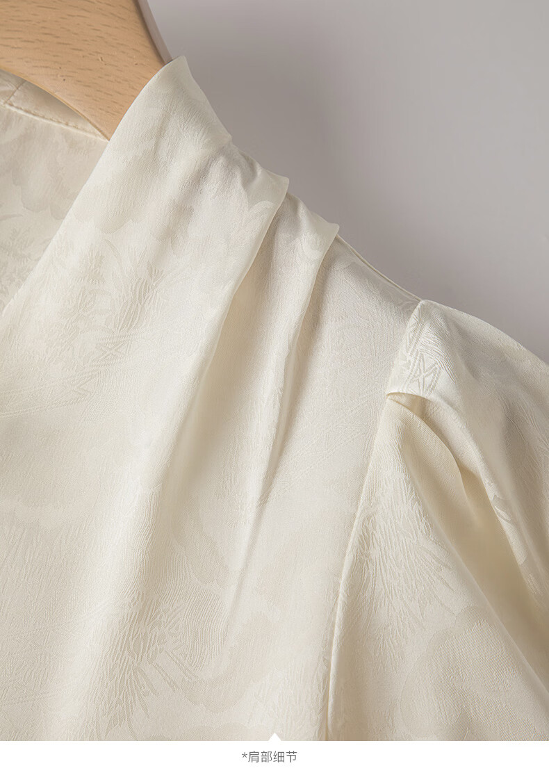 晚白【新品】2026年春款时尚优雅V领衬衣提花缎面细腻垂顺舒适衬衫女 杏色 S