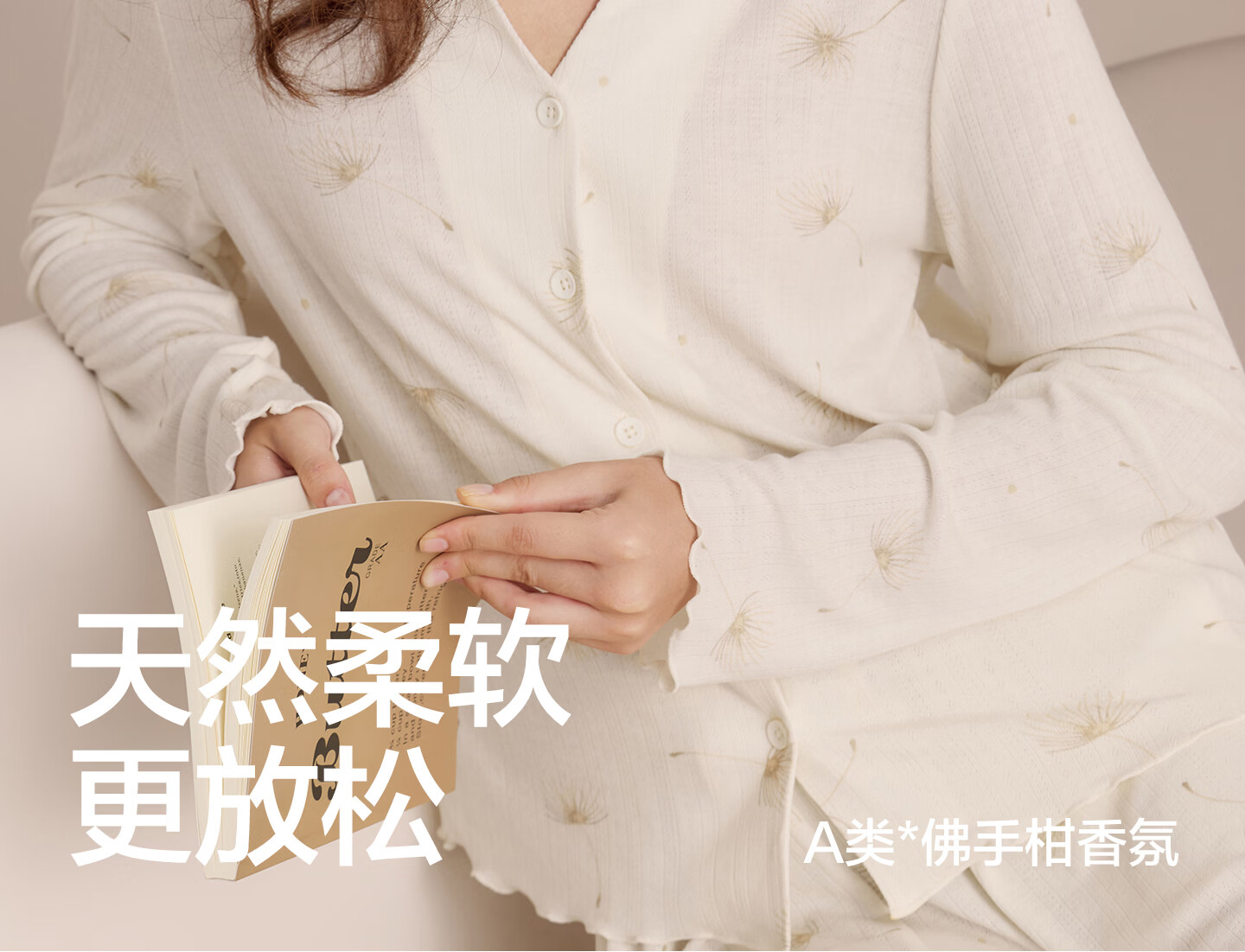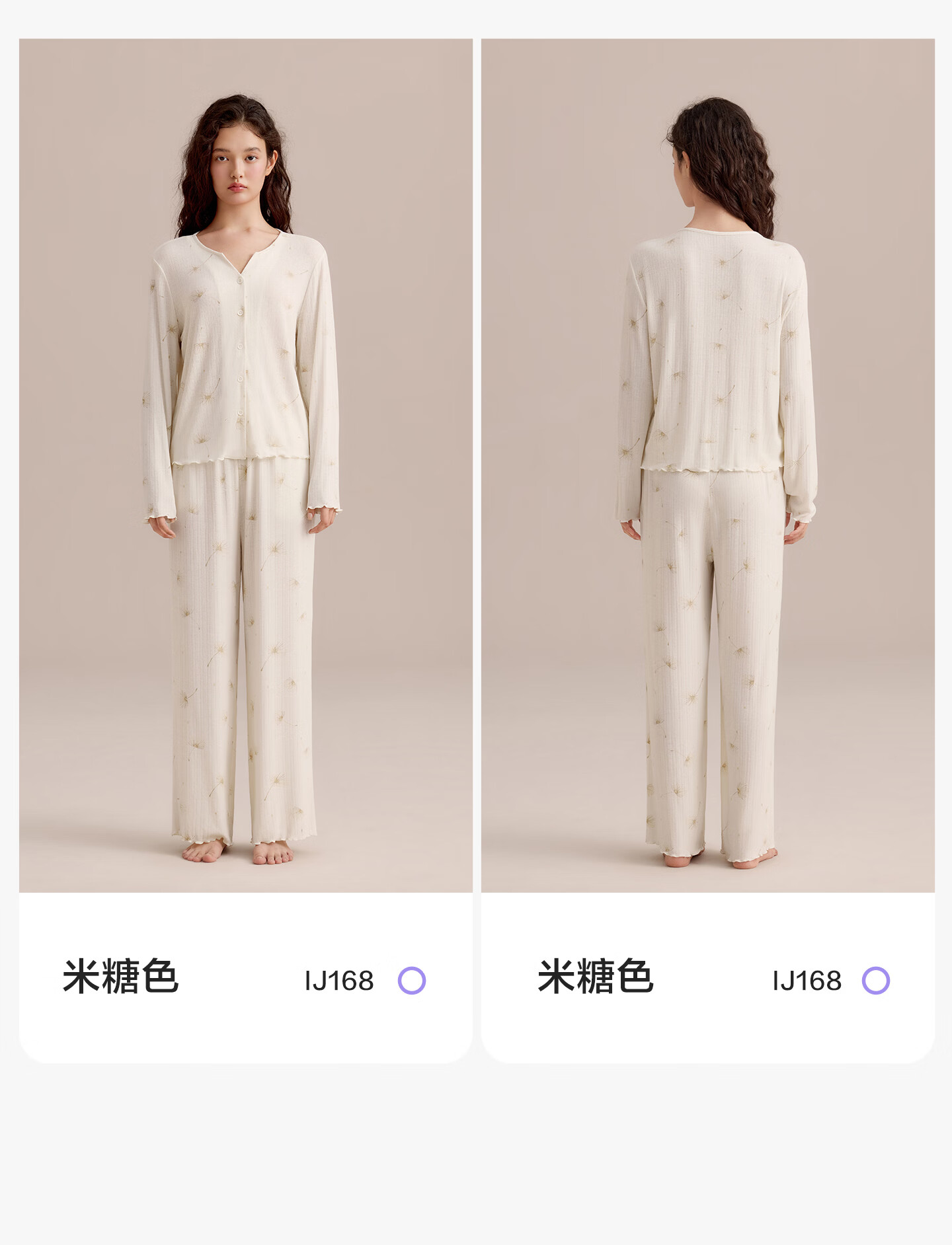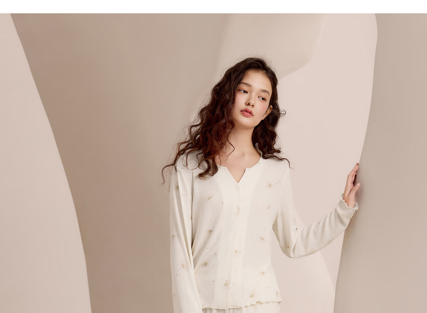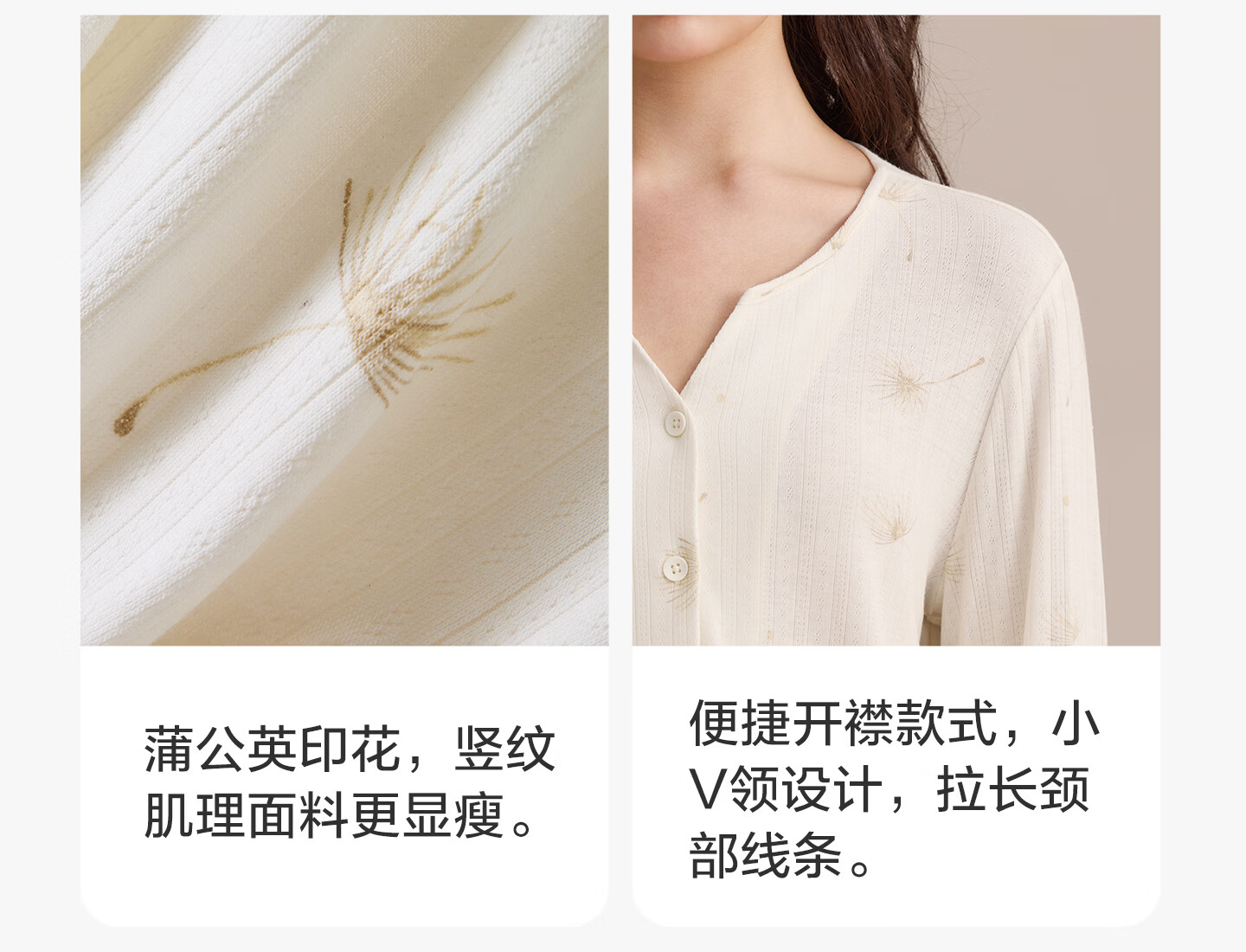 红豆(Hodo)女士长袖睡衣春夏香氛疗愈V领莫代尔印花新款A类可外穿休闲家居服 米糖色 L (165)